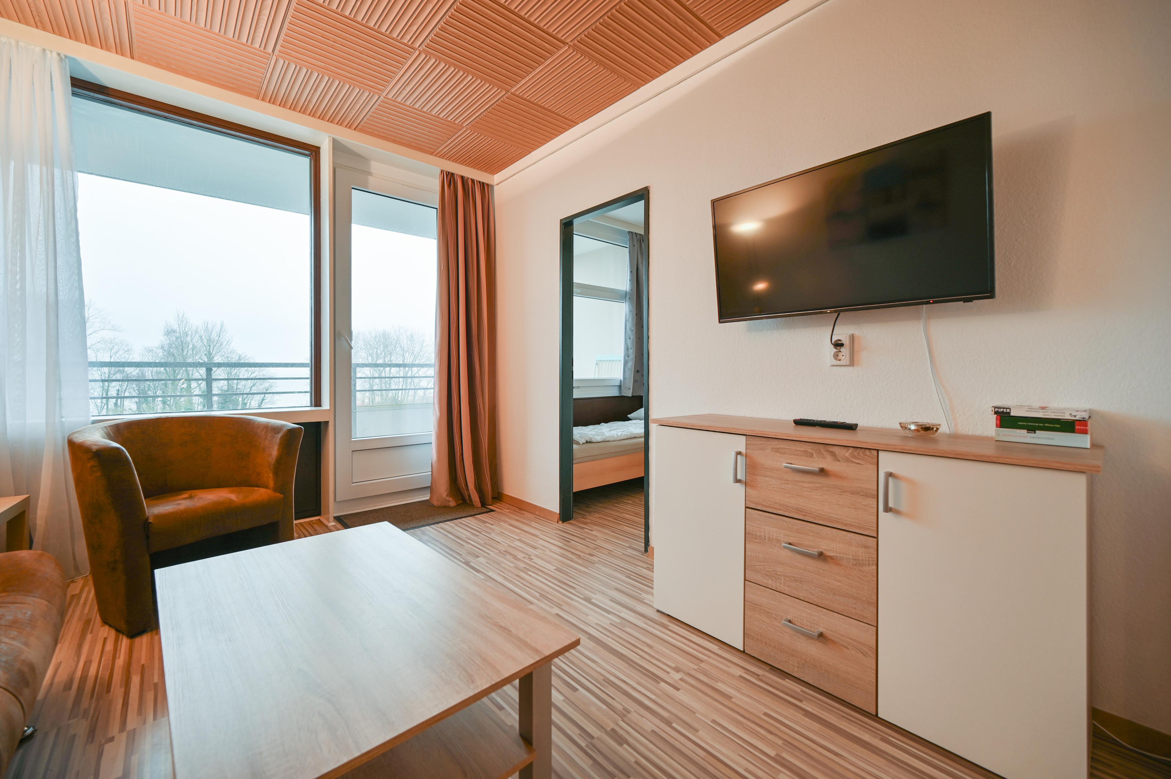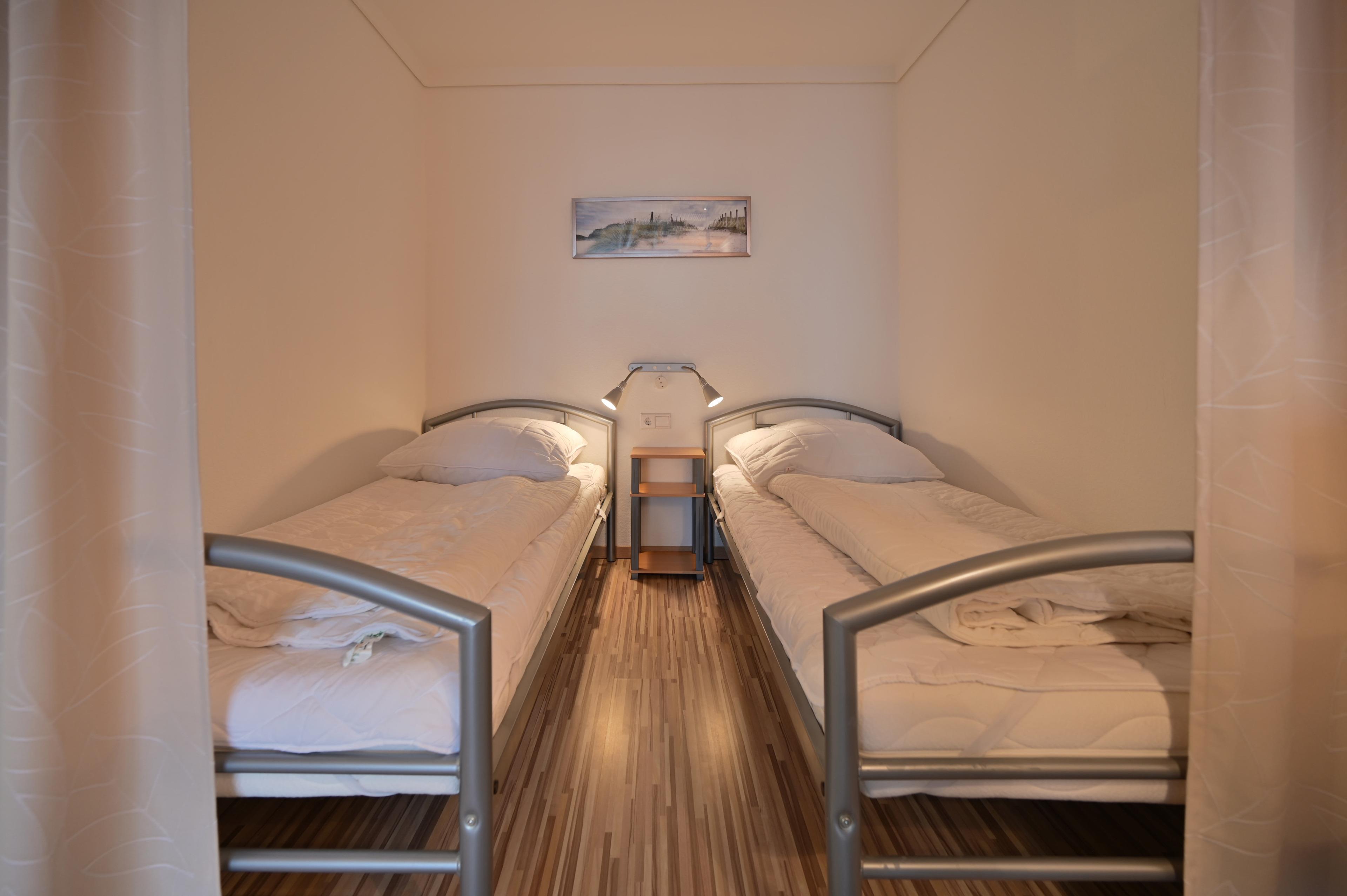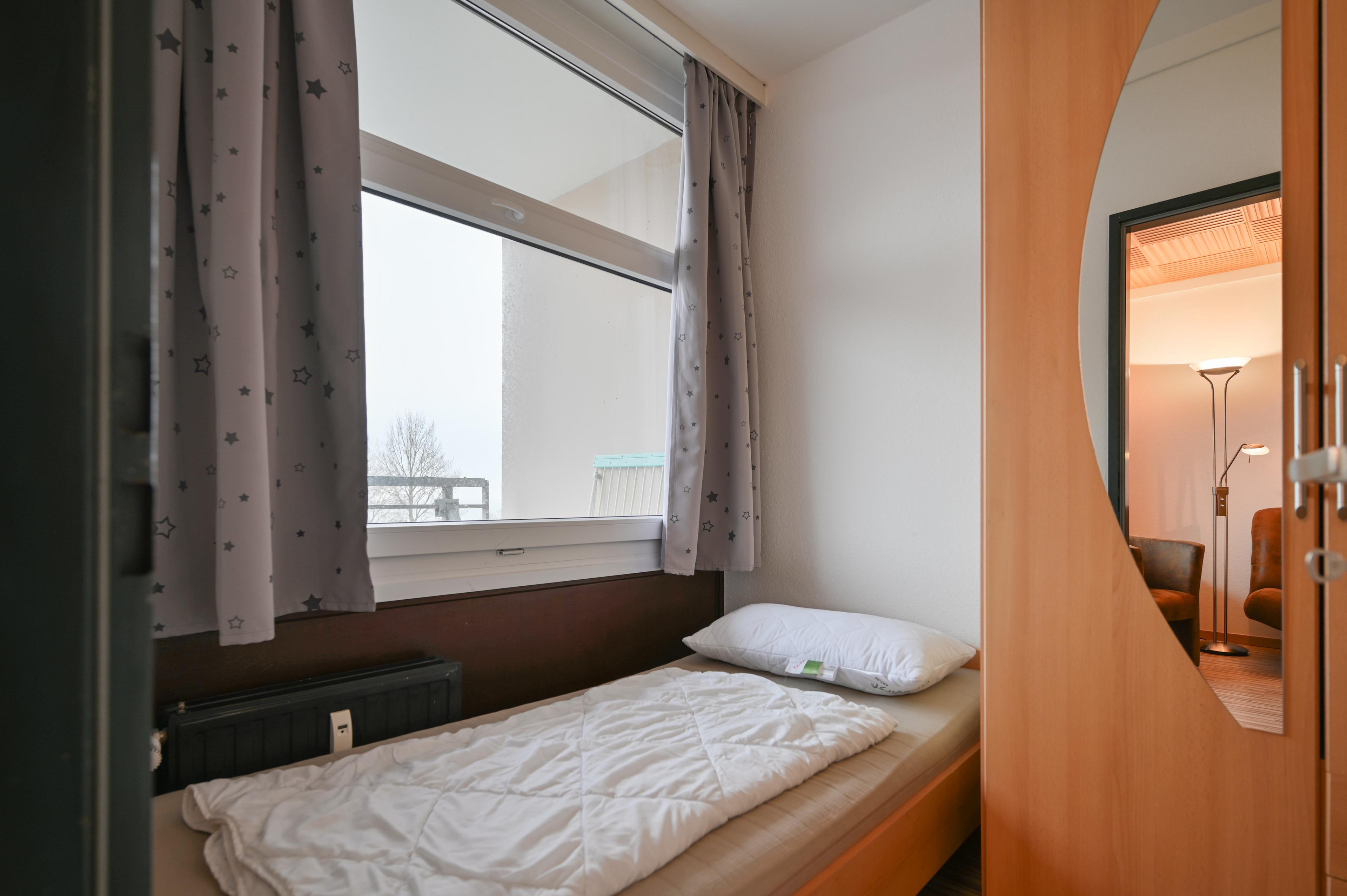 Die Ferienwohnung verfügt über einen kombinierten Wohn- Schlafraum mit 2 feststehenden Einzelbetten, die durch einen Vorhang vom Wohnbereich abgetrennt werden können.