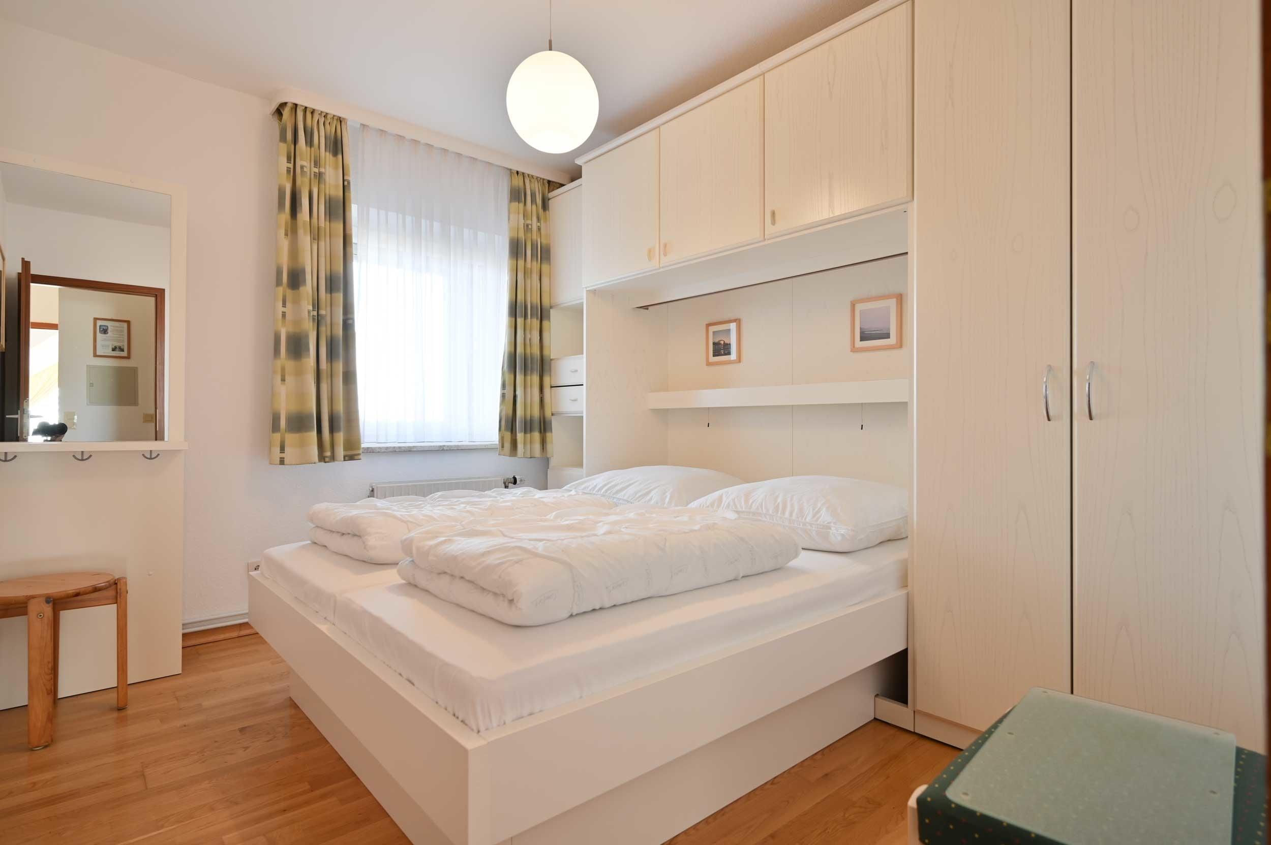Die Wohnung bietet ein separates Schlafzimmer, das mit einem Ehebett für zwei Personen ausgestattet ist (1,60×2,00m). Die Matratzen wurden im Februar 2025 ausgetauscht.
