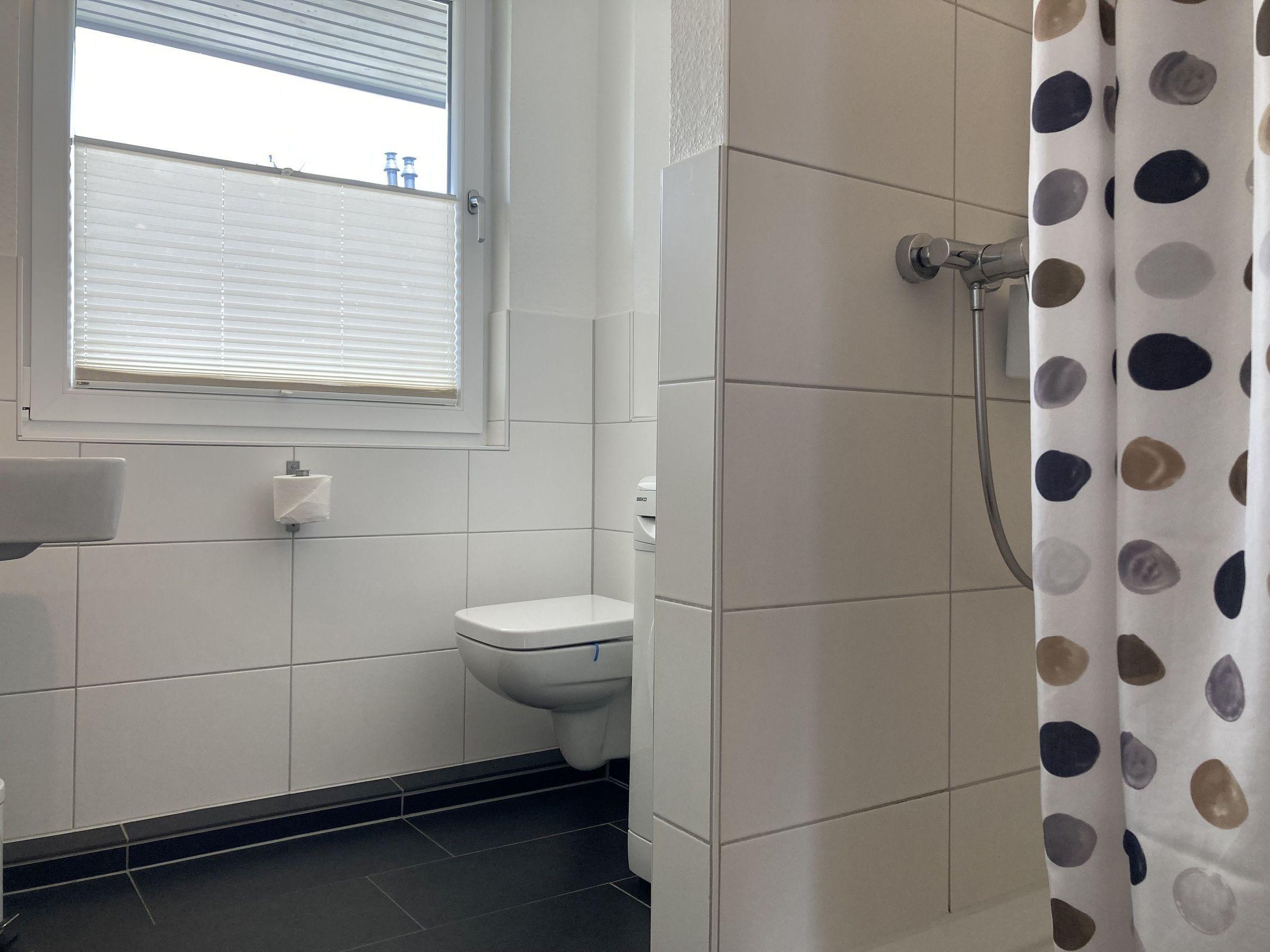 - tageslichthelles Badezimmer mit Dusche, WC und Waschmaschine