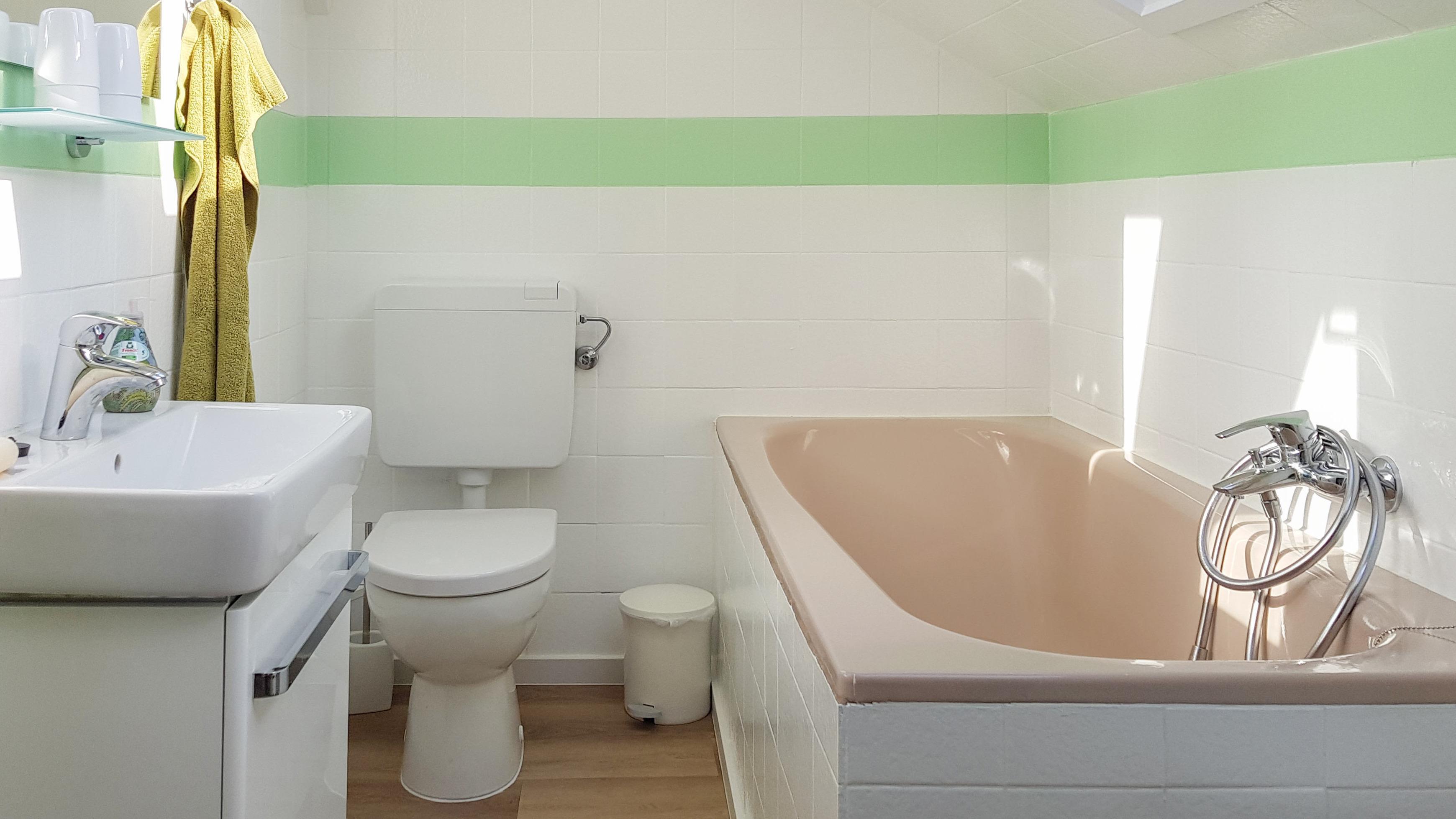 Das Badezimmer im Obergeschoss ist ausgestattet mit einem WC, einem Waschbecken und einer Badewanne. Bitte beachten Sie, dass die Badewanne unter einer Dachschräge steht, was bedeutet, dass Duschen nur im Sitzen möglich ist. Der Einstieg in die Badewanne ist entsprechend etwas höher.