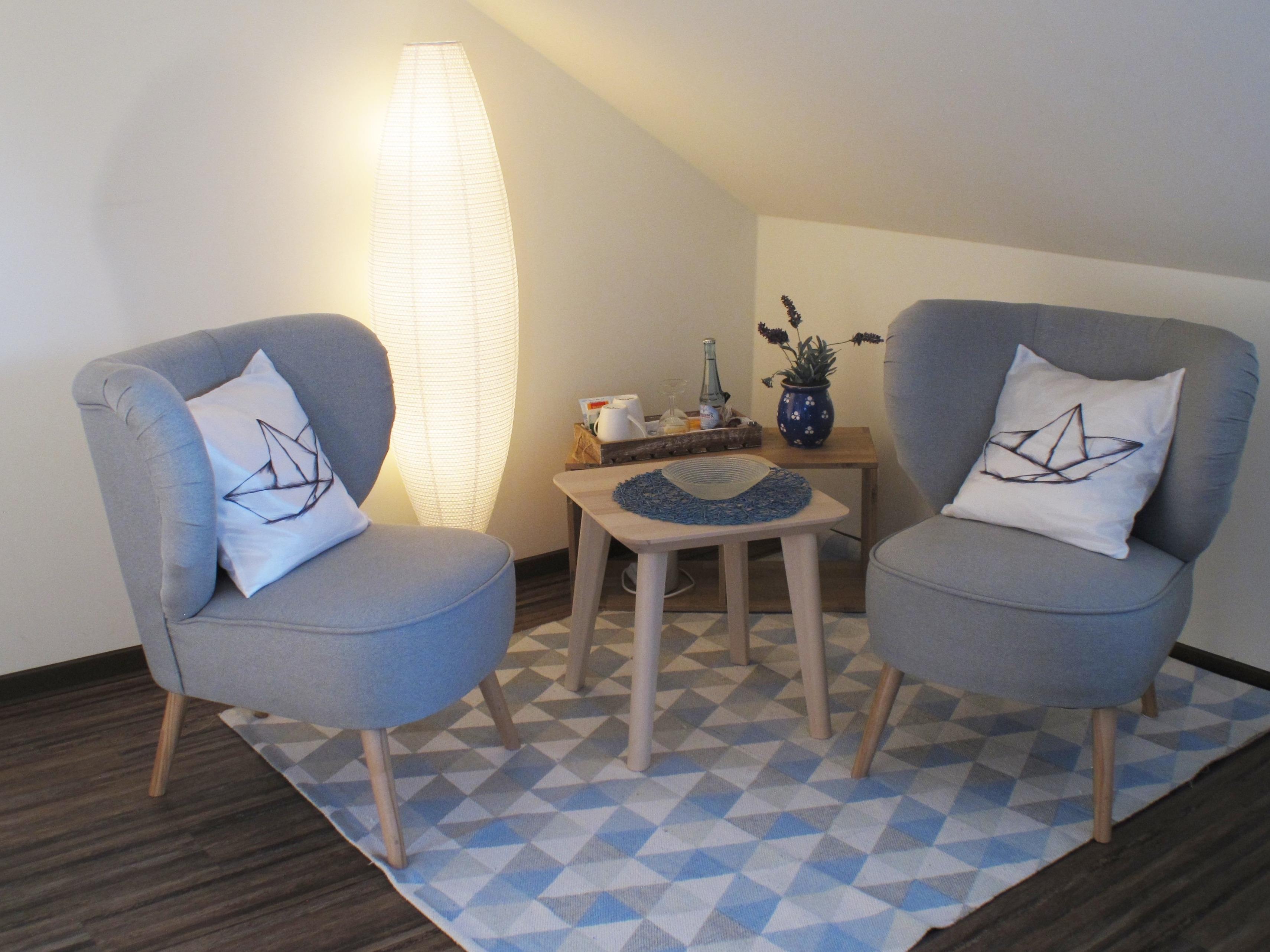 einer Sitzgruppe oder Couch mit Tisch und großen Boxspringbetten,