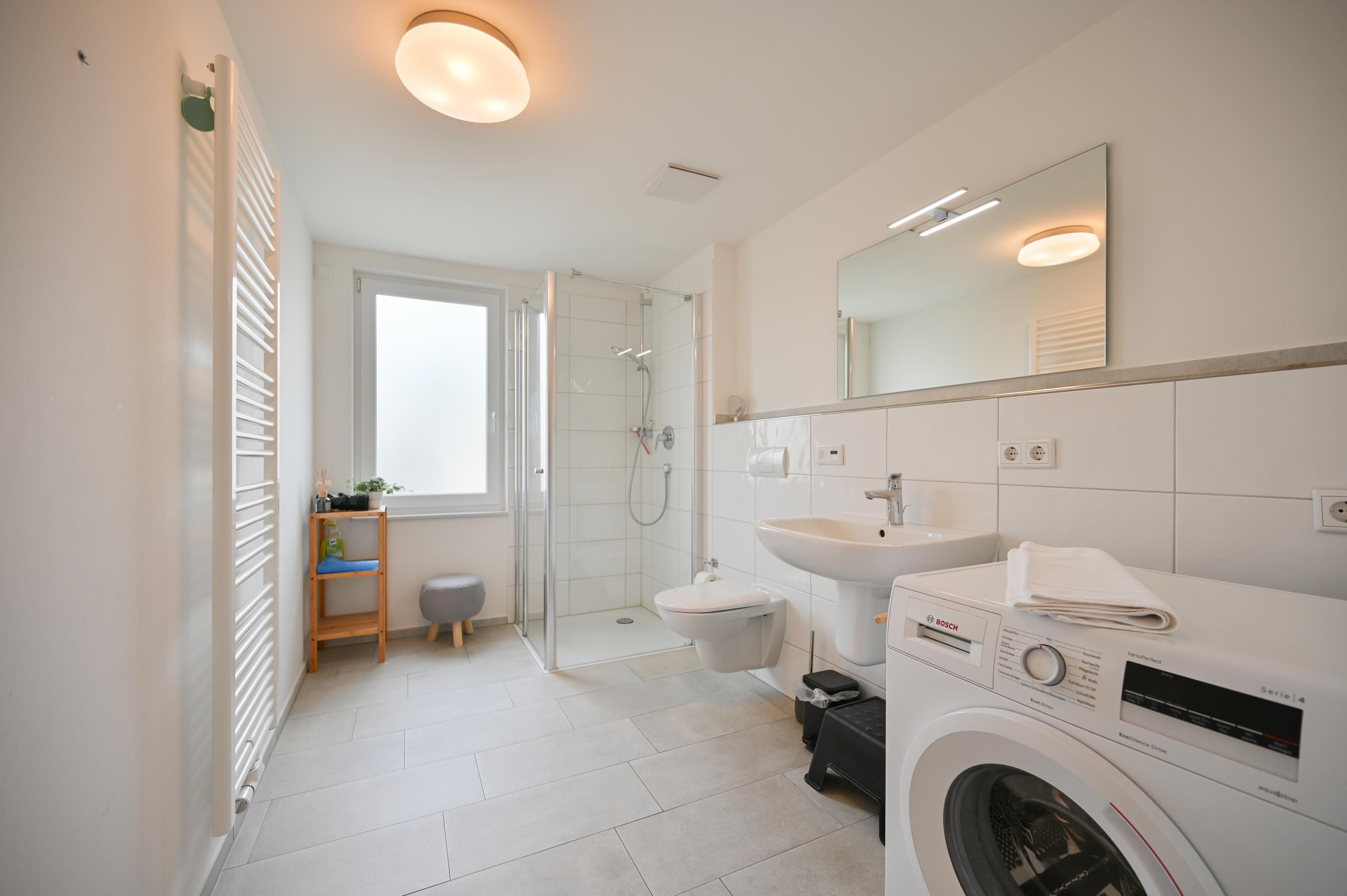 Das moderne Badezimmer überzeugt mit einer großen Dusche, einem WC, einem Waschtisch sowie einem Handtuchwärmer. Eine Waschmaschine und ein Außenfenster bieten zusätzlichen Komfort.