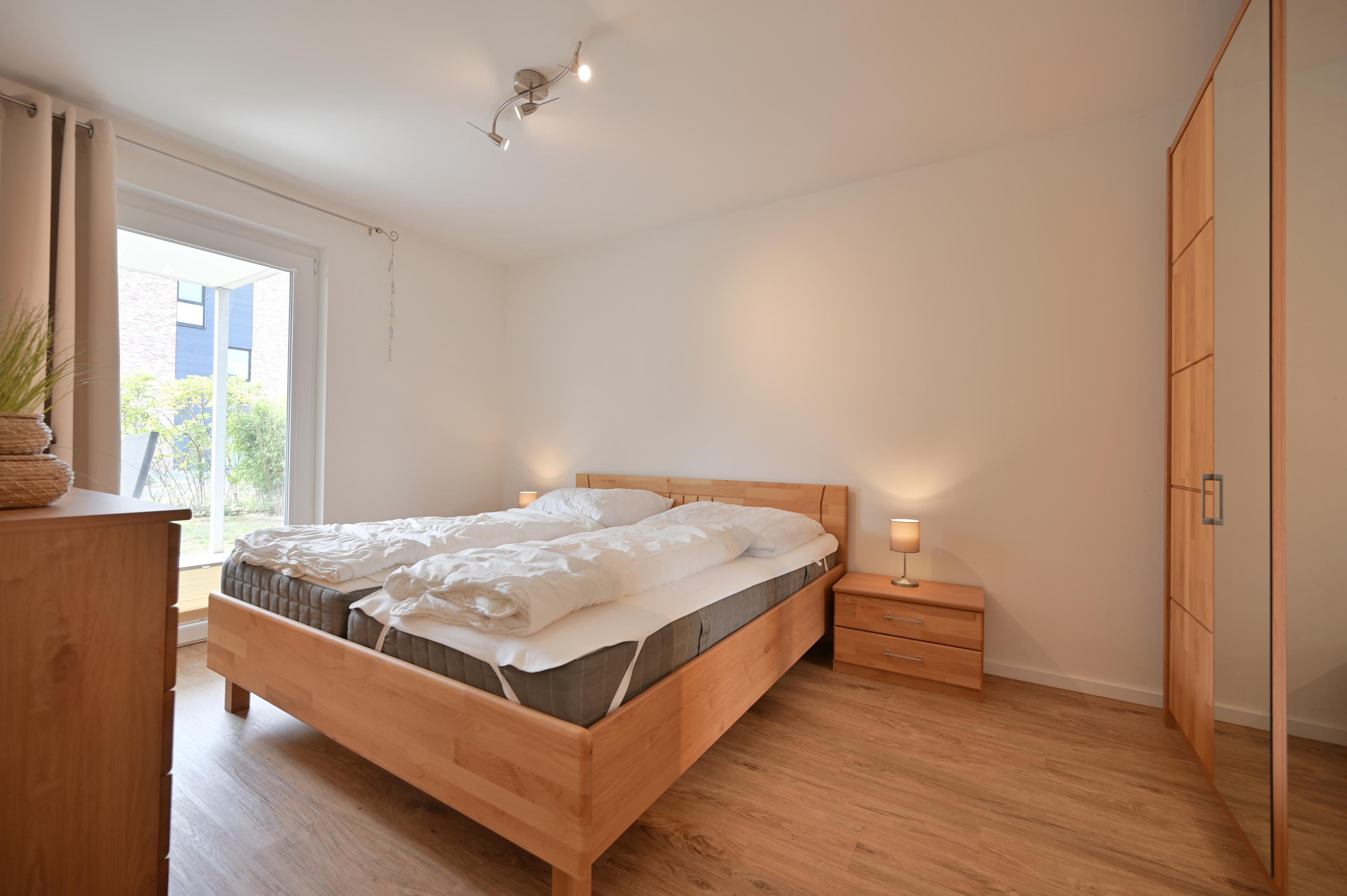 Sie verfügt über zwei liebevoll eingerichtete Schlafzimmer: Eines mit einem gemütlichen Doppelbett, einer geräumigen Kommode, einem großen Kleiderschrank und praktischen Nachttischen mit Leseleuchten.
