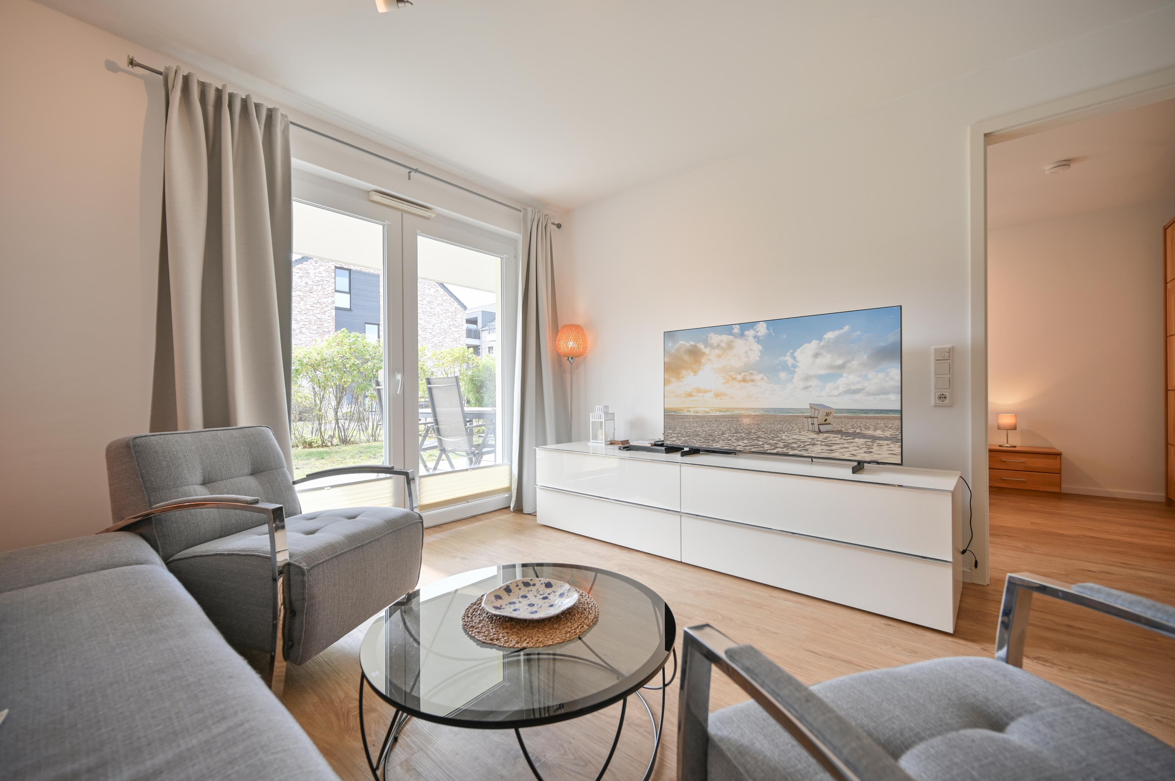 Das Wohnzimmer ist stilvoll und gemütlich eingerichtet und lädt mit einem schönem Sofa, zwei Sesseln und einem modernen Flachbild-TV zum Entspannen ein. Der Essbereich bietet Platz für vier Personen und grenzt an die voll ausgestattete Küchenzeile, die alles bietet, was Sie für einen gelungenen Urlaub an der Ostsee benötigen.