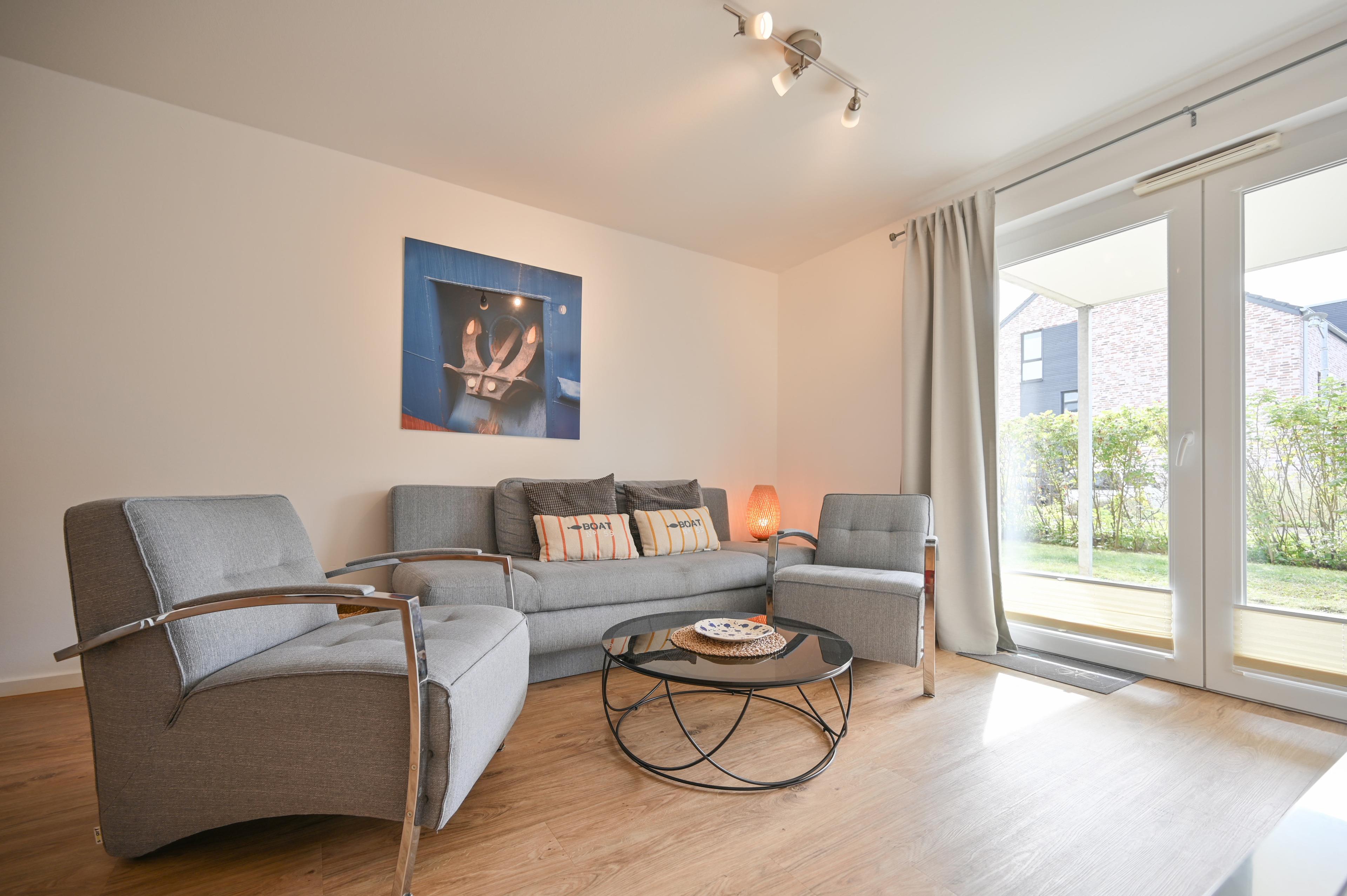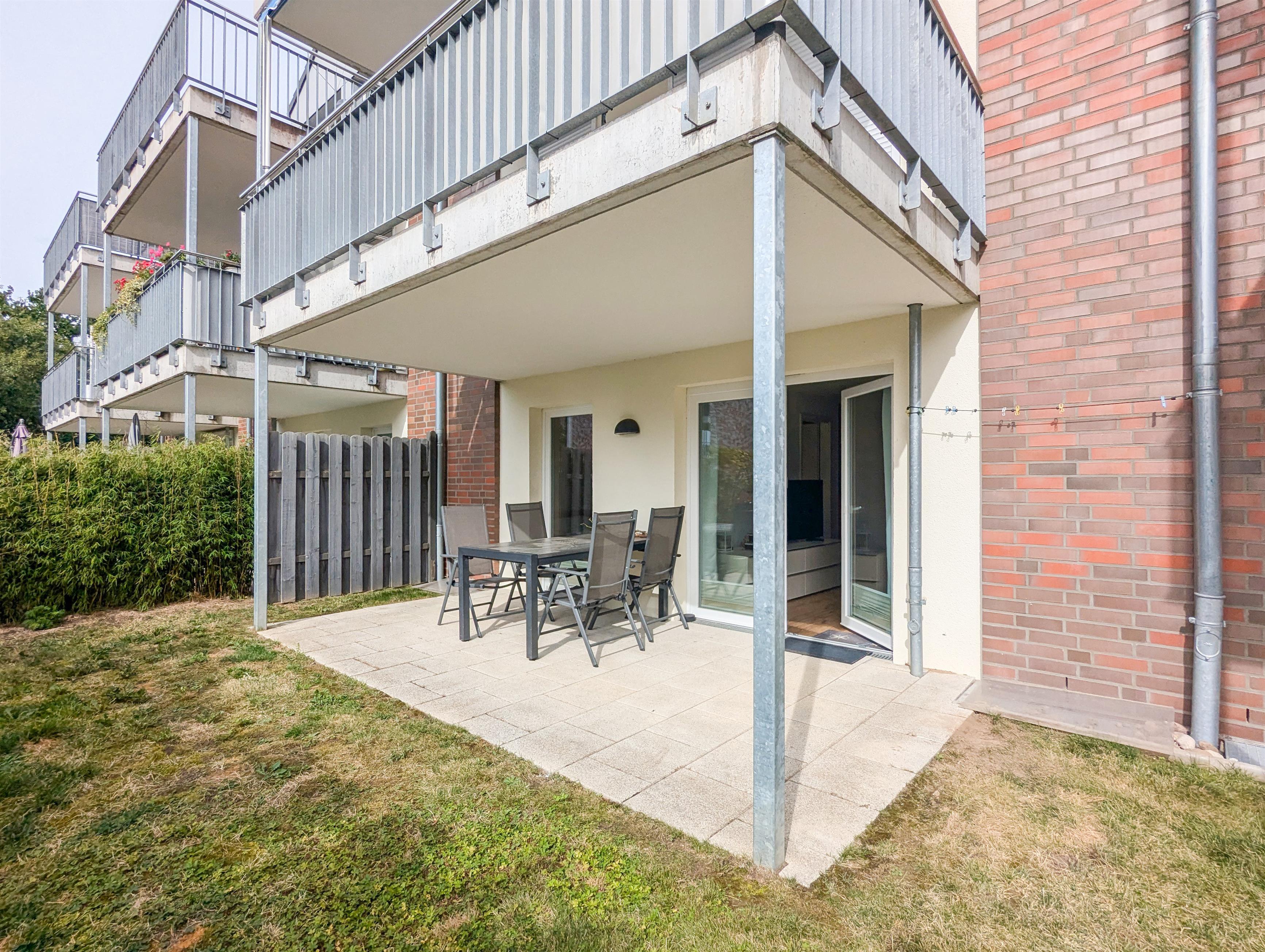 Genießen Sie die sonnigen Tage auf der möblierten Terrasse mit einem kleinen, gepflegten Rasenteil - der perfekte Ort für ein Frühstück im Freien oder zum Entspannen nach einem Tag am Strand, den Sie in wenigen Gehminuten erreichen können. Für den Weg zum Strand steht Ihnen ein Bollerwagen zur Verfügung.