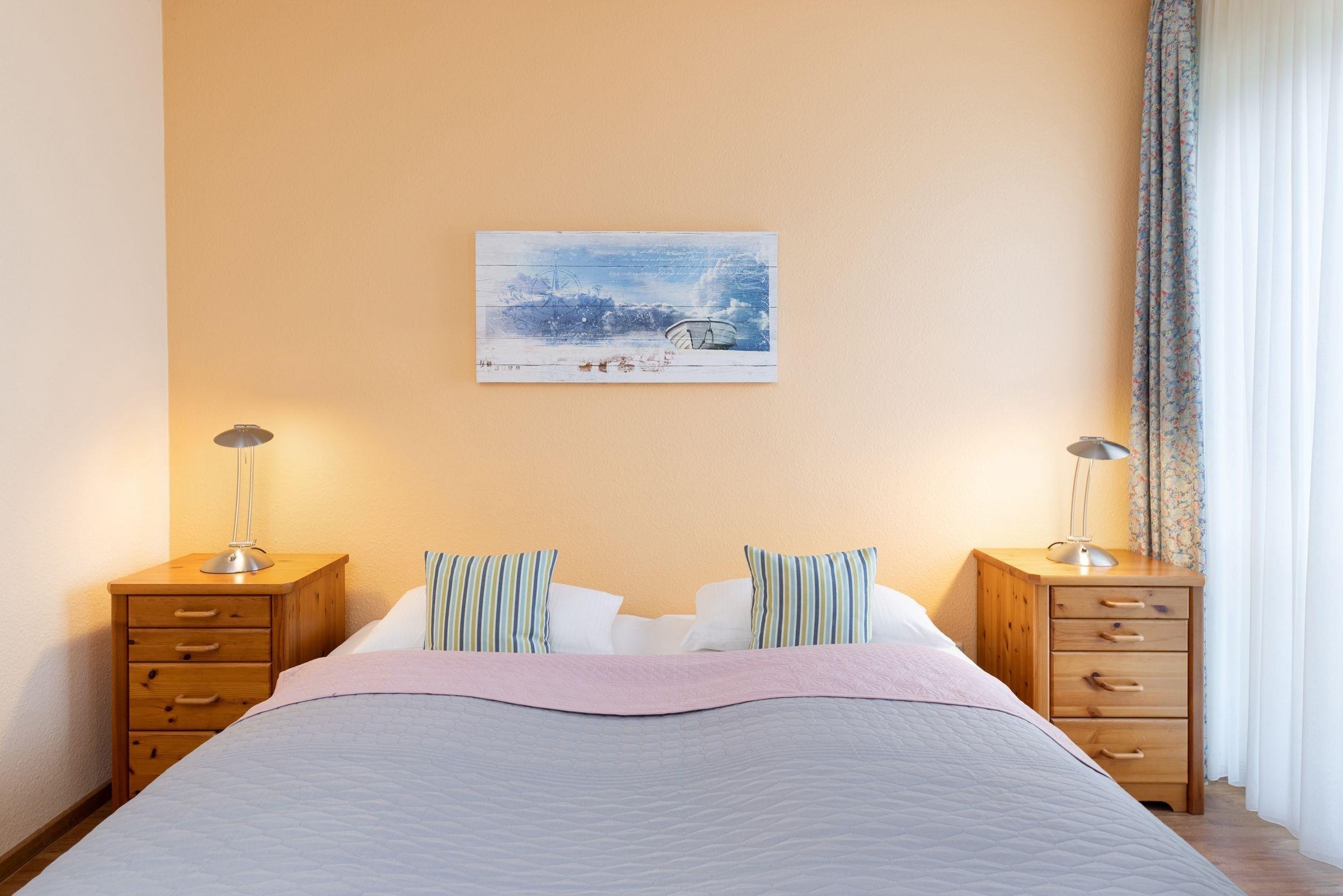 Schlafzimmer: 1 Doppelbett (2x 90x200 cm), Kleiderschrank, Verdunkelung (Vorhänge)