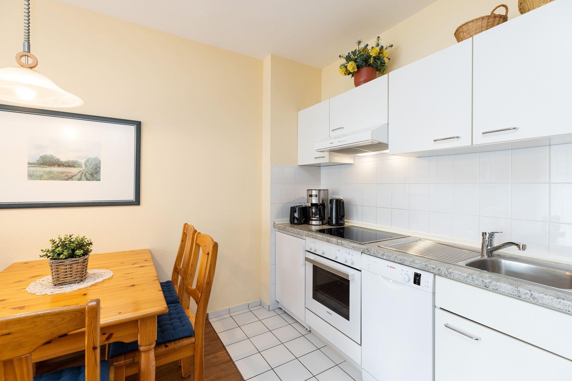 Ankommen und Wohlfühlen. Über ein paar Stufen erreichen Sie die gepflegte Ferienunterkunft im Wohnpark Kaiserhof – nur rund 65 Meter vom Ostseestrand entfernt. Ein kuscheliges Sofa sowie zwei bequeme Sessel laden Sie im Wohn/Essbereich zum Entspannen vor dem großen TV-Gerät ein. Gleich daneben haben Sie Zutritt auf die möblierte Terrasse. Diese ist zur Ostsee hin ausgerichtet und bietet einen schönen Blick ins Grüne. Sicher hören Sie von hier aus das Meer rauschen und können Ihre freie Zeit draußen wunderbar und bestens geschützt genießen. Die gut ausgestattete Küche mit Spülmaschine ist in den Wohnraum integriert. Ihre selbst zubereiteten Speisen können Sie in der kleinen Essecke zu sich nehmen. Nach einem tollen Tag an der Küste haben Sie für die Nacht die Auswahl: Zum einen lässt sich das Sofa im Wohnbereich in ein Doppelbett (ca. 150x200 cm) verwandeln. Zum anderen befinden sich im schicken separaten Schlafzimmer 2 Einzelbetten (je 90x200cm), die zu einem Doppelbett zusammengeschoben sind. Wir wünschen zauberhafte Träume. Das großzügige Bad mit Tageslicht verspricht einen angenehmen Start in den nächsten Urlaubstag.