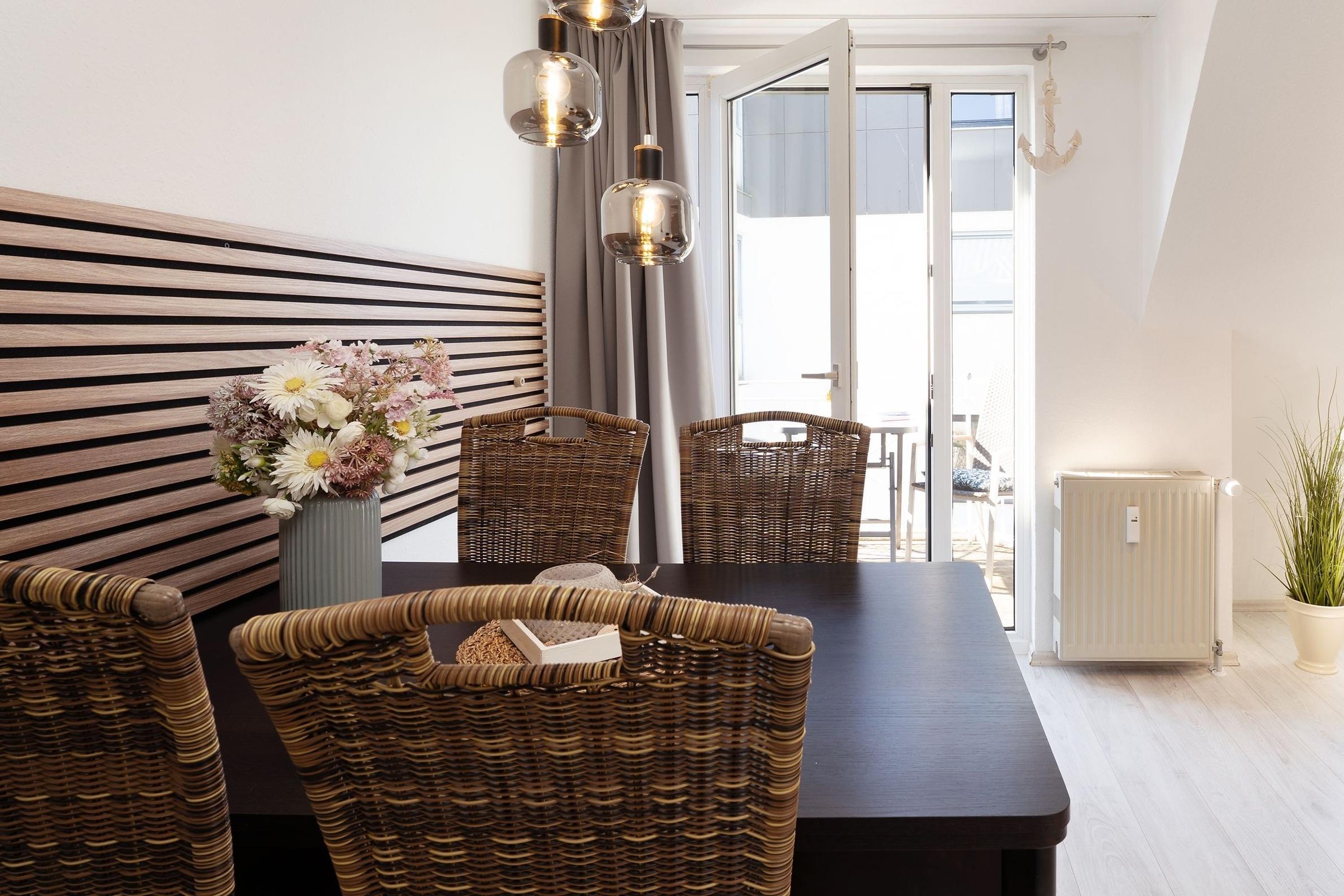 Sie möchten einfach mal abschalten und die Seele baumeln lassen? Dann sind Sie in dieser zauberhaften Ferienwohnung Moby Dick im Haus Gorch Fock genau richtig. Die durchdachte Raumaufteilung sowie die liebevoll ausgesuchte Einrichtung machen das Objekt zu einem echten Schmuckstück. Der Wohn-/Ess-Bereich begrüßt Sie mit einer kuscheligen Sofa-Landschaft, die Dachschrägen sorgen dabei für ein gemütliches Ambiente. Hier können Sie kuschelige Abende vor dem TV-Gerät verbringen. Für die Nacht lässt sich das Sofa mit wenigen Handgriffen in ein Doppelbett (ca. 150x200 cm) verwandeln. Im selben Raum befindet sich auch eine helle, schicke Ess-Ecke. Hier können Sie Ihre Mahlzeiten genießen oder auch lustige Spiele-Abende veranstalten. Und Sie können von hier aus auch den möblierten Balkon betreten und in der Sonne sitzen. Die gut ausgestattete Küche mit Geschirrspüler befindet sich separat im Flurbereich und hat einen raffinierten Tresen, an dem Sie auch gut verweilen können. Im geräumigen Schafzimmer steht ein Doppelbett bereit, in dem Sie sicher traumhaft schlafen werden. Das moderne Duschbad mit Fenster lässt keine Wünsche offen. Eine lauschige Kaminecke im Gemeinschaftsraum des Hauses rundet das Angebot ab.