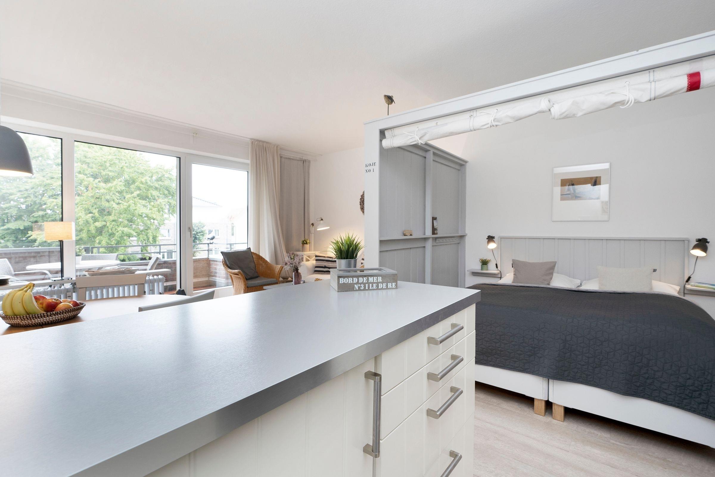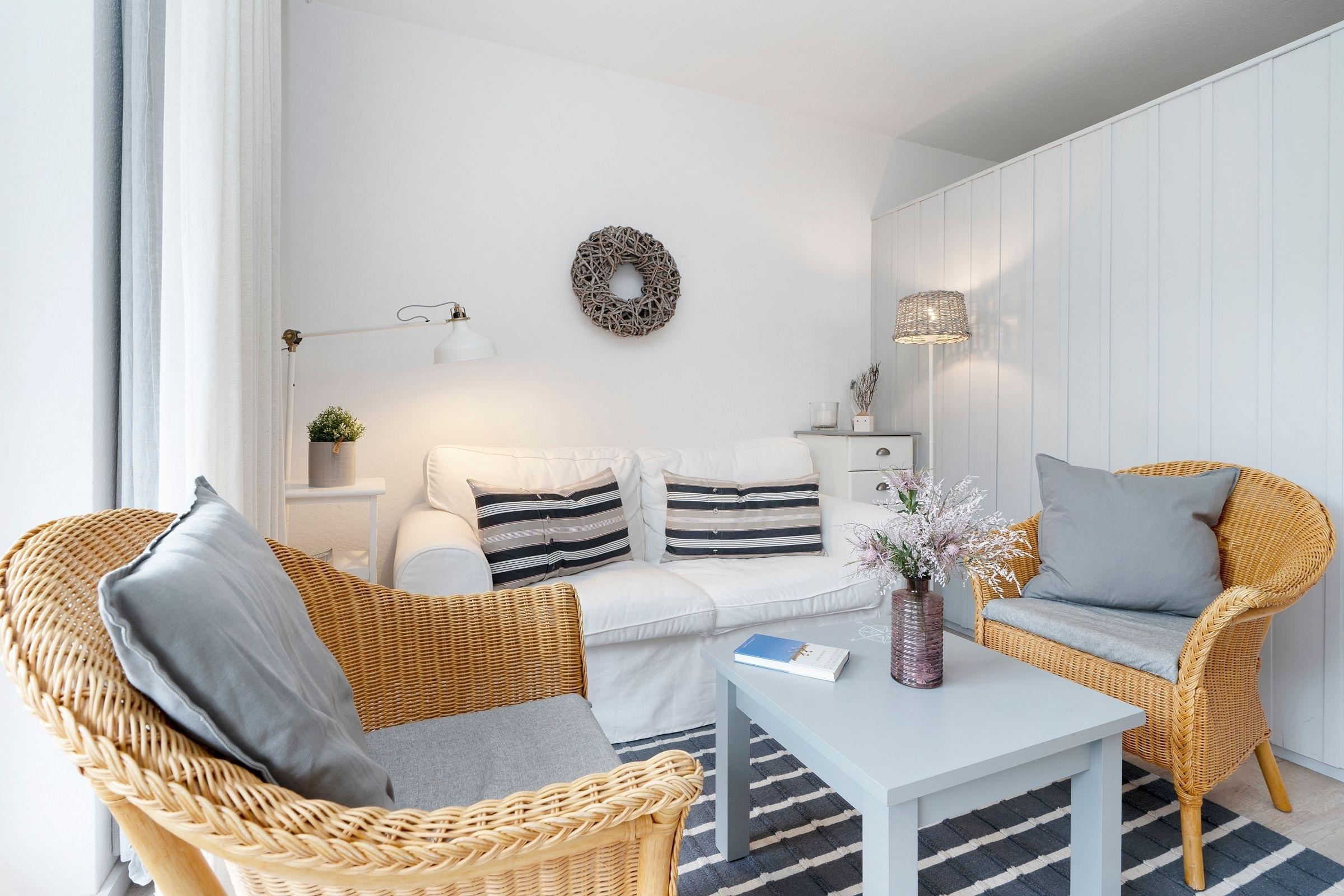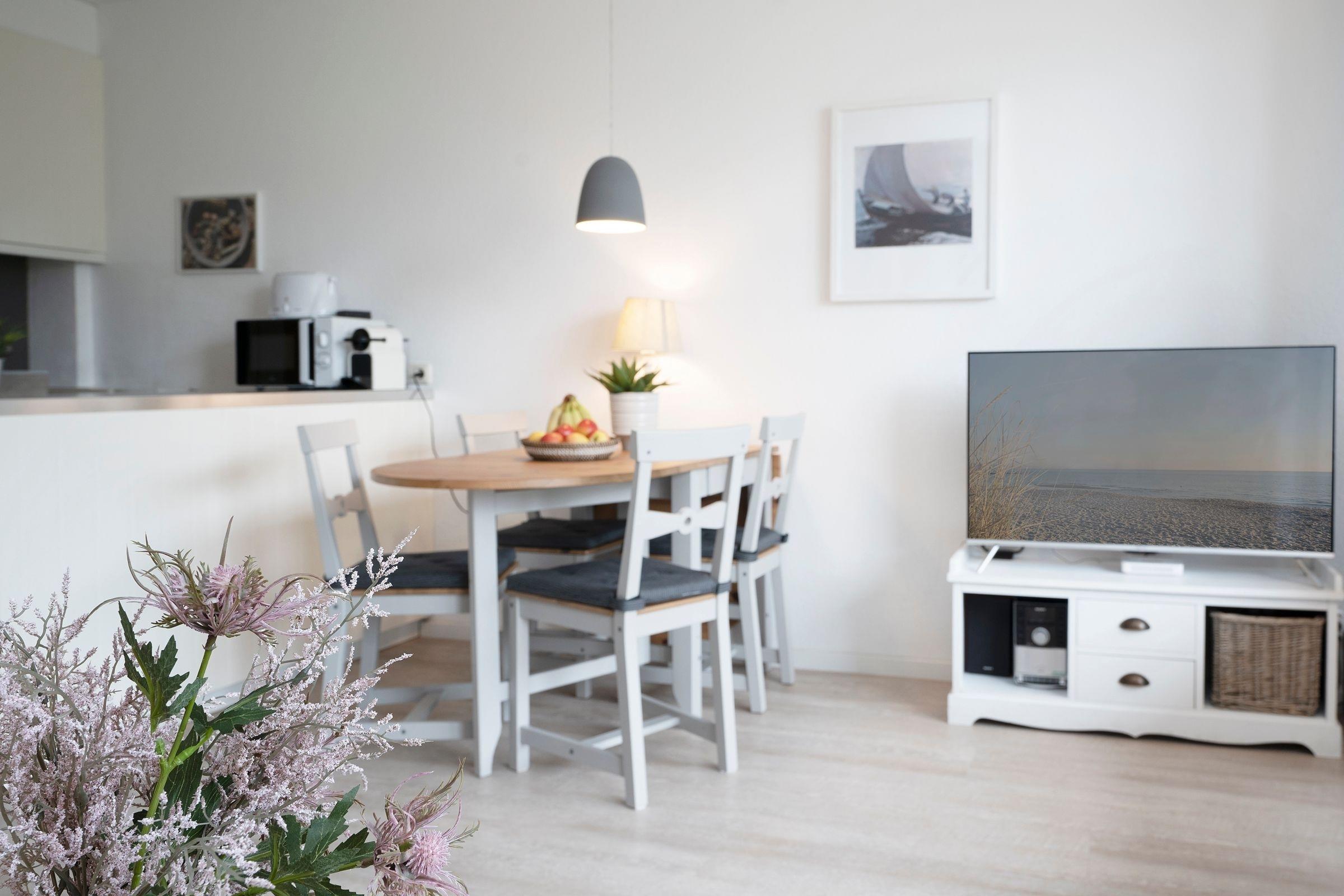 Verbringen Sie Ihre Urlaubstage in dieser strandnahen Wohnanlage. Die liebevoll gestaltete Wohnung begrüßt Sie mit einem großzügigen Wohn- und Essbereich mit gemütlicher Sofaecke, der zu geselligen Koch- und Spieleabenden einlädt. Ein Flachbild-TV sowie eine Stereoanlage sorgen für unterhaltsame Stunden. Die offen gestaltete Küche ist mit Ceranfeld, Backofen, Geschirrspüler, Kaffeemaschine, Toaster etc. voll ausgestattet. Praktisch - nach einem ereignisreichen Urlaubstag können Sie direkt in das maritime Kojenbett (160x200 cm) fallen. Auf dem sonnigen Balkon mit Südausrichtung und schönem Gartenblick lädt zum Verweilen ein - hier können Sie die Sonne bis in die Abendstunden hinein genießen. Das separate Schlafzimmer ist mit 2 bequemen Einzelbetten (je ca. 90x200 cm) ausgestattet. Das helle, moderne Duschbad mit WC rundet das Angebot ab und sorgt für einen frischen Start in Ihre Urlaubstage.