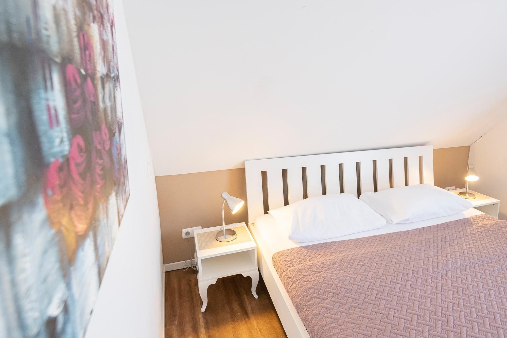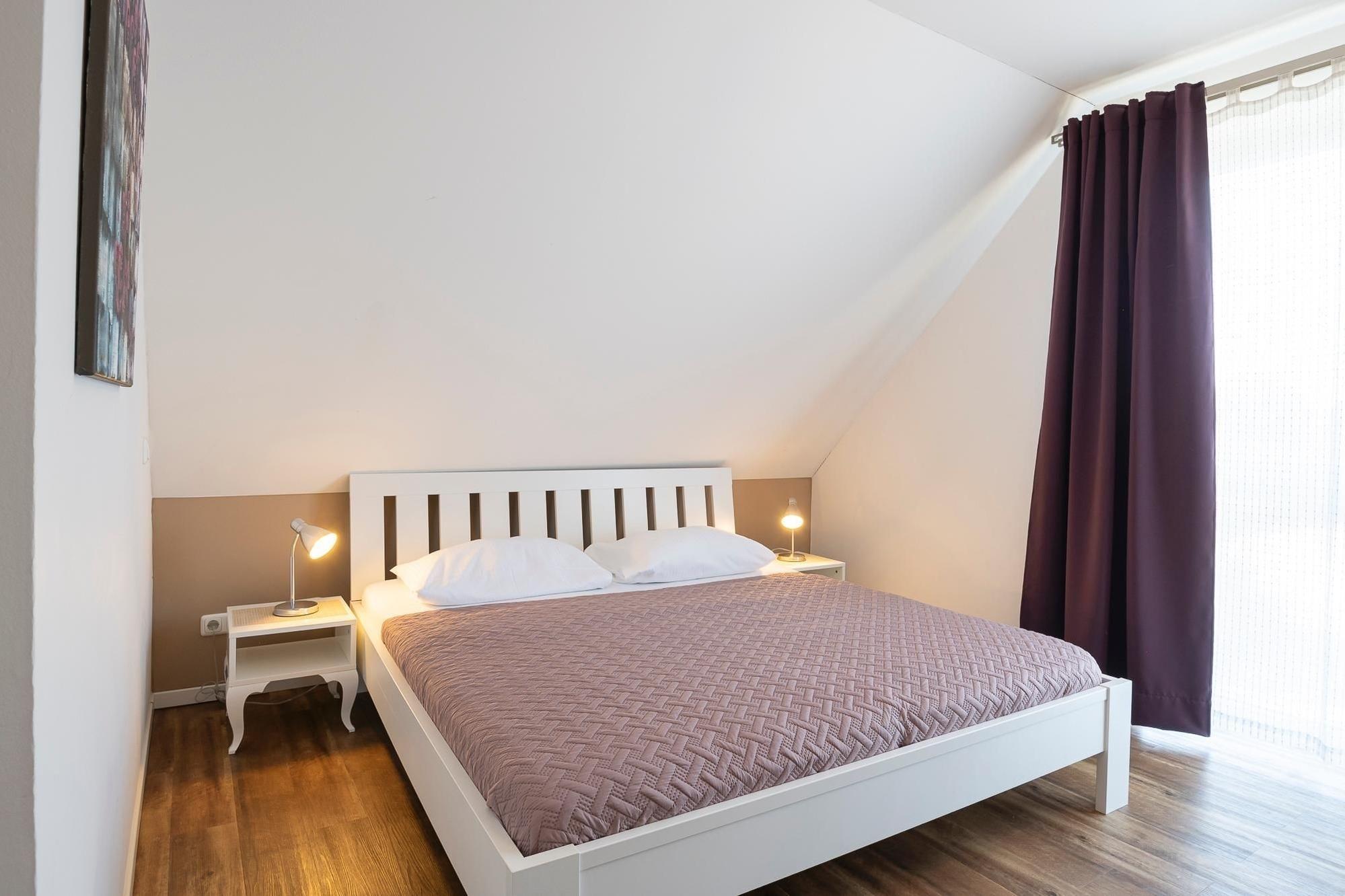 Schlafzimmer 1: im Dachgeschoss, 1 Doppelbett (2x 90x200 cm), TV, 1 Kinderbett (80x130 cm)