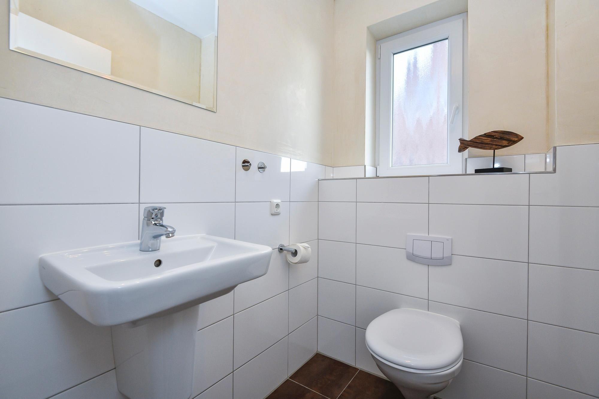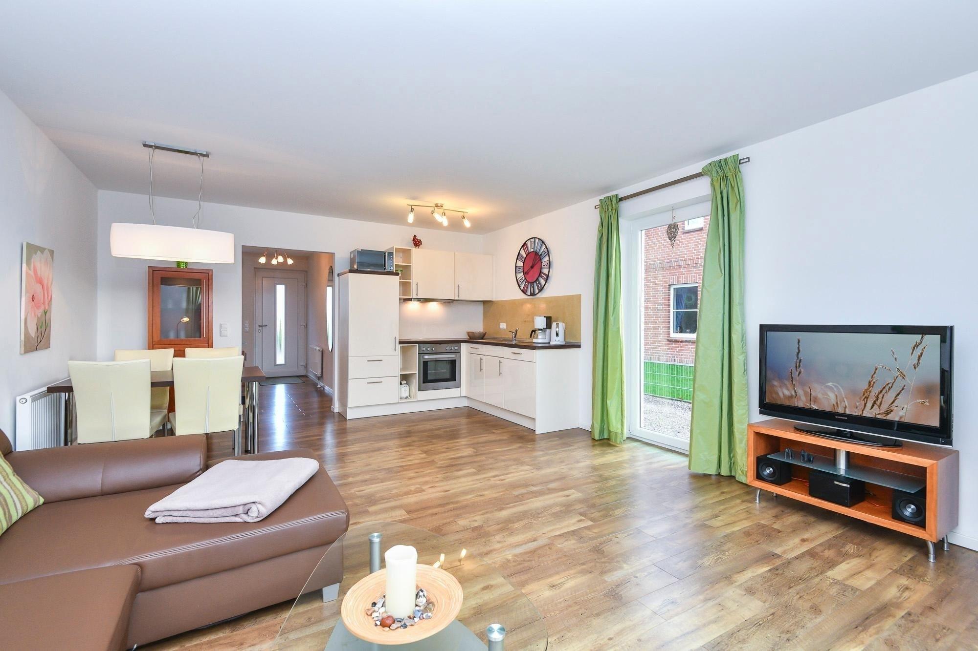 Ankommen und glücklich sein. Das Haus Glücksmomente, in dem sich die Doppelhaushälfte Jelena befindet, schenkt seinen Bewohnern eine Extra-Portion Glück für den Urlaub und lässt sicher keine Wünsche offen. Im hellen Wohnbereich im Erdgeschoss lädt Sie eine komfortable Sofa-Landschaft sowie ein Relaxsessel mit Hocker zum Träumen, Entspannen und Fernsehen ein. Direkt hier haben Sie auch Zugang auf die große möblierte Süd-Terrasse – das wird sicher Ihr Lieblingsplatz. Hier kann man auf der Liege herrlich die Sonne genießen oder auch im Gemeinschaftsgarten eine Runde Federball spielen. Abends sorgt ein Gemeinschaftsgrill für kulinarische Abwechslung. Zurück im Wohnbereich: Hier steht Ihnen eine stylische Ess-Ecke zu Verfügung. Wie wäre es hier mit lustigen Spiele-Abenden? In der offenen, hochwertigen Küche verbringen Hobby-Köche sicher gern ihre Zeit und testen neue Rezepte aus. Im Anschluss übernimmt ein Geschirrspüler den Abwasch. Ein modernes Gäste-WC mit Fenster finden Sie ebenfalls im Erdgeschoss. Das Obergeschoss verfügt über ein modernes Duschbad mit Dachfenster, Handtuchwärmer und Waschmaschine. Des Weiteren finden Sie hier 2 Schlafräume: ein Zimmer mit Doppelbett (2x 90x200 cm) und TV-Gerät und ein Zimmer mit 2 Einzelbetten (je 90x200 cm). Eine Fußbodenheizung im Wohnbereich und im Badezimmer sorgt für wohlige Wärme.