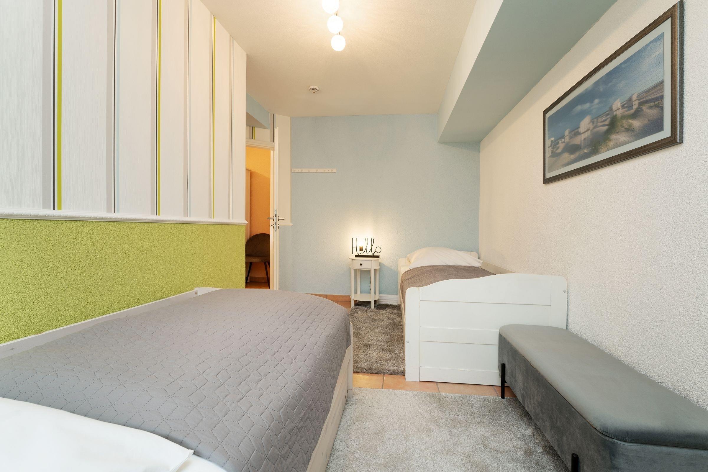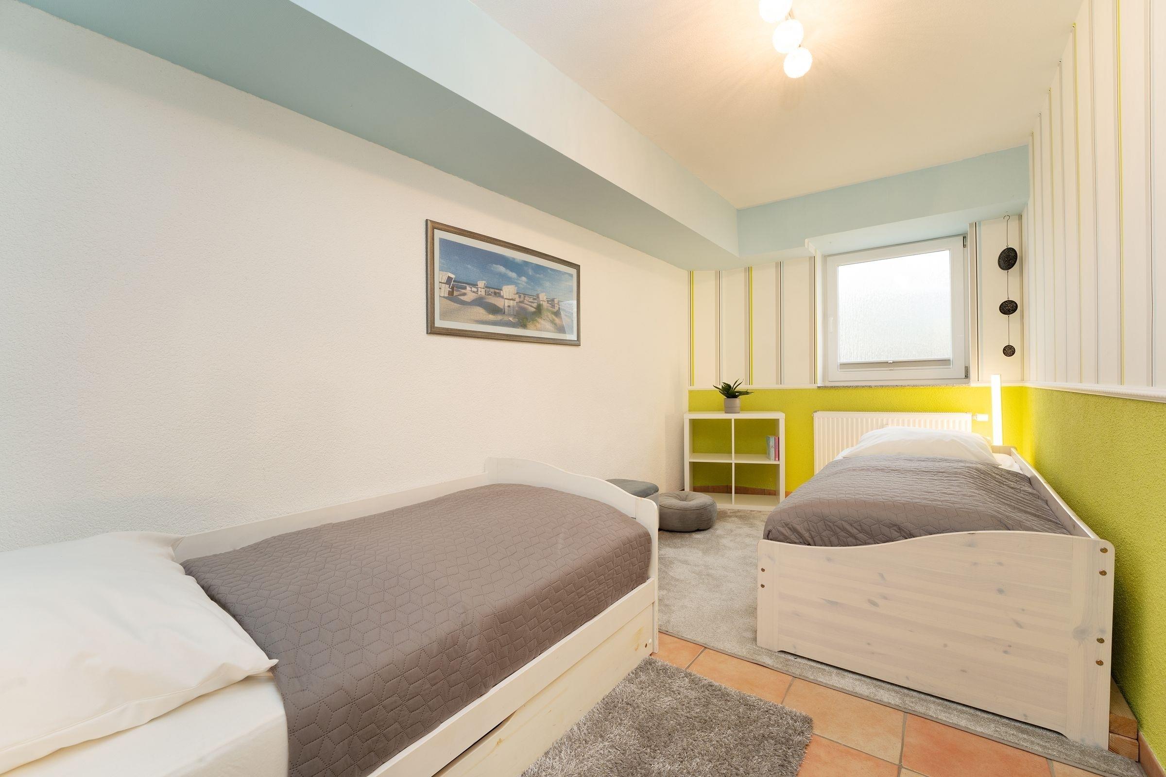 Eine Traumwohnung zum Wohlfühlen. Dieses wunderschöne Objekt befindet sich in der gepflegten Wohnanlage Villa Hoffnung und bietet Ihnen auf 2 Ebenen alles, was das Urlaubs-Herz begehrt. Die in grau-weiß gehaltene Einrichtung im Wohn-/Ess-Bereich wurde liebevoll ausgesucht und besticht durch ihre einzigartige Atmosphäre. Die komfortable Sofa-Landschaft verspricht entspannte Stunden vor dem TV-Gerät. Die offene Küche präsentiert sich um die Ecke in denselben Farben und bringt jeden Hobby-Koch zum Lächeln. Direkt davor steht eine gemütliche Essecke. Genießen Sie hier Ihre Speisen oder planen Sie hier Ihre Ausflüge entlang der schönen Ostseeküste. Das moderne Duschbad mit bodentiefer Dusche ist auch in grau-weiß gehalten. Sehr stilsicher. Nach einem erlebnisreichen Tag stehen Ihnen 2 Schlafräume zur Verfügung, diese erreichen Sie über 6 Treppenstufen hinunter: Ein Zimmer präsentiert sich im stylischen Rot und verfügt über ein Doppelbett. In dem anderen farbenfrohen Zimmer stehen 2 Einzelbetten. Hier werden Sie sicher wunderbar bunt träumen.