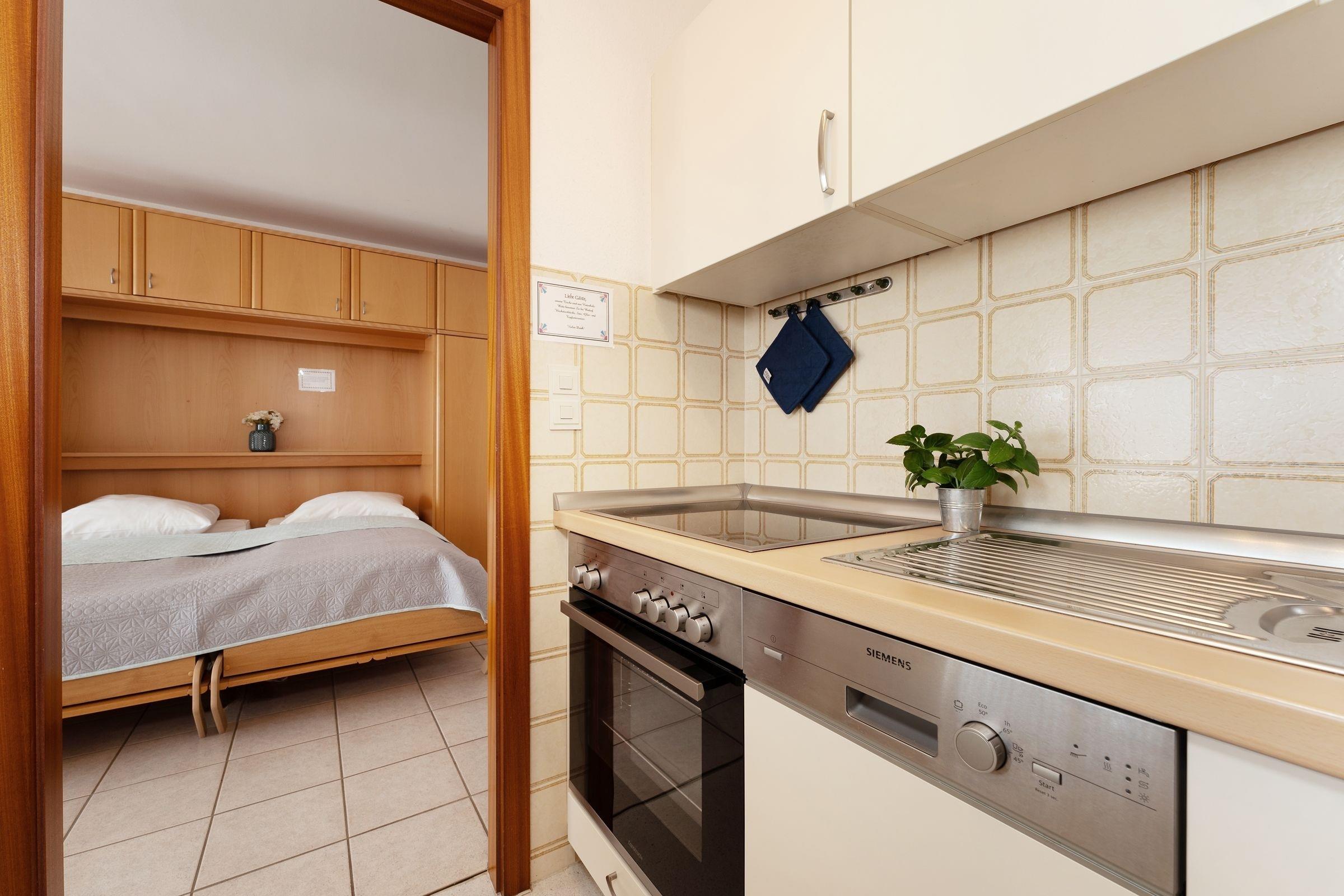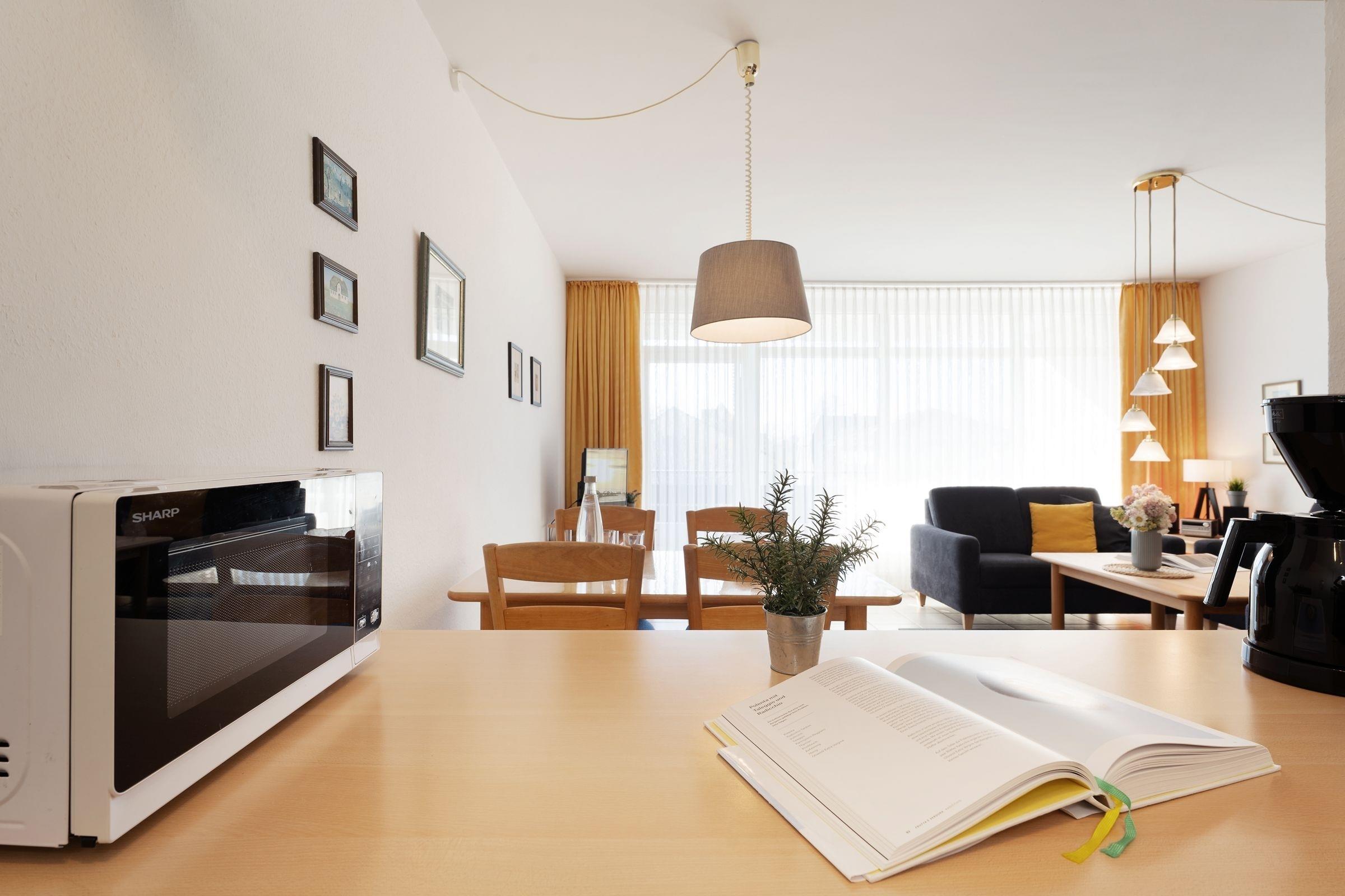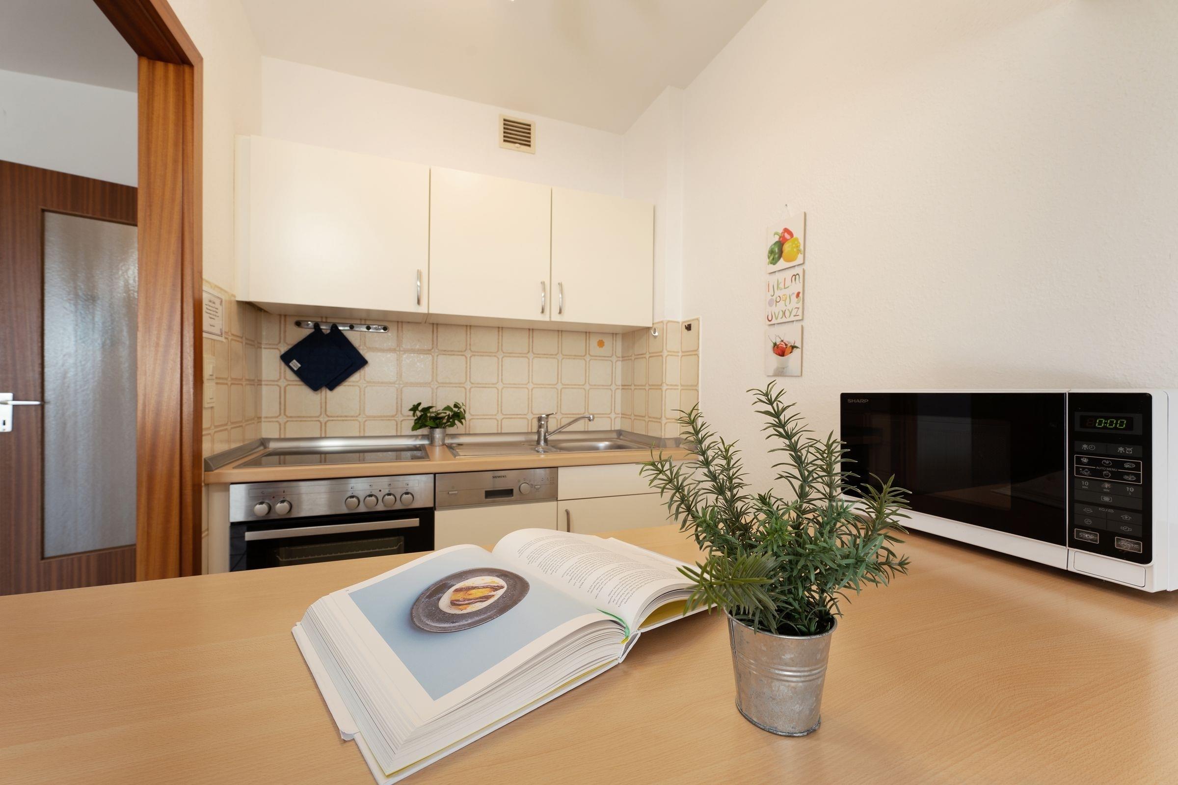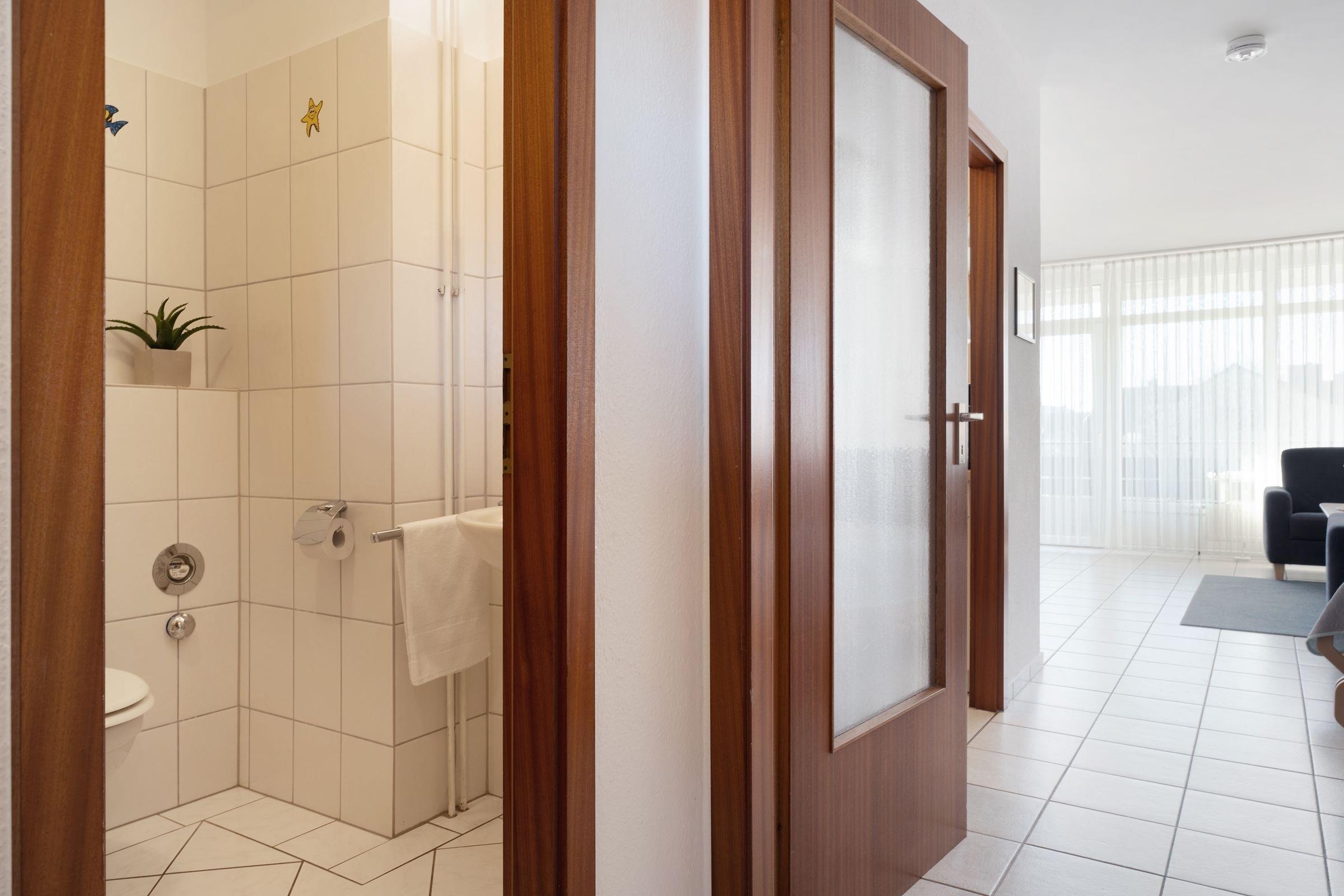 Treten Sie ein in diese gemütliche Ferienwohnung deren Herzstück das offene Wohnzimmer bildet. Die großzügige Sofaecke lädt nach einem ereignisreichen Urlaubstag zum Füße hochlegen ein und für Unterhaltung sorgen ein TV, DVD-Player sowie ein Radio. Von hier aus gelangen Sie auf den schönen großen Balkon in südlicher Lage, auf dem Sie die letzten Sonnenstrahlen des Tages genießen können. Durch die Schrankwand mit ausklappbaren Betten (ca. 180x200 cm) lässt sich dieser Raum im Handumdrehen in einen komfortablen Schlafplatz für zwei Urlaubsgäste verwandeln. In der hellen Küche mit 4-Platten-Herd (Backofen), Geschirrspüler, Kaffeemaschine, Toaster, Mikrowelle etc. können Sie sich wohlschmeckende Mahlzeiten zubereiten. Über den Flur gelangen Sie in das separate Schlafzimmer mit zwei getrennte Einzelbetten (je 90x200 cm). Abgerundet wird diese Wohnung durch das funktionale Badezimmer mit Dusche und WC.