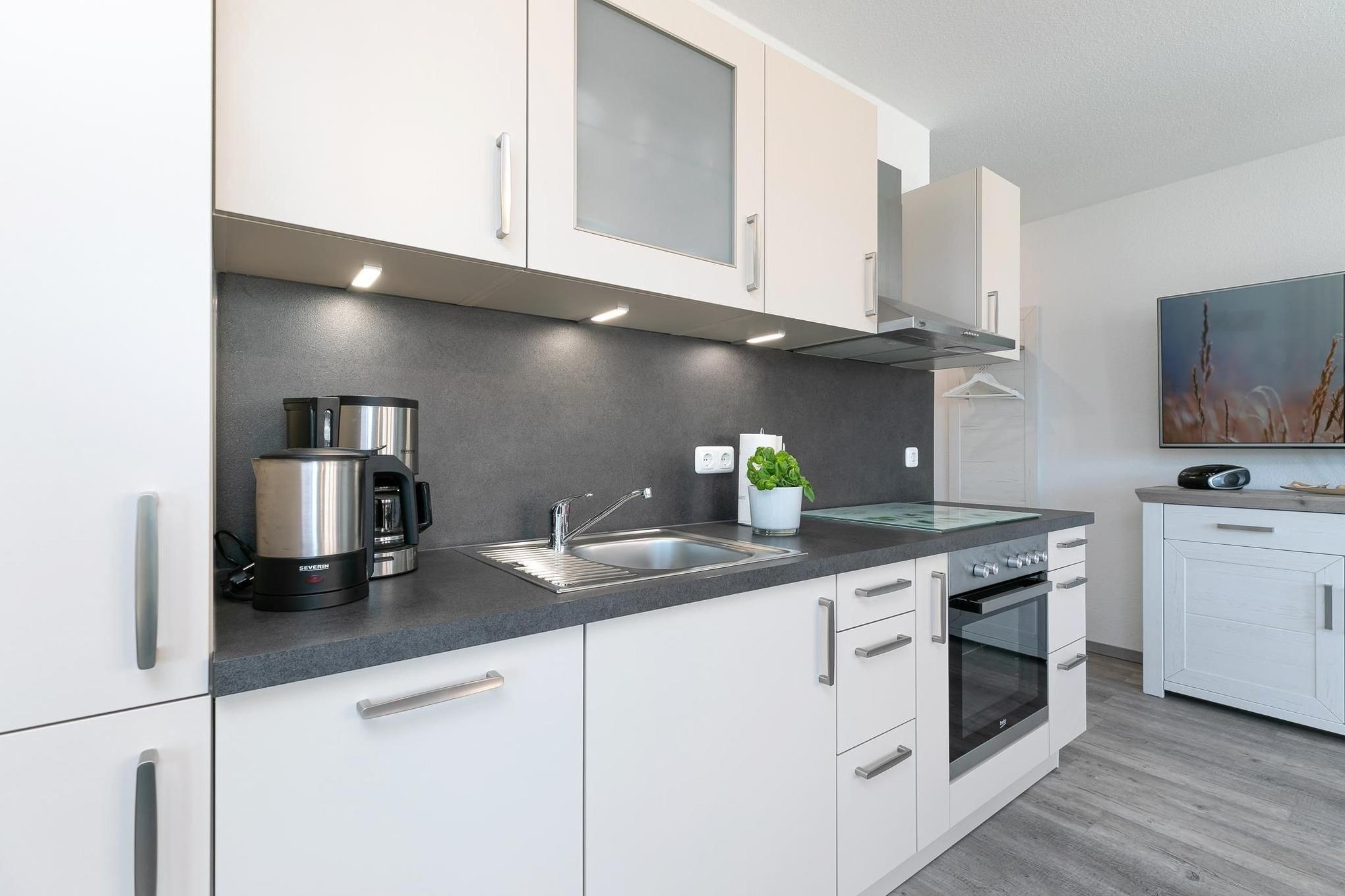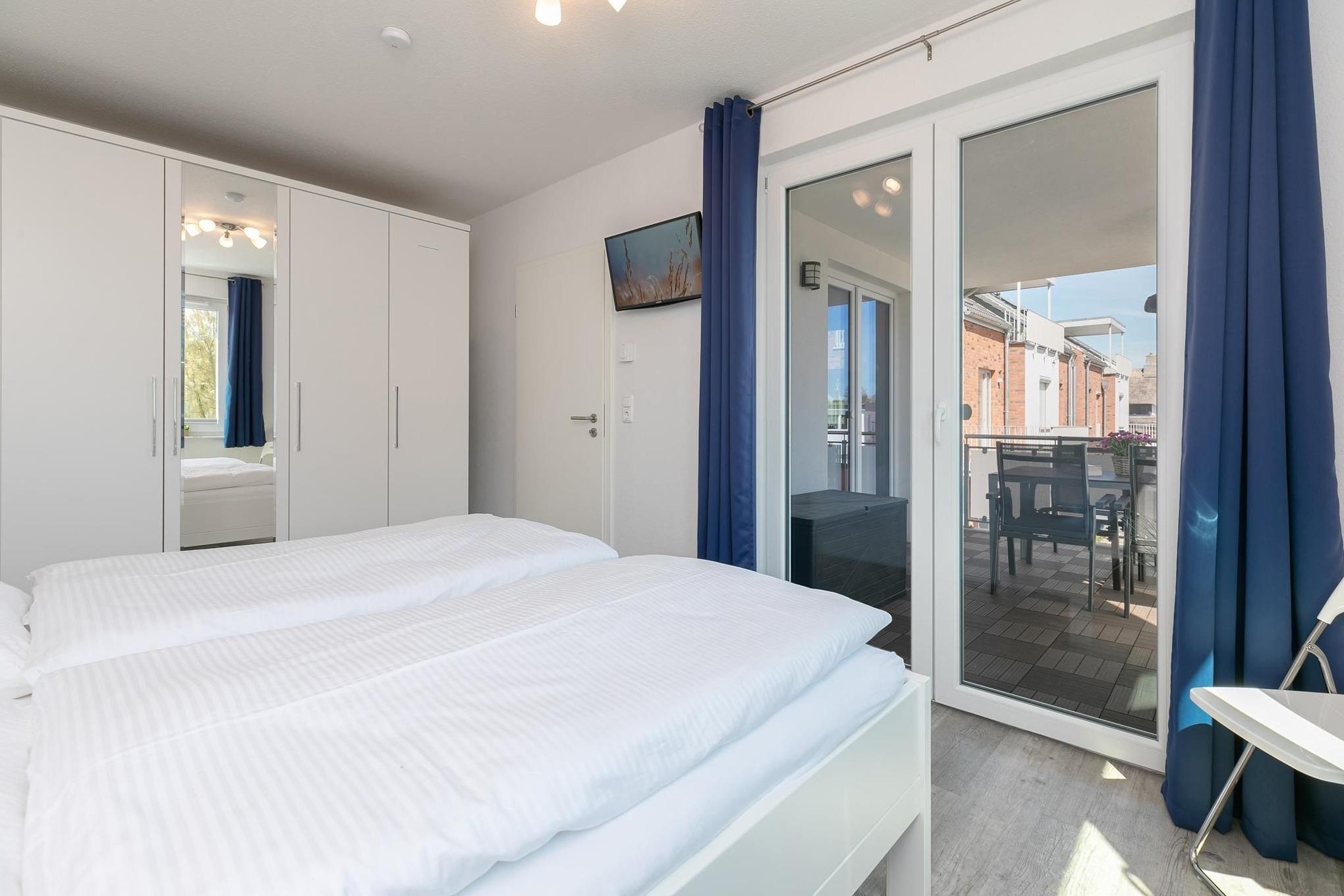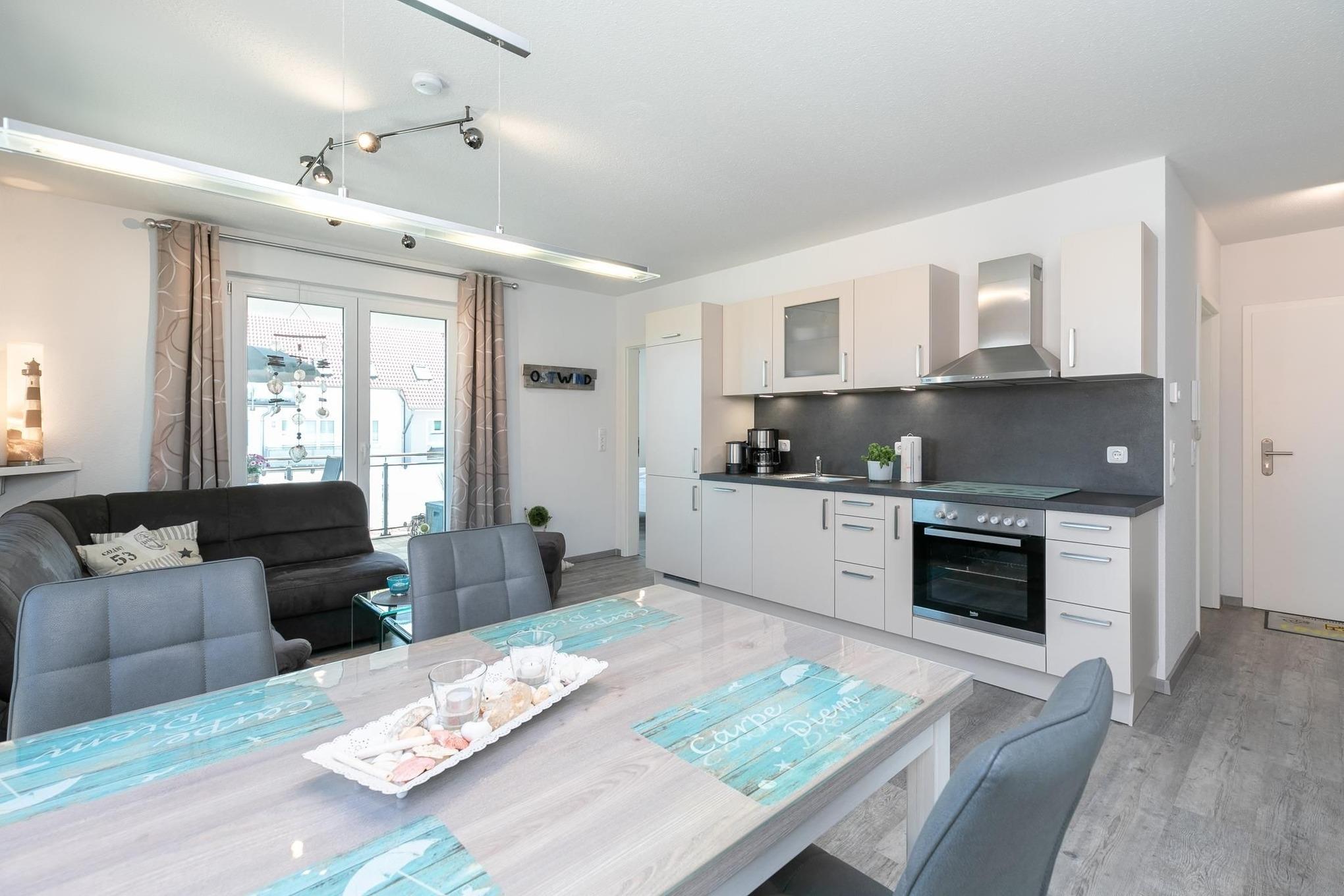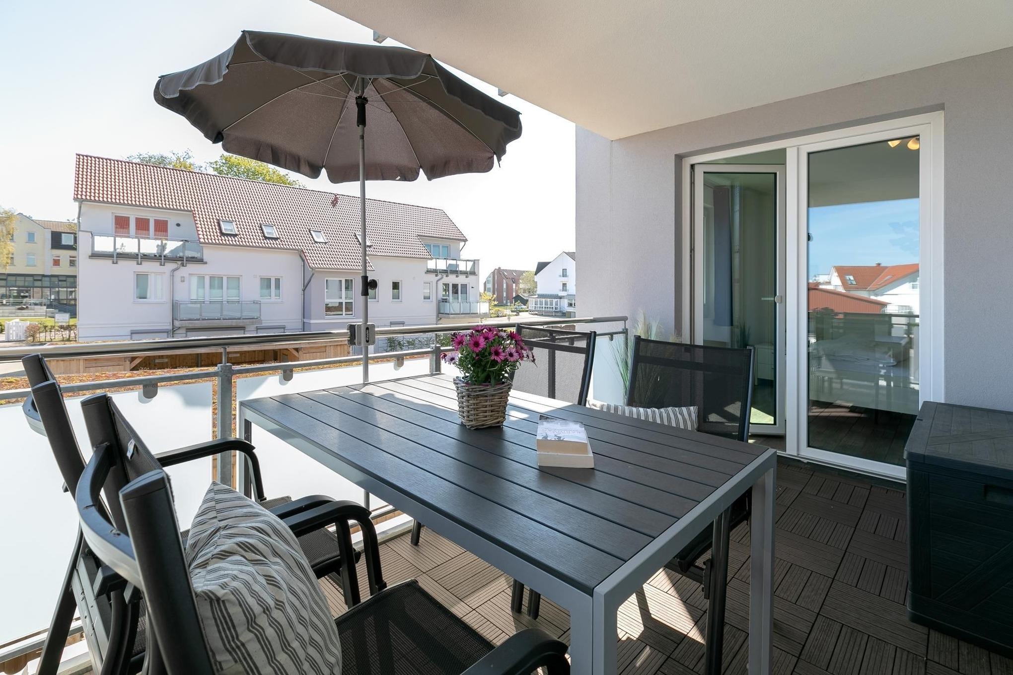 Moderne Ferienwohnung Ostwind mit Balkon im Ostseedomizil Kellenhusen, ideal für erholsamen Ostseeurlaub.