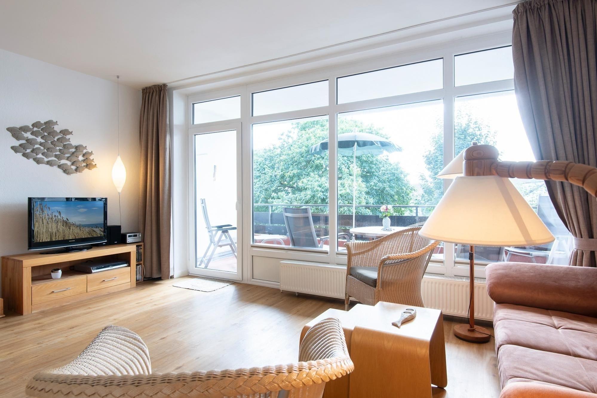 Sie werden von einem offen gestalteten Wohn- und Essbereich begrüßt. Die Couchecke bietet mit Flachbild-TV,DVD-Player und Stereo-Anlage sowohl Unterhaltung als auch Erholung nach einem schönen Urlaubstag. Lassen Sie Ihre Tage bei einem Glas Wein auf der Süd-West-Loggia ausklingen und genießen Sie die erfrischende Meeresluft in der Abendsonne. Die moderne Küche bietet alle Möglichkeiten zur Zubereitung leckerer Speisen und lässt mit mit Cerankochfeld, Backofen, Mikrowelle, Geschirrspüler, Kaffeemaschine, Toaster und Wasserkocher kaum Wünsche offen. Erholsame Nächte verbringen Sie im vom Wohnzimmer abgetrennten Schlafbereich mit gemütlichem Doppelbett (ca. 160x20cm). Das separate Schlafzimmer bietet mit zwei Einzelbetten Platz für weitere Urlaubsgäste (2x 90x200 cm). Einen vitalen Start in den Tag garantiert das Bad mit Dusche. Außerdem ist für kleinere Kinder ein Baby-Hochstuhl, Tripp-Trapp-Stuhl und ein Bettschutzgitter vorhanden.