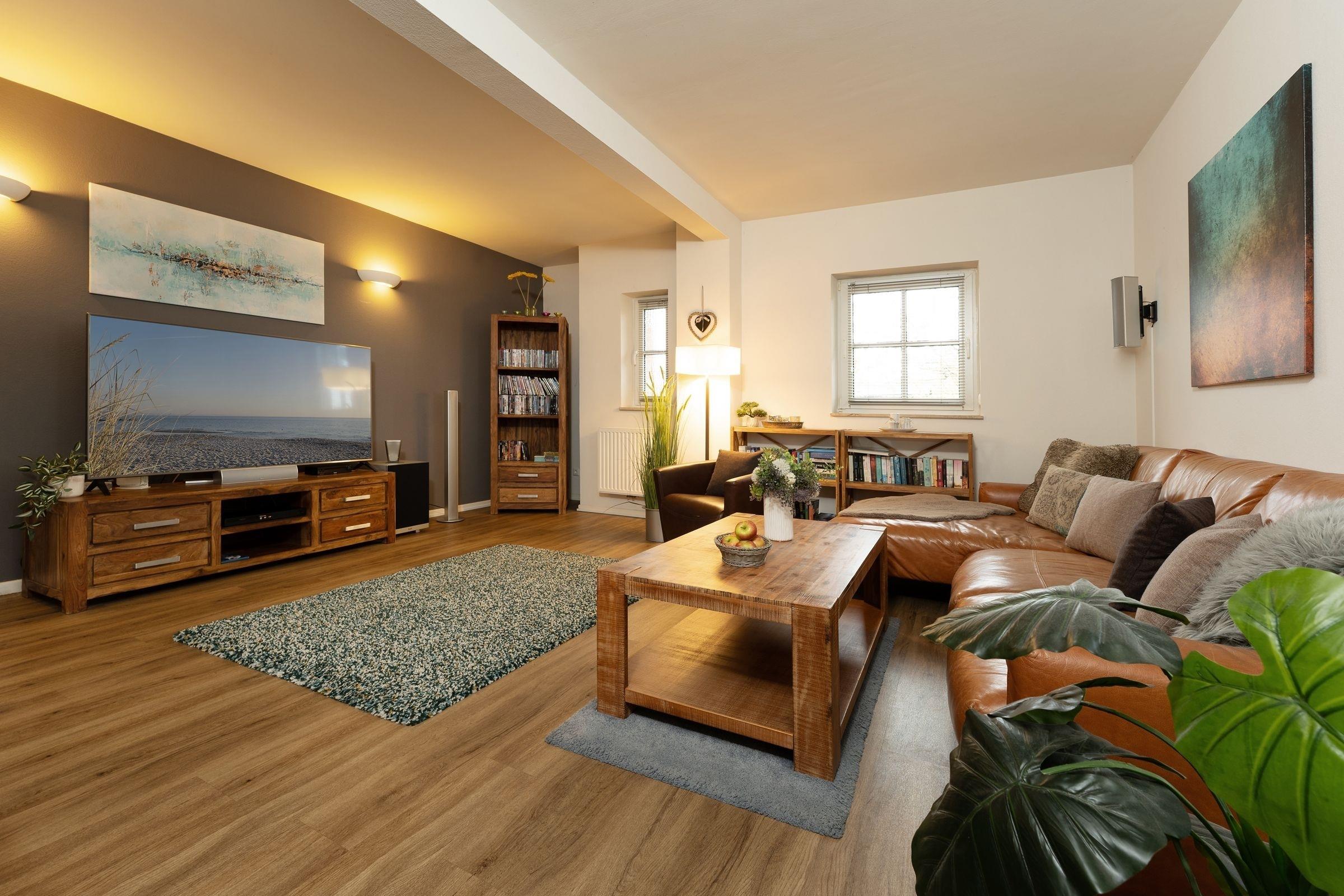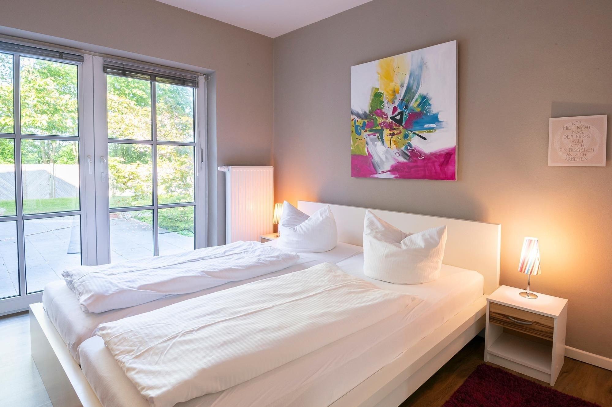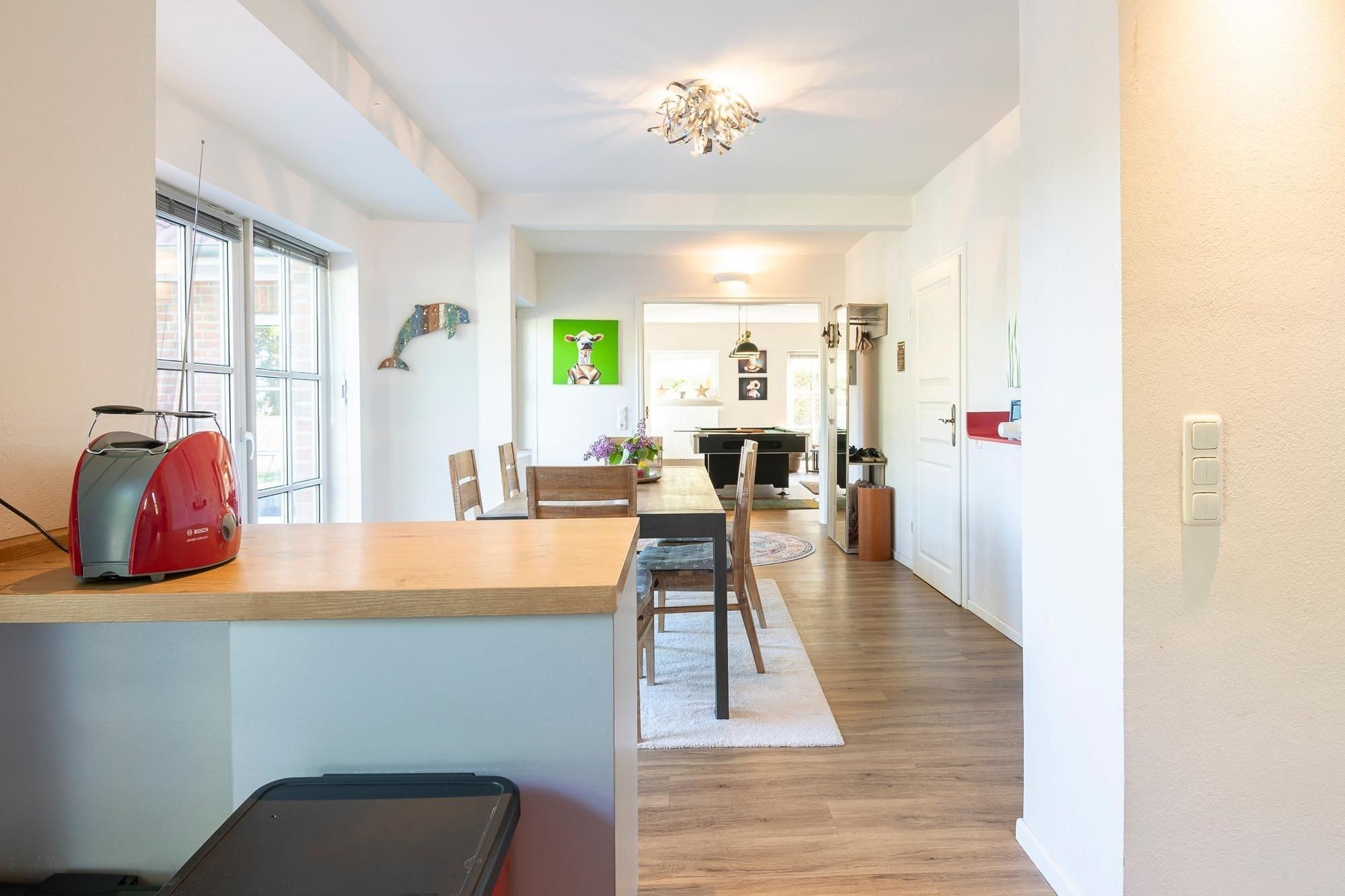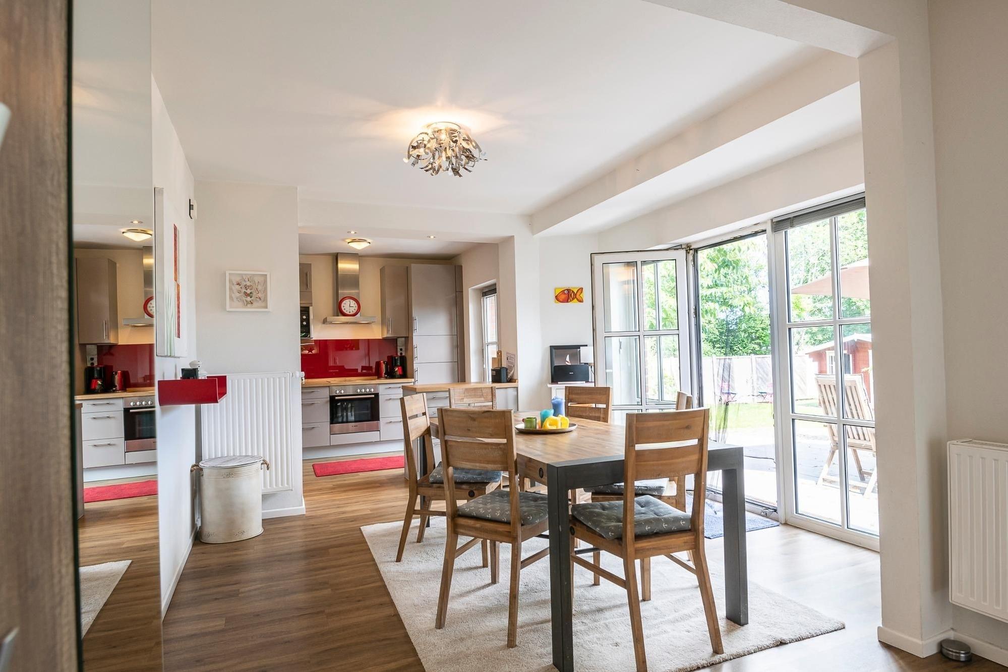 Diese Wohnung besticht durch ihre großzügige Aufteilung und hochwertige Ausstattung. Beim Betreten der Wohnung führt Sie ein offener Wohnbereich direkt in das Herz der Wohnung, wo Ihnen die moderne Küche mit Induktionsherd, Spülmaschine, Kühl-Gefrier-Kombi etc. alle kulinarischen Möglichkeiten bietet. Im angrenzenden Essbereich können Sie gesellige Stunden mit ihren Liebsten verbringen. Das große Wohnzimmer mit Echtleder-Couch garantiert mit einem Smart-TV inklusive Streaming-Diensten (eigene Accounts erforderlich), einem 5.1 Raumklang-Soundsystem und ein DVD/BluRay-Player jede Menge Unterhaltung. Zu den Highlights dieser Wohnung gehört außerdem das Billardzimmer mit 8-Fuß Turnier-Poolbillardtisch mit Profi-Zubehör, das Ihnen zur freien Verfügung steht. Totale Entspannung verspricht der 600m² Garten mit großer Süd-Terrasse, auf der Ihnen eine Sitzgruppe sowie Sonnenschirm und -liegen zur Verfügung stehen. Genießen Sie die Ruhe bei einem ausgiebigem Grillabend oder dem ersten Kaffee am Morgen. Erholsame Stunden verbringen Sie in den zwei Schlafzimmern mit King-Size-Doppelbetten (je 2x 100x200 cm). In einem der Schlafzimmer finden Sie zusätzlich eine umfassende Home-Office-Ausstattung mit 4K-Bildschirm und USB-Tastatur. Weitere mitreisende Gäste nächtigen in einem zusätzlichen Schlafzimmer mit Etagenbett (2x 90x200 cm). Abgerundet wird diese Wohnung durch das luxuriöse Badezimmer mit freistehender Badewanne und großer Regendusche. Zudem gibt es ein weiteres Gäste-WC mit Dusche, um Stau am Morgen vorzubeugen.