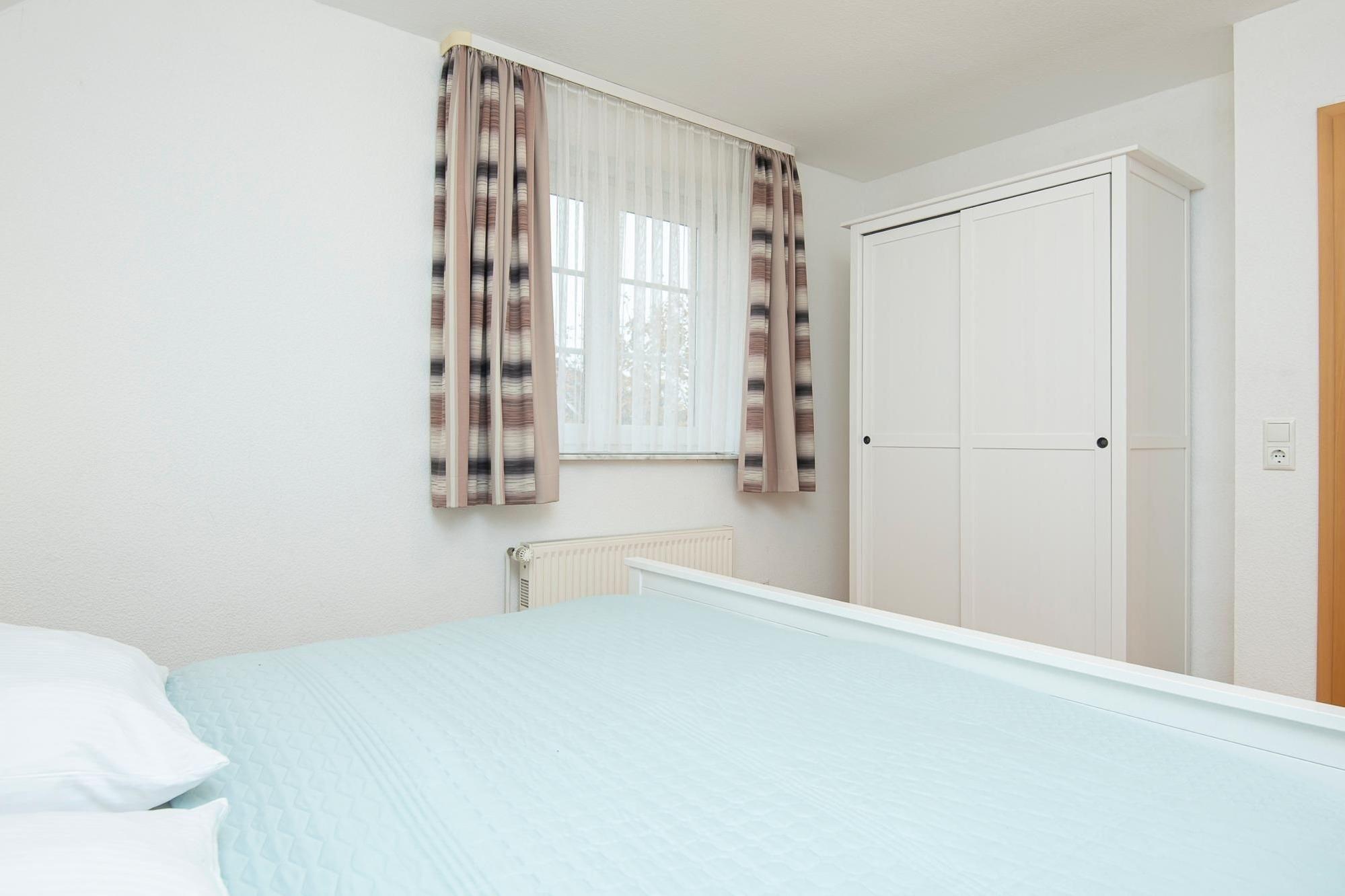Schlafzimmer 1: 1 Doppelbett (2x 90x200 cm), Kleiderschrank, TV, Verdunkelung (Gardine).