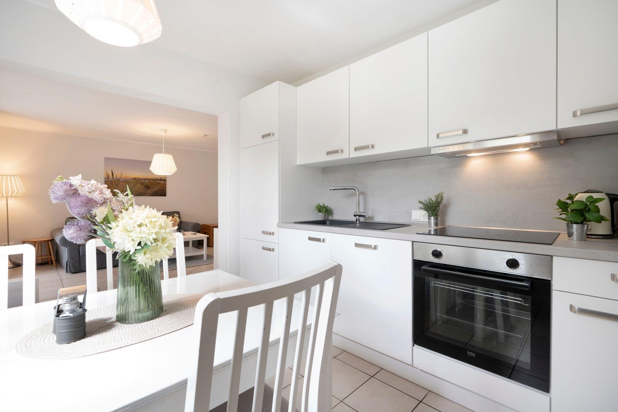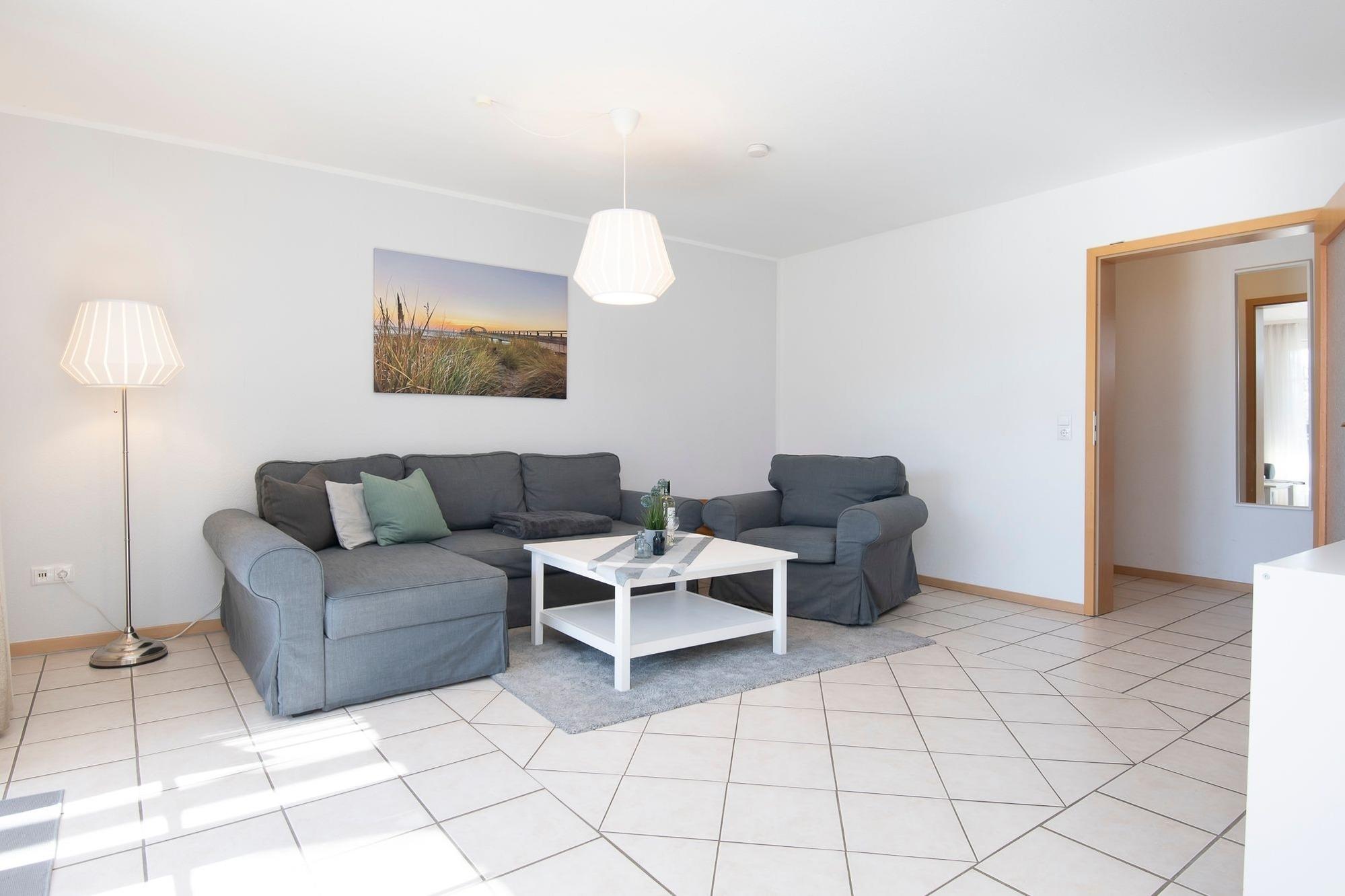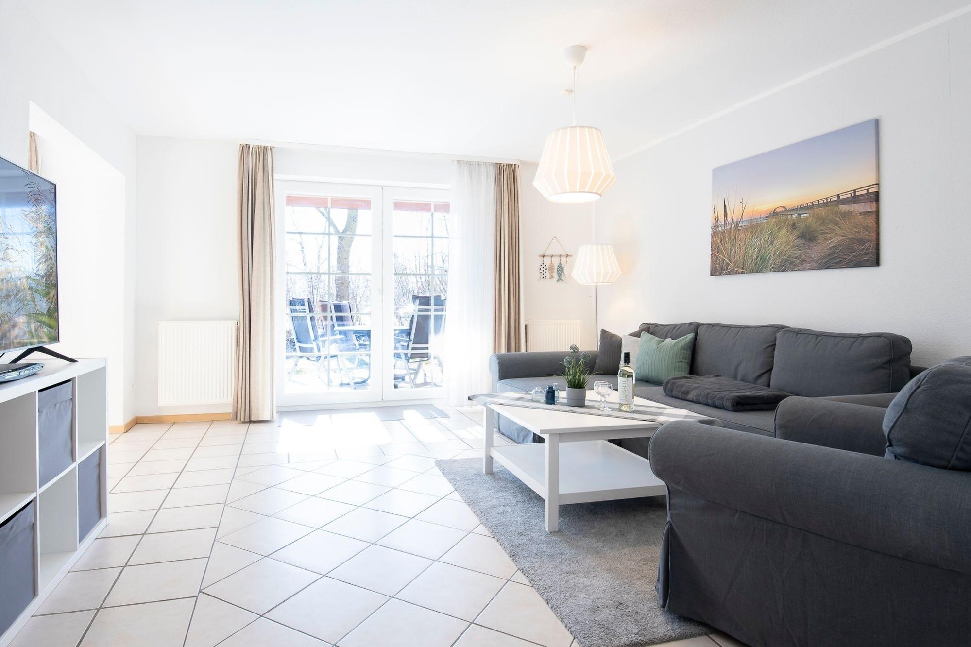 Helle Ferienwohnung Dünensand mit Terrasse und hochwertiger Ausstattung in Kellenhusen, nahe dem Strand.