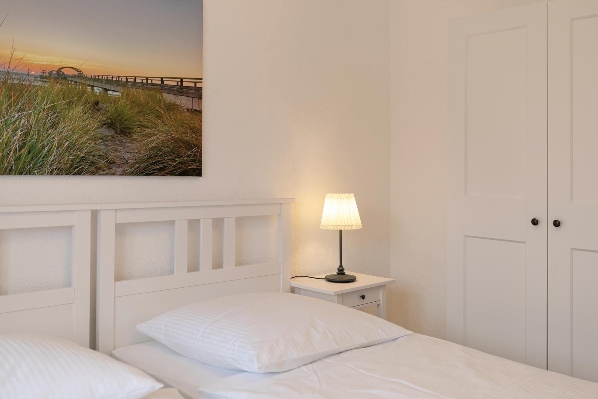 Schlafzimmer 1: 2 Einzelbetten (2x 90x200 cm), zusammengestellt, Verdunkelung (Gardine).