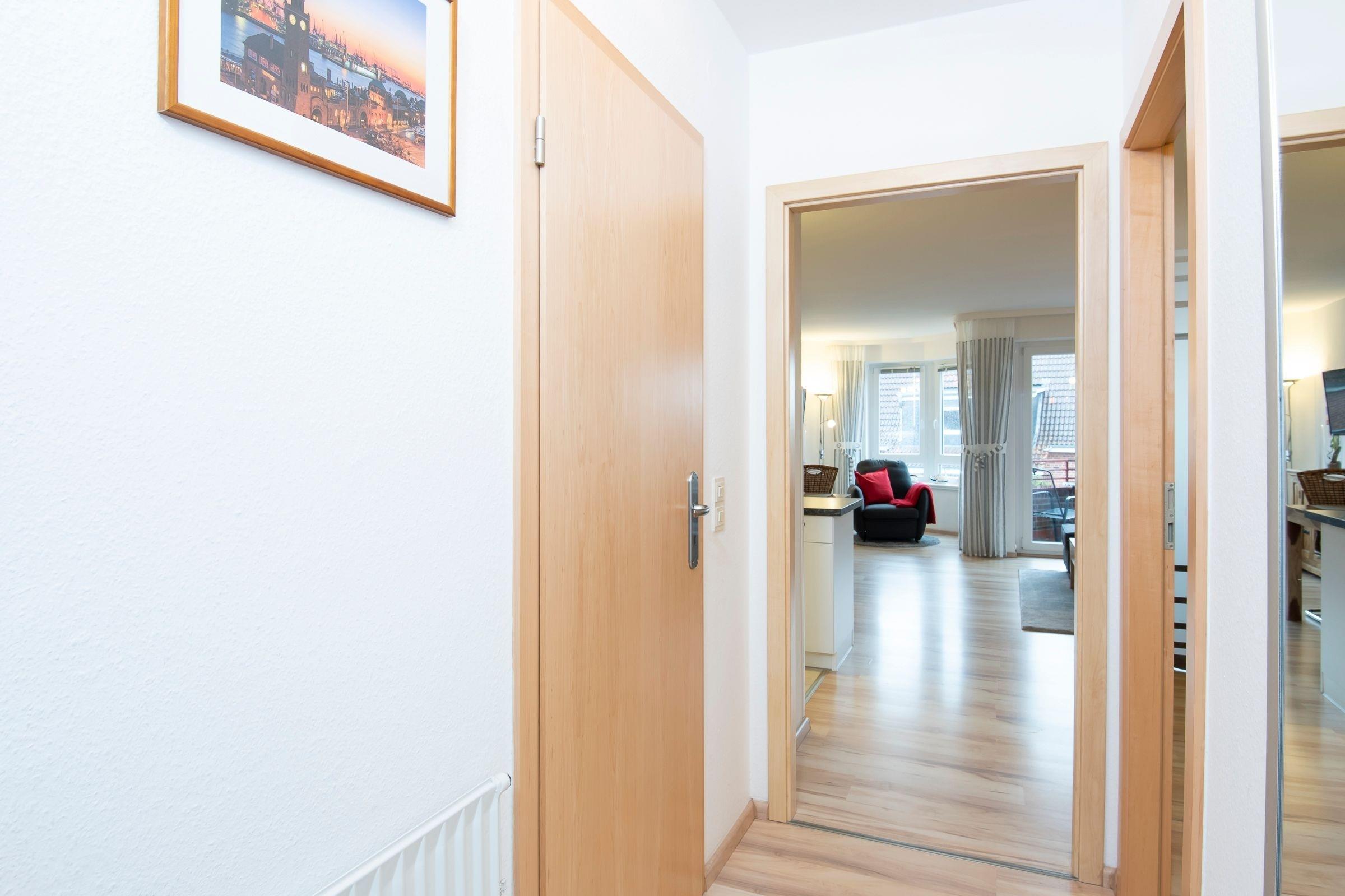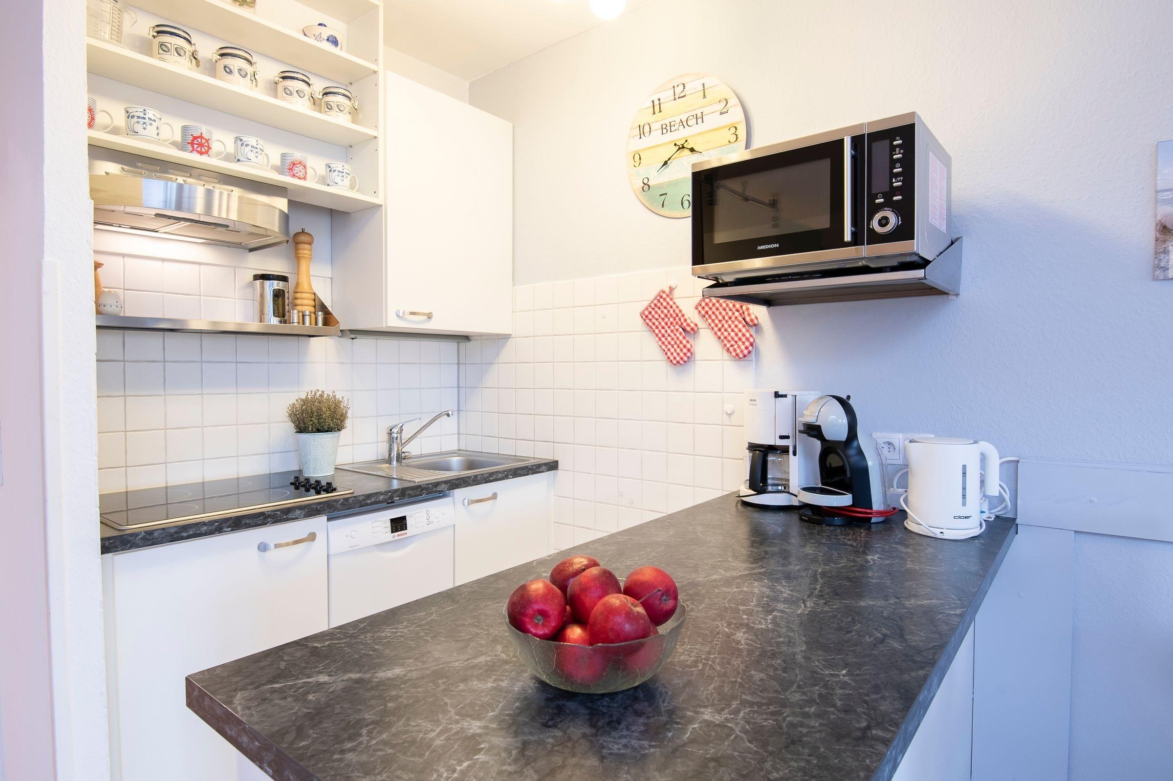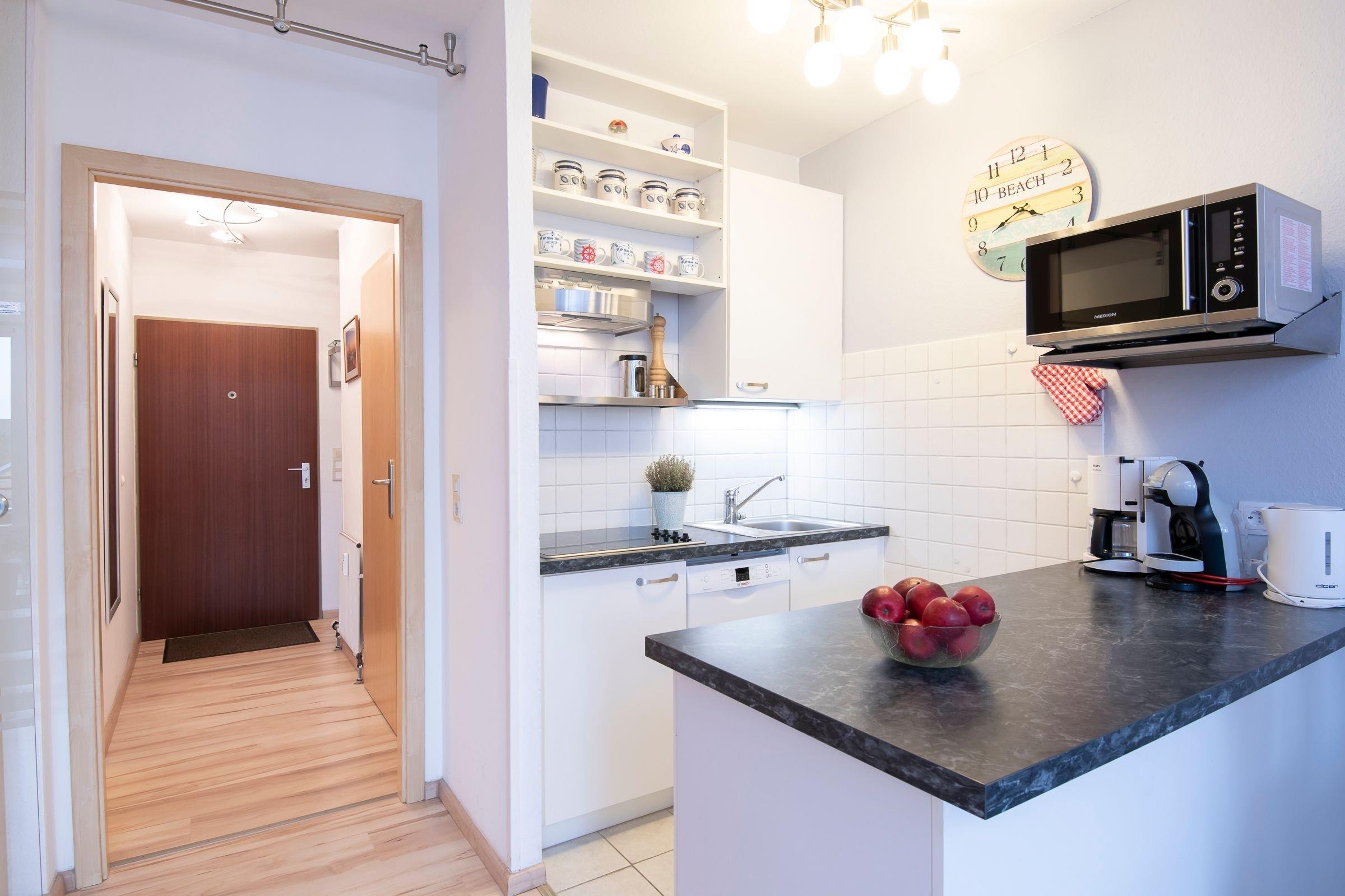 Stellen Sie sich vor, Sie können vom Balkon aus die Ostseeluft schnuppern – in dieser niedlichen Wohnung im Appartementhaus Hamburger Straße 11 ist dies möglich. Der Ostseestrand ist nur rund 200 Meter entfernt. Das durchdachte Raumkonzept sowie die liebevolle Einrichtung dieser Wohnung werden Sie sofort überzeugen: Hier kann Ihr Urlaub nur traumhaft werden. Die bequeme Polster-Garnitur lädt zum Entspannen ein. Direkt daneben haben Sie Zutritt auf den sonnigen Balkon. Hier können Sie wunderbar auf Ihre Auszeit anstoßen. Zurück im Wohnbereich finden Sie in dem kleinen, sonnigen Erker einen bequemen Sessel zum Lesen, Musikhören, Träumen ... Eine schicke Ess-Ecke seht vor der offenen Küche, in der Sie nach Herzenslust neue Urlaubs-Rezepte ausprobieren können. Eine Spülmaschine übernimmt anschließend den Abwasch. Ein raffinierter Tresen sorgt als Raumteiler für ein besonderes Ambiente. Für die Nacht lässt sich das hochwertige Schrankbett (2x 90x200 cm) ausklappen. Zusätzlich gibt es noch einen durch eine Glastür abgetrennten weiteren Schlafbereich mit ausklappbarem Einzelbett (90x200 cm). Das kleine Duschbad ist hell gefliest.