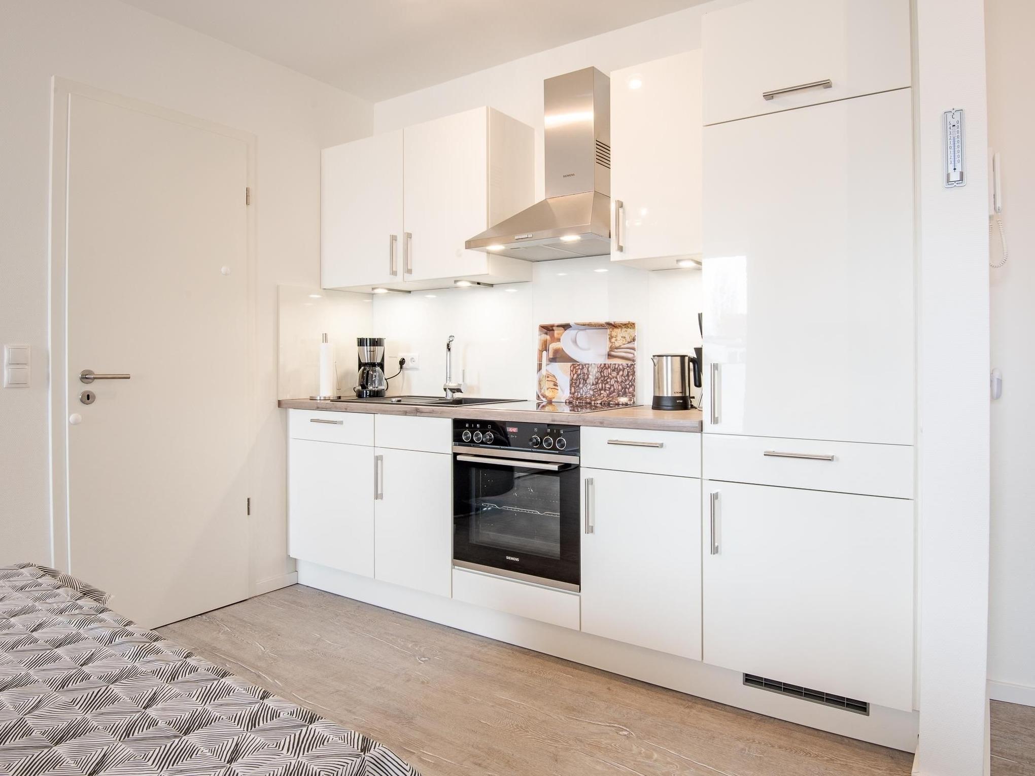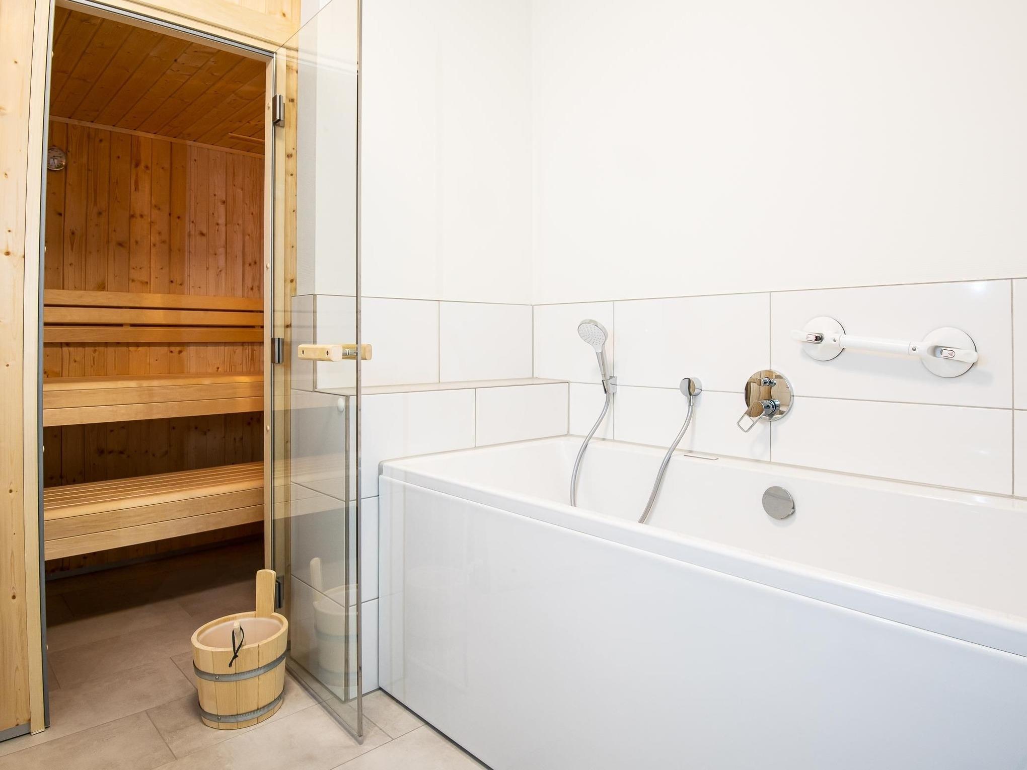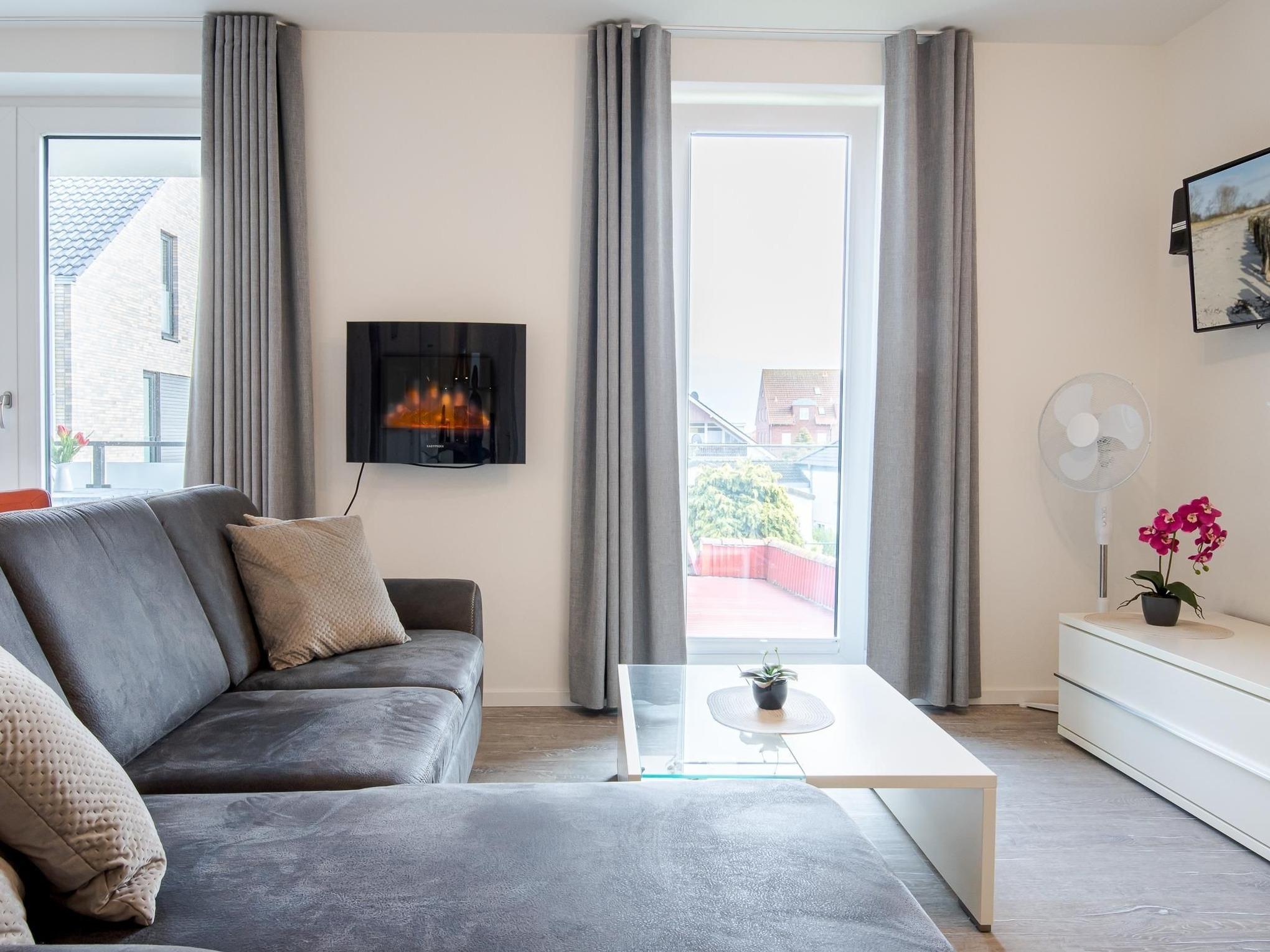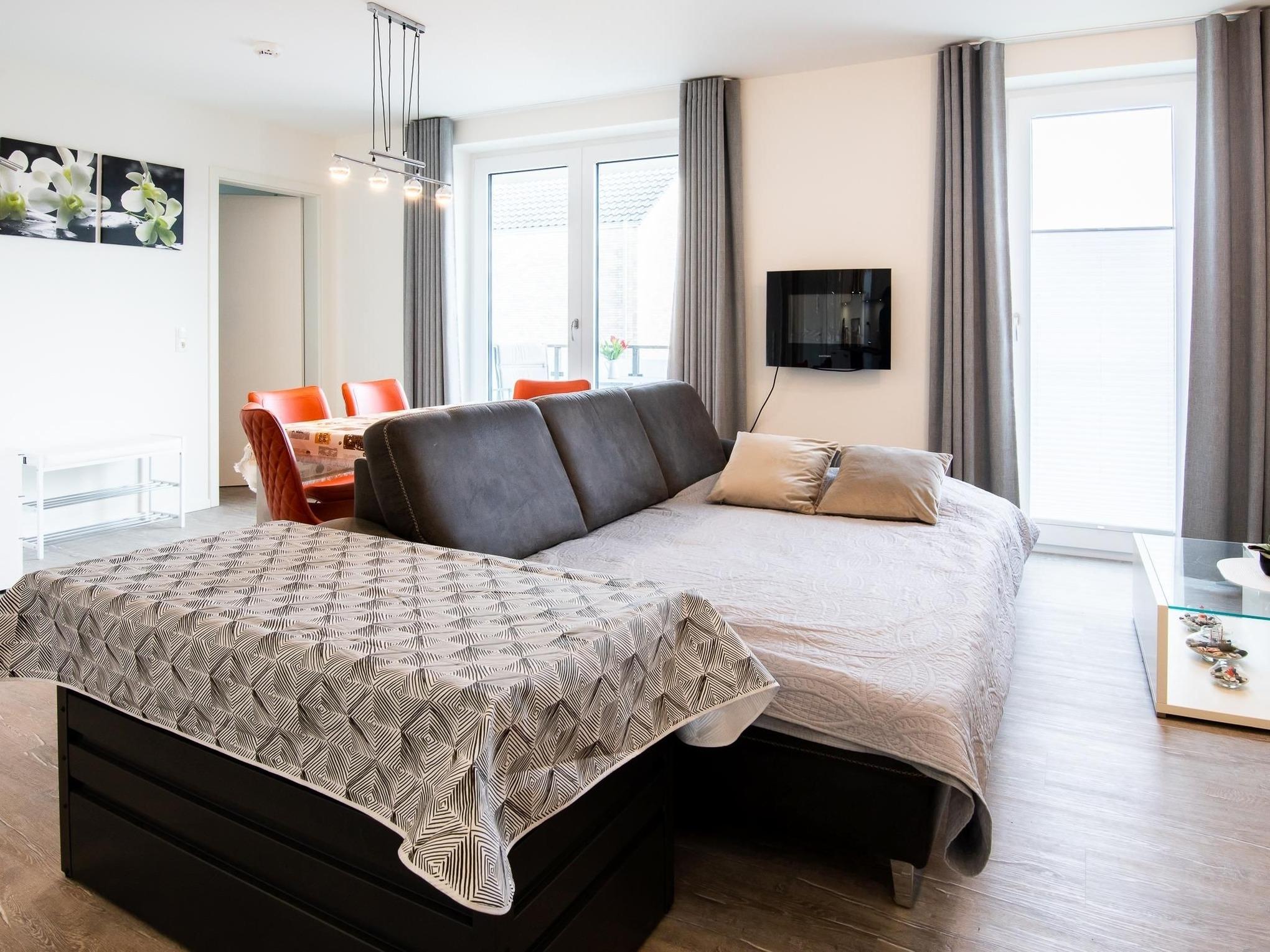 Herzliche Willkommen im Urlaub. Der helle Wohn- und Essbereich ist liebevoll eingerichtet und empfängt Sie mit einer raffinierten Raumaufteilung: In der komfortablen TV-Ecke stehen ein Sessel und eine funktionelle Schlafcouch, die bei Bedarf in einen weiteren Schlafplatz (120x200 cm) verwandelt werden kann. Hier sitzt man für sich, denn: Die Couch fungiert gleichzeitig als gemütlicher Raumteiler. Dahinter befindet sich die Ess-Ecke, die auch zu netten Spiele-Abenden einlädt. Direkt daneben führt eine große Glastür auf den sonnigen Balkon. Perfekt für entspannte Stunden. Oder wie wäre es hier mit einem Frühstück mit knackfrischen Brötchen? Im Erdgeschoss des Hauptgebäudes befindet sich eine Bäckerei. Ihre eigenen Menüs können Sie natürlich wunderbar in der zum Wohnbereich offen gestalteten und gut ausgestatteten Küche mit Geschirrspüler zubereiten. Nach einem erholsamen Tag bietet das Boxspringbett (180x200 cm) im Schlafzimmer angenehme Nachtruhe. Das moderne großzügige Duschbad mit Whirlwanne und Sauna sorgt auch an kälteren Tagen für Wärme und Entspannung. Ein bequemes Plus ist der Personenaufzug im Haus.