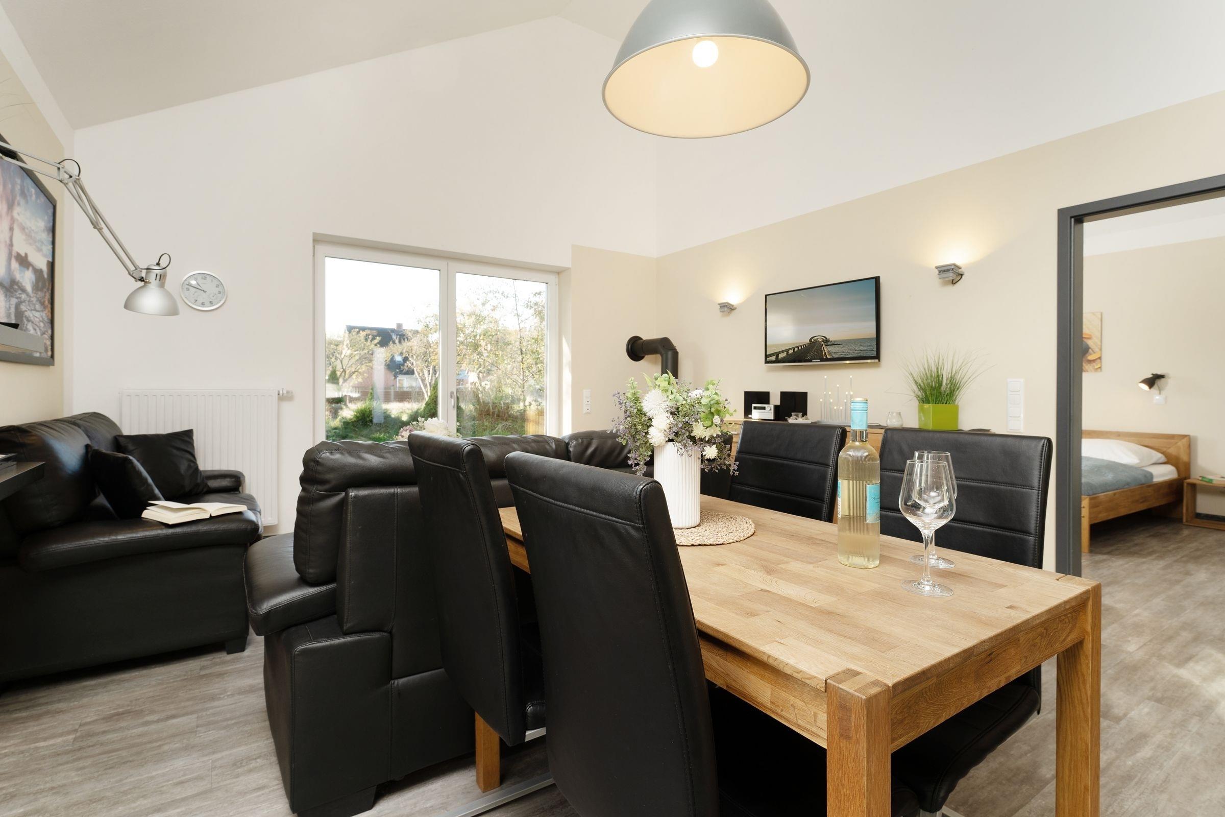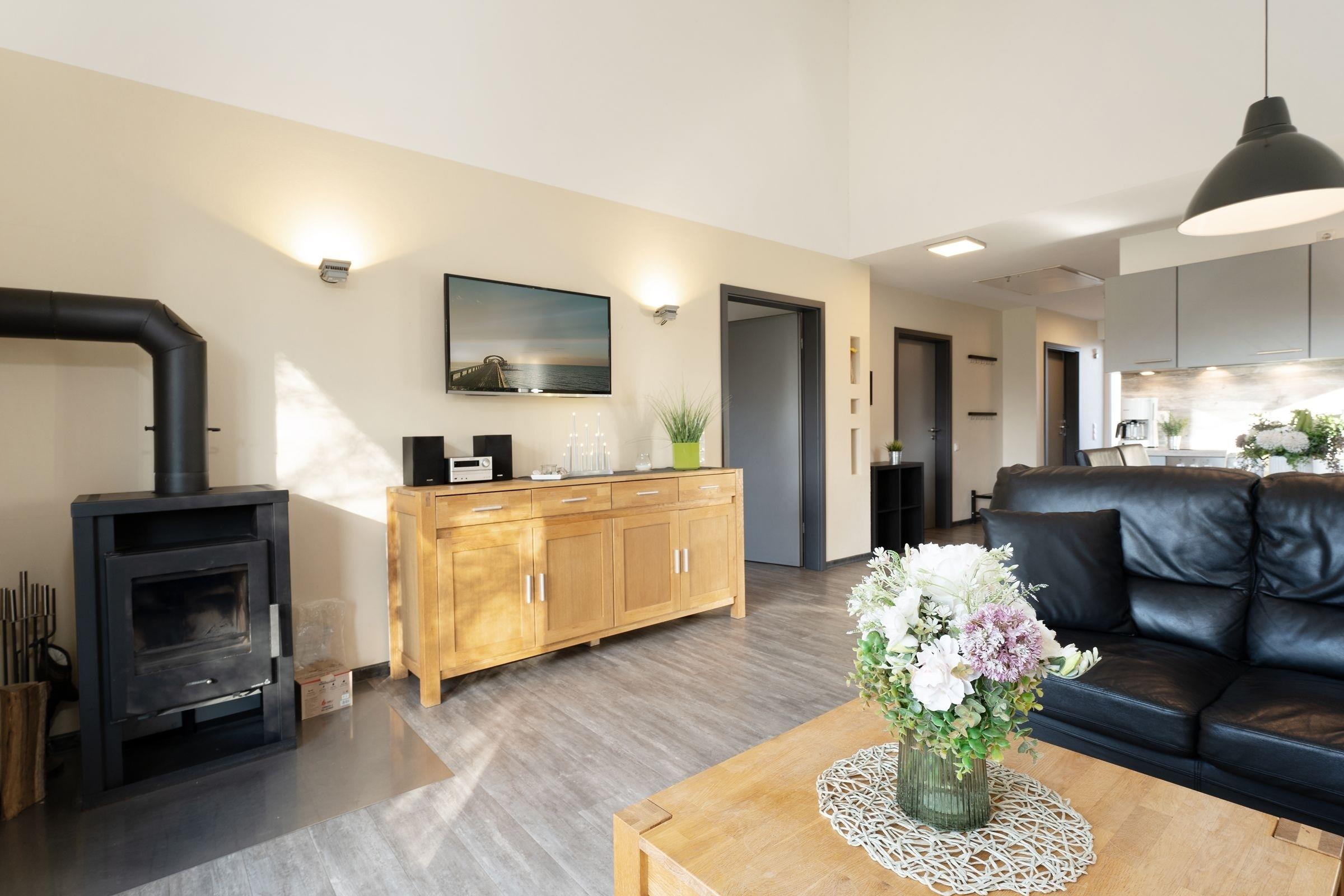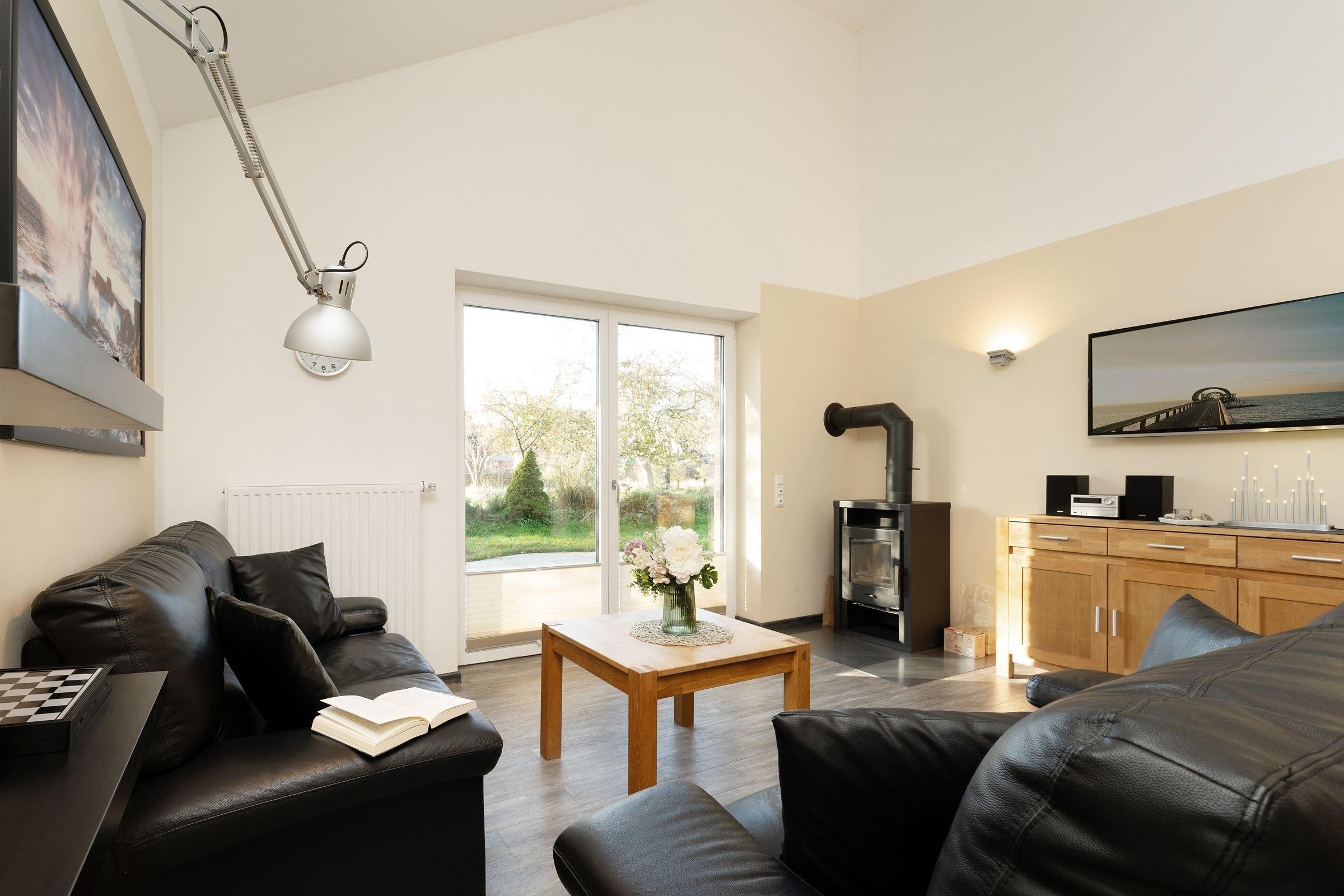 Ein Ferienobjekt der Extraklasse. Hier begrüßt Sie das moderne Haus Wellengang – und sein Name verrät es schon fast: Die Ostsee ist nur rund 200 Meter entfernt. Nehmen Sie im lichtdurchfluteten Wohnbereich Platz. Die beiden Sofas vor dem TV-Gerät laden zum Kuscheln und Relaxen ein, ein Kaminofen sorgt an kühleren Tagen für eine Extra-Portion Gemütlichkeit. Die große Glasfront bietet einen schönen Blick auf die Süd-Terrasse und den Garten. Hier warten eine Sitz-Ecke sowie Sonnenliegen auf Sie. Genießen Sie das gute Wetter, natürlich darf hier auch gern gegrillt werden. Wer im Urlaub lieber seine Lieblings-Speisen kocht, wird sich sicher über die moderne, gut ausgestattete Küche mit Geschirrspüler freuen, die im Wohnraum integriert ist. Gleich dabei befindet sich eine schicke Ess-Ecke. Für die Nacht stehen Ihnen 2 Schlafräume zur Verfügung: Ein Raum ist mit einem Doppelbett (2x 90x200 cm) und einem TV-Gerät ausgestattet. Praktisch: Hier haben Sie auch Zutritt auf die großzügige Terrasse. In dem anderen Raum befinden sich 2 Einzelbetten (je 90x200 cm) sowie ein Wand-TV. Ferner gibt es ein modernes, großzügiges Duschbad mit Fenster und Handtuchwärmer und ein helles Gäste-WC. Waschmaschine und Trockner stehen im Hauswirtschaftsraum zur Verfügung, Kinder-Reisebettchen und Hochstuhl sind ebenfalls vorhanden.