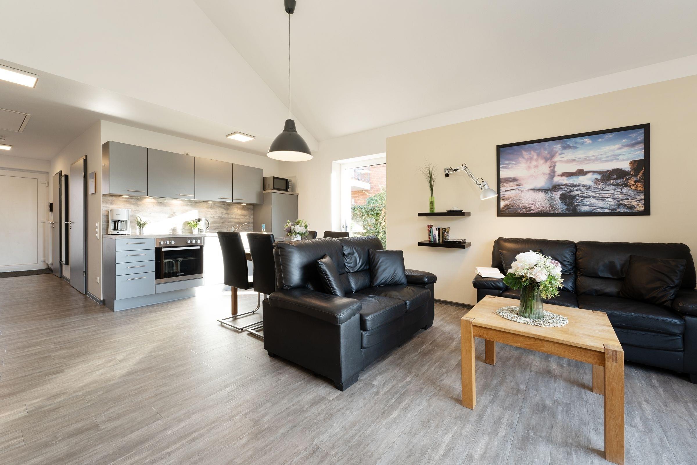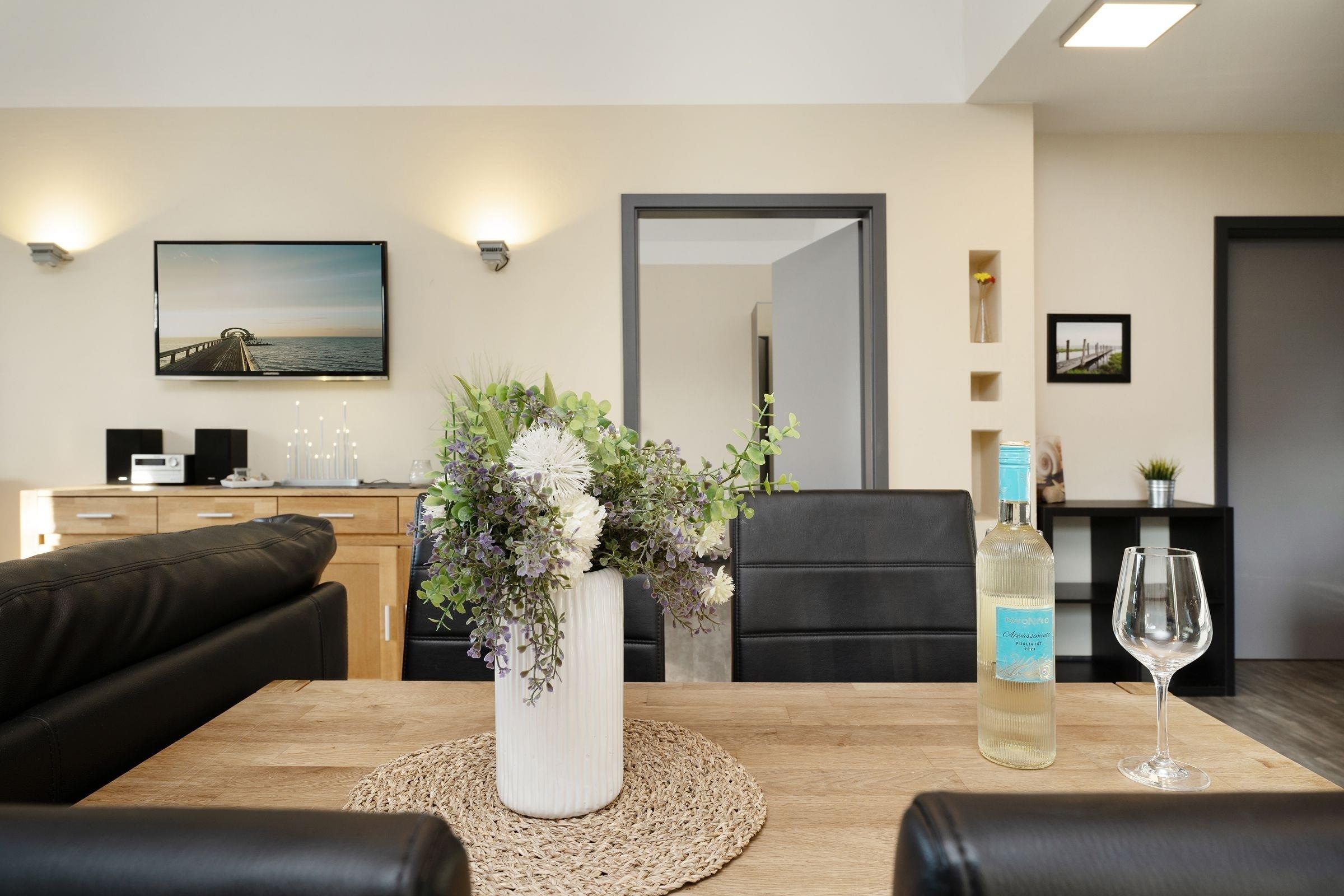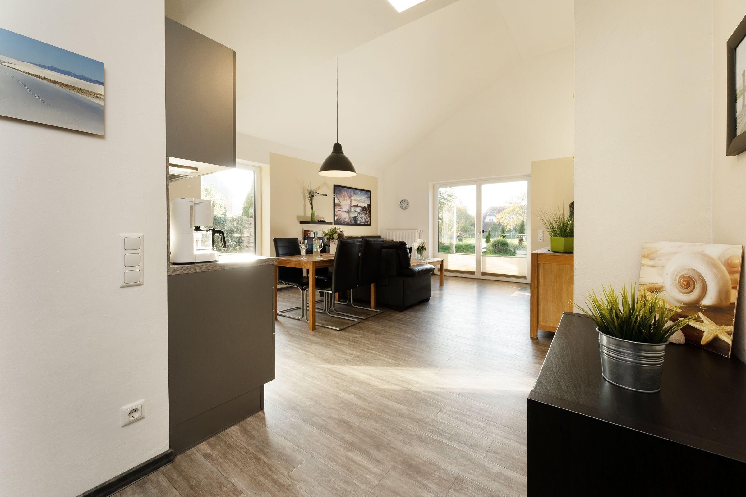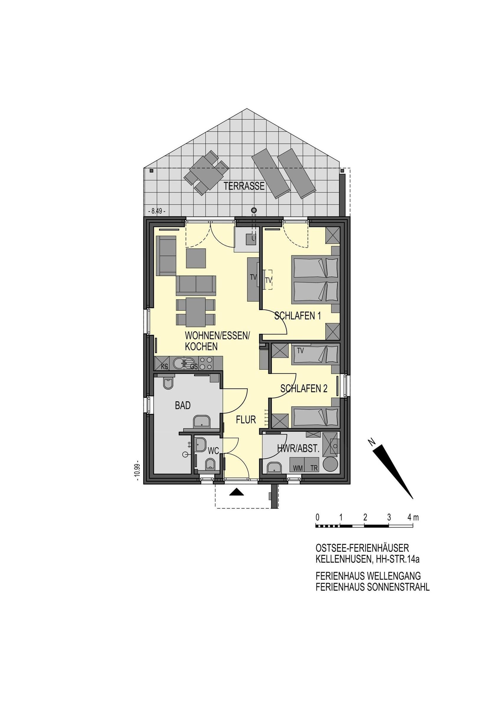 Ein Ferienobjekt der Extraklasse. Hier begrüßt Sie das moderne Haus Wellengang – und sein Name verrät es schon fast: Die Ostsee ist nur rund 200 Meter entfernt. Nehmen Sie im lichtdurchfluteten Wohnbereich Platz. Die beiden Sofas vor dem TV-Gerät laden zum Kuscheln und Relaxen ein, ein Kaminofen sorgt an kühleren Tagen für eine Extra-Portion Gemütlichkeit. Die große Glasfront bietet einen schönen Blick auf die Süd-Terrasse und den Garten. Hier warten eine Sitz-Ecke sowie Sonnenliegen auf Sie. Genießen Sie das gute Wetter, natürlich darf hier auch gern gegrillt werden. Wer im Urlaub lieber seine Lieblings-Speisen kocht, wird sich sicher über die moderne, gut ausgestattete Küche mit Geschirrspüler freuen, die im Wohnraum integriert ist. Gleich dabei befindet sich eine schicke Ess-Ecke. Für die Nacht stehen Ihnen 2 Schlafräume zur Verfügung: Ein Raum ist mit einem Doppelbett (2x 90x200 cm) und einem TV-Gerät ausgestattet. Praktisch: Hier haben Sie auch Zutritt auf die großzügige Terrasse. In dem anderen Raum befinden sich 2 Einzelbetten (je 90x200 cm) sowie ein Wand-TV. Ferner gibt es ein modernes, großzügiges Duschbad mit Fenster und Handtuchwärmer und ein helles Gäste-WC. Waschmaschine und Trockner stehen im Hauswirtschaftsraum zur Verfügung, Kinder-Reisebettchen und Hochstuhl sind ebenfalls vorhanden.