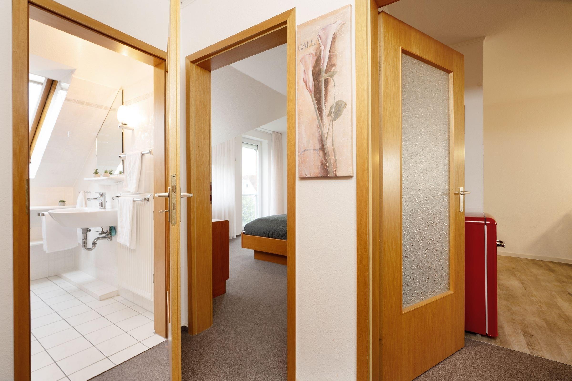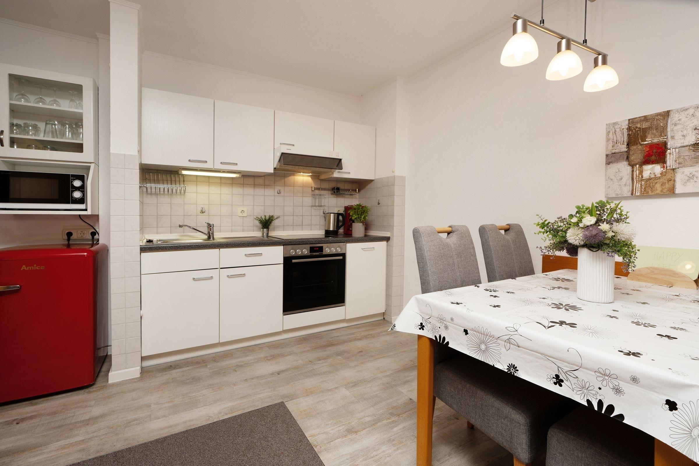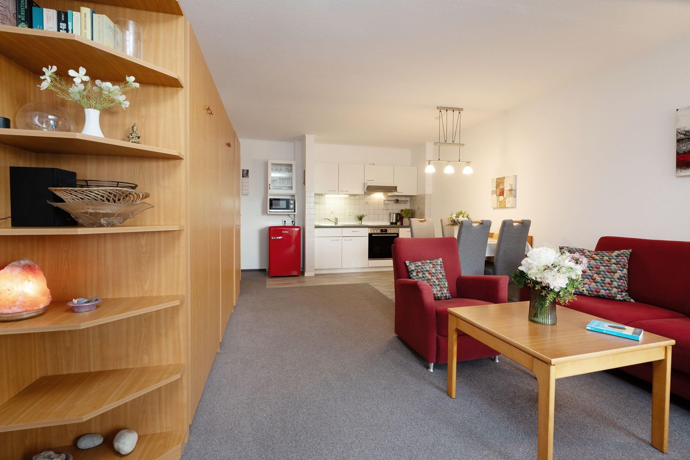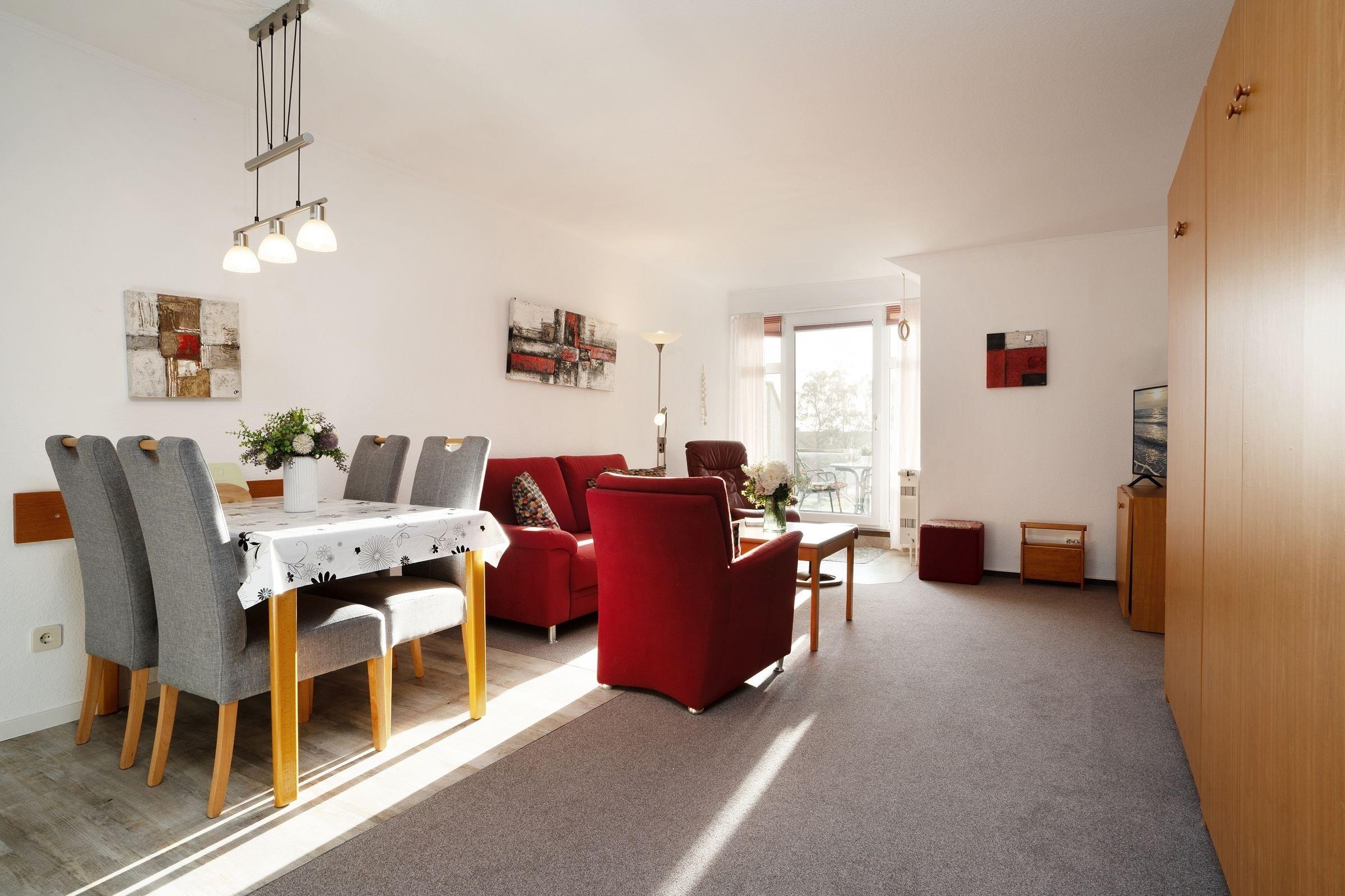 Lassen Sie sich verzaubern von der Lage – die Ferienwohnung Deichkieker im Ferien-Wohnpark Kaiserhof ist strandnah und befindet sich gleich hinter dem Deich. Hereinspaziert. Der Wohnbereich besticht durch seine farblich schön abgestimmte Einrichtung. Das rote Sofa und auch die beiden roten TV-Sessel versprechen pure Entspannung. Legen Sie die Füße hoch und freuen Sie sich über Ihre Auszeit. Wenn das Wetter mitspielt, können Sie diese auch wunderbar auf dem möblierten Balkon verbringen. Hier sitzen Sie gut geschützt und können die Aussicht und die gute Ostseeluft genießen. Der Strand ist übrigens nur rund 80 Meter entfernt. Zurück im Wohnzimmer: In einer schlichten Schrankwand verbergen sich 2 bequeme separat ausklappbare Betten (je 90x200 cm). Die moderne Küche ist in dem Wohnraum integriert und gut ausgestattet. Hier lassen sich sämtliche Lieblingsgerichte zubereiten, gleich nebenan steht eine schöne Essecke zum Schlemmen bereit. In einem separaten Schlafzimmer befindet sich ein bequemes Doppelbett (2x 90x200 cm). Hier werden Sie sicher angenehm von der schönen Ostseeküste träumen. Die Wohnung ist mit Teppichboden ausgelegt. Das lichtdurchflutete Badezimmer mit Dachfenster ist zweckmäßig ausgestattet.