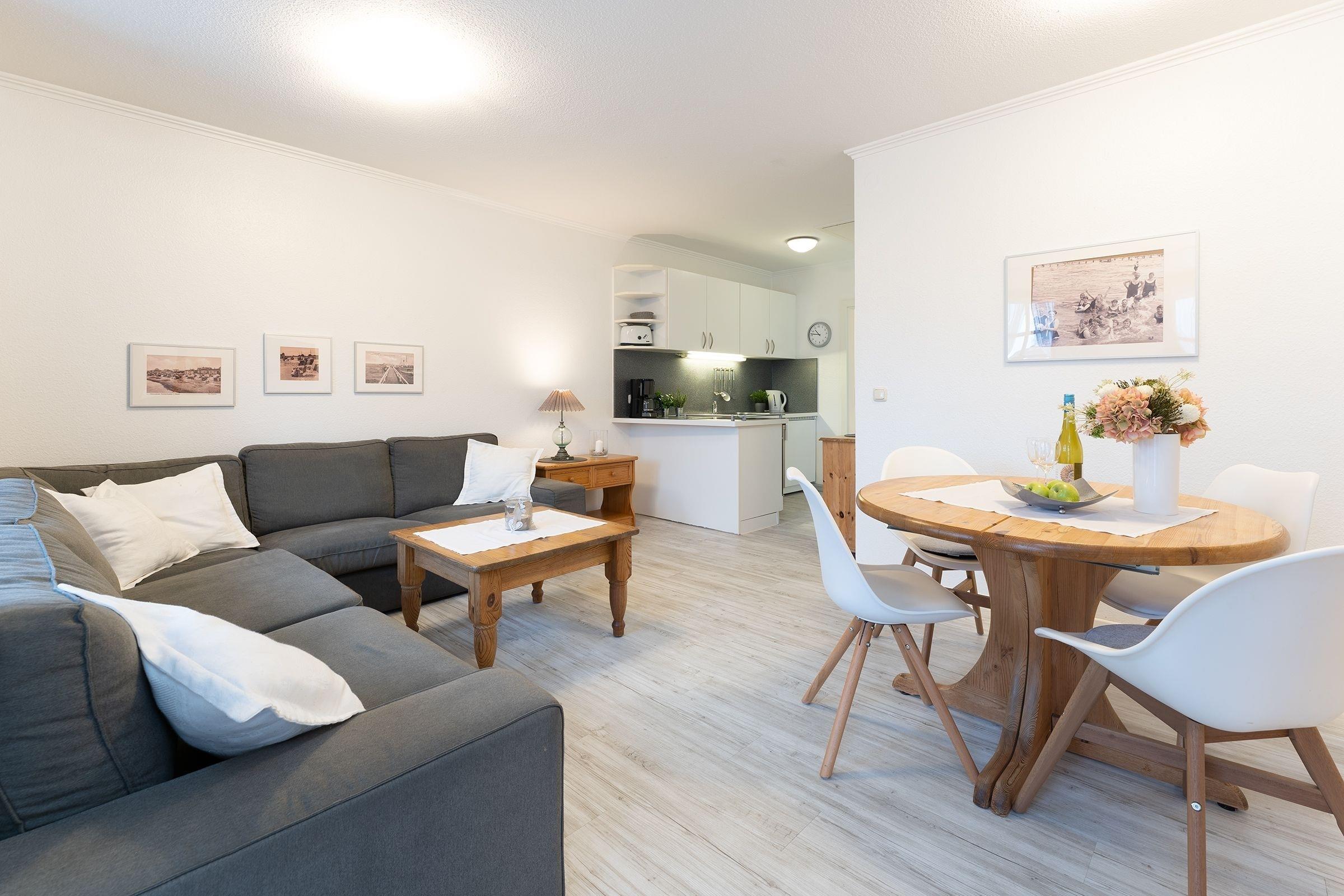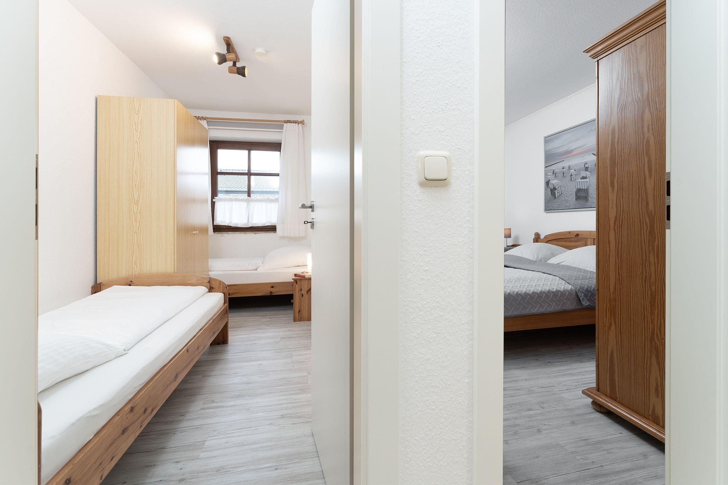 Hereinspaziert! Der Wohnbereich präsentiert sich mit einer großzügigen Sofalandschaft vor dem TV-Gerät und einer gemütlichen Essecke hell und freundlich. Packen Sie Ihre Sachen aus und stoßen Sie auf Ihren Urlaub an. Unzählige Sonnenstunden können Sie auf dem möblierten Südbalkon genießen, den Sie direkt vom Wohnbereich aus betreten können. Die gut ausgestattete Küche mit Geschirrspüler ist zum Wohnbereich hin offen gestaltet. Hier können Sie nach Herzenslust neue Rezepte ausprobieren. Zwei separate Schlafzimmer stehen Ihnen für die Nachtruhe zur Verfügung: Der eine Raum verfügt über ein Doppelbett (180x200 cm) und der andere Raum über zwei Einzelbetten (90x200 cm und 90x170 cm). Beide Zimmer sind mit einem Kleiderschrank ausgestattet und es kann mit einem Rollo verdunkelt werden. Das gepflegte Duschbad ist hell gefliest.