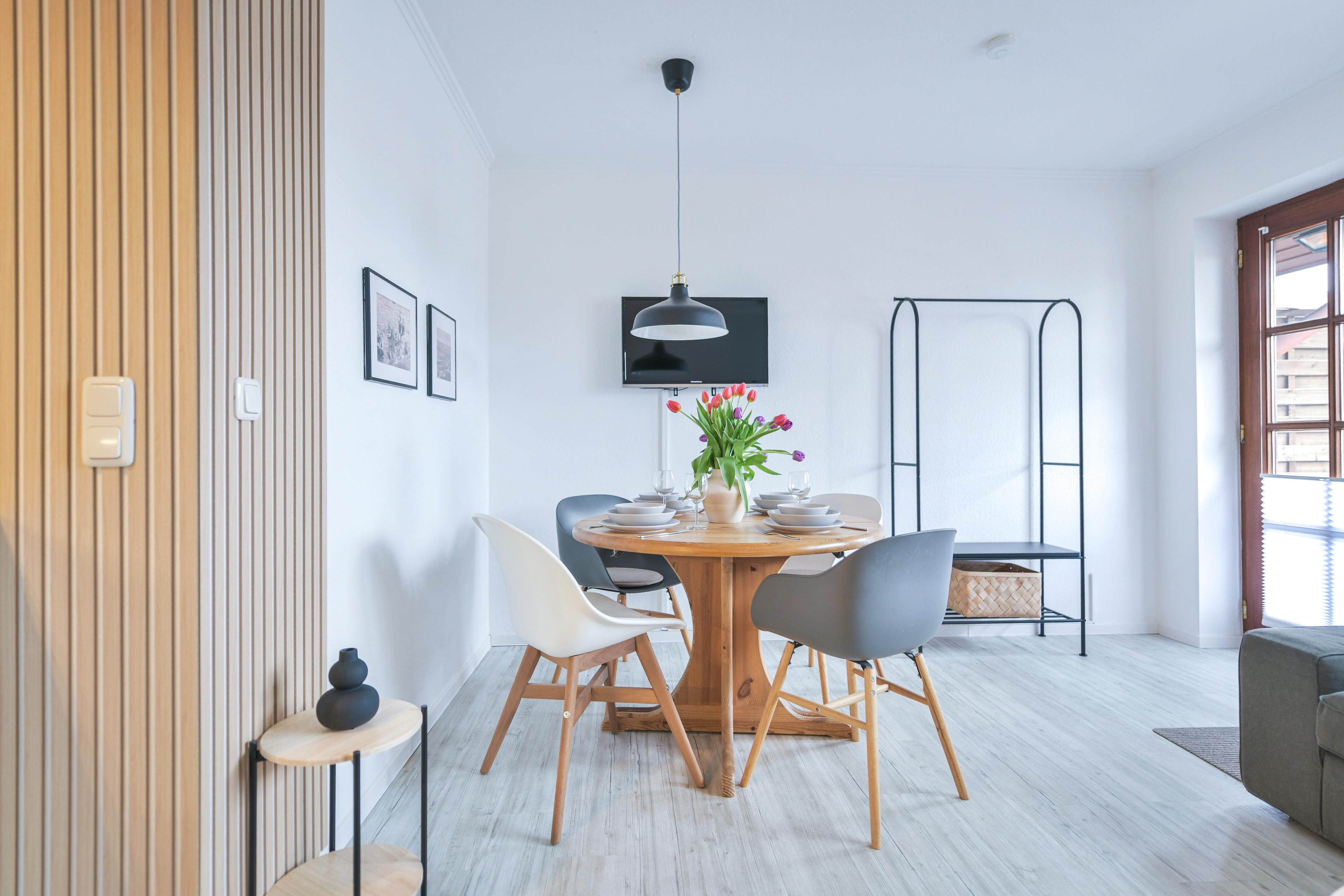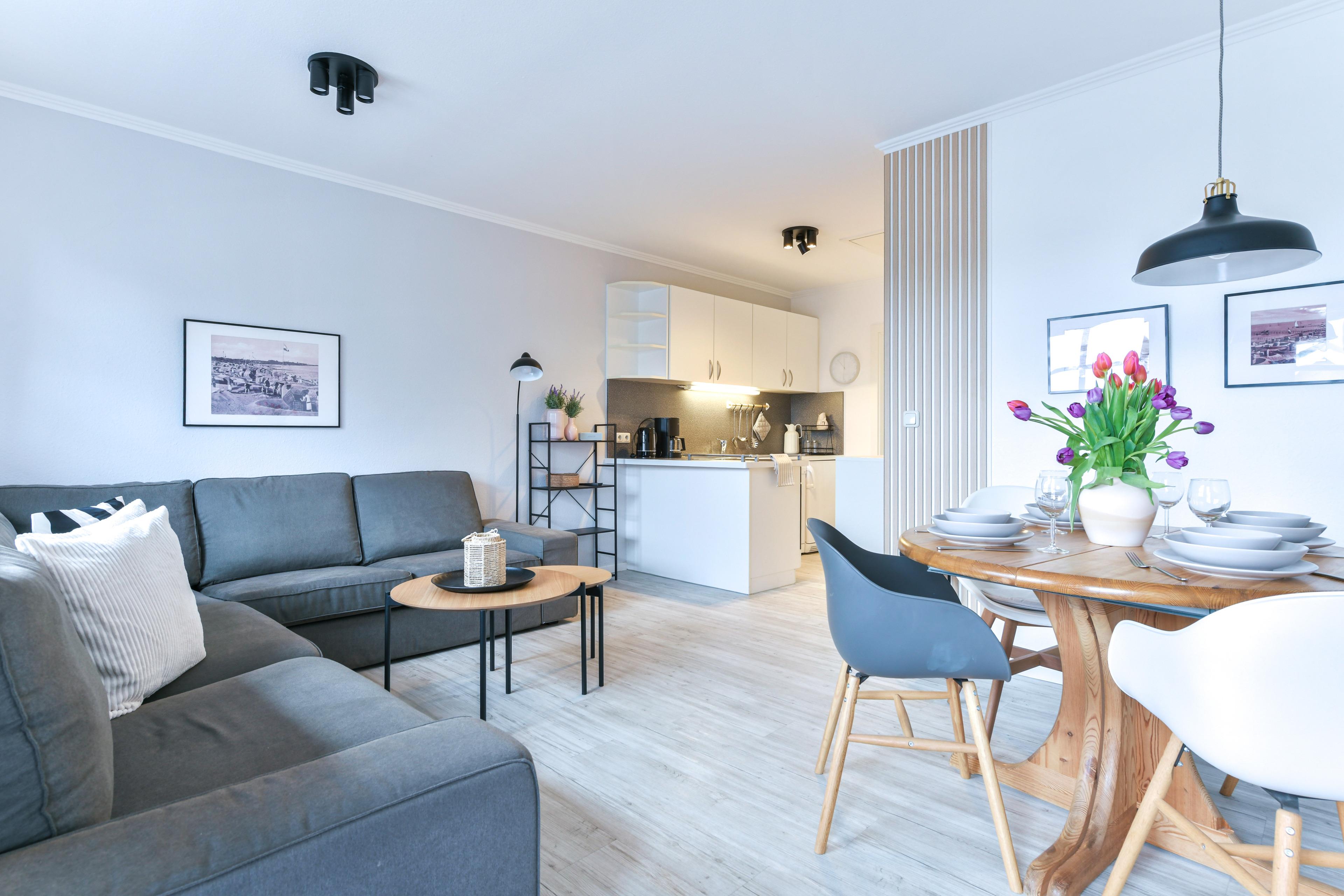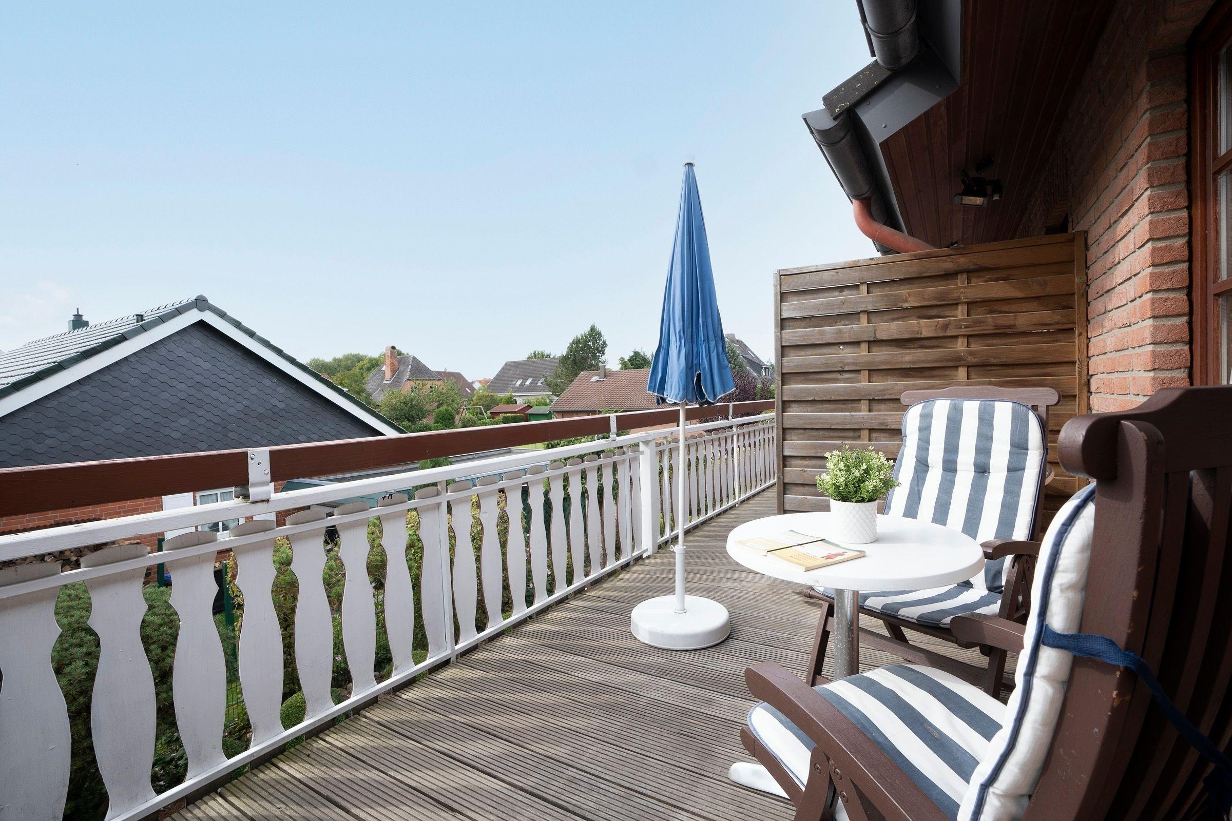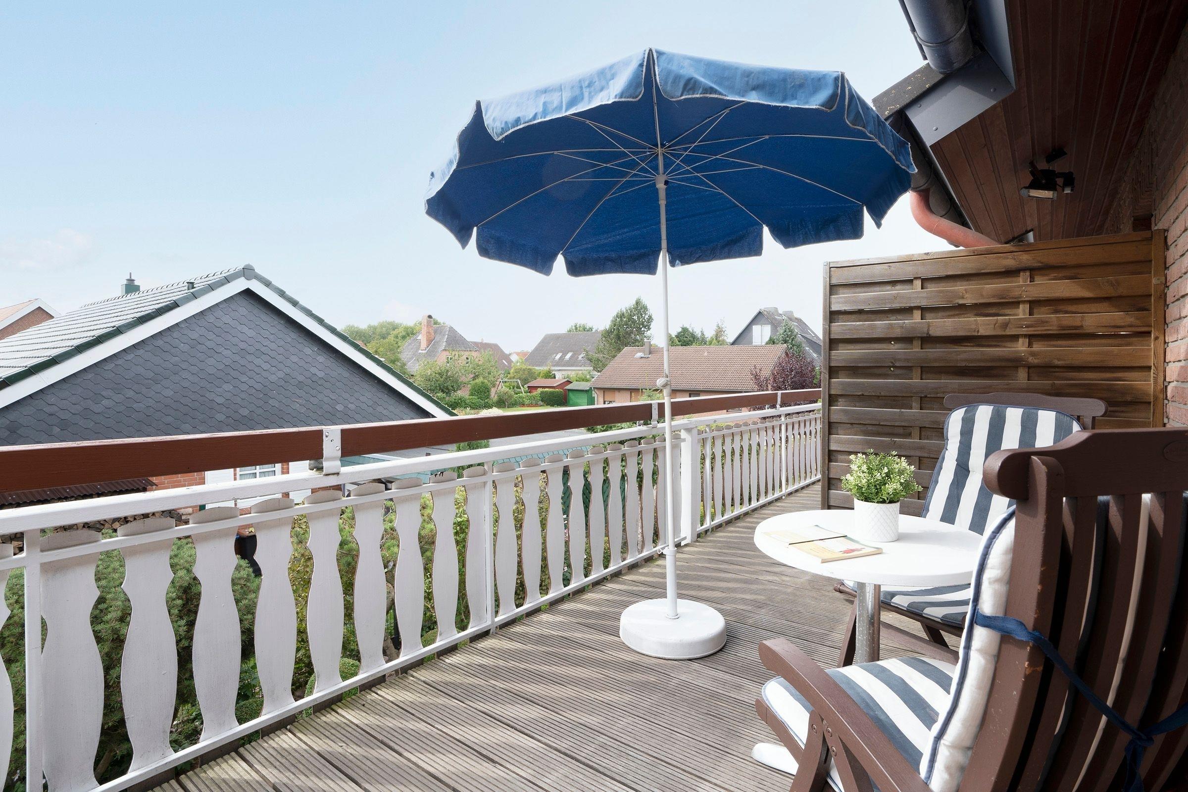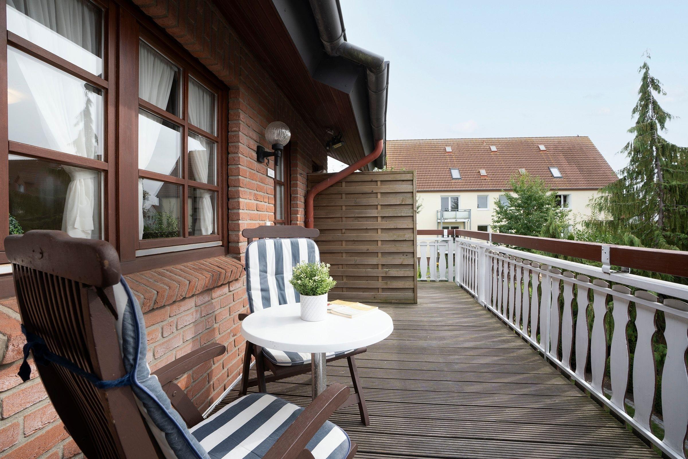 Helle 3-Zimmer-Ferienwohnung in Kellenhusen im 1. Stock mit 2 Schlafzimmern und Balkon mit Gartenblick. Bis zu 3 Erwachsene und 1 Kind können sich auf einer Wohnfläche von ca. 49 m² wunderbar entspannen.