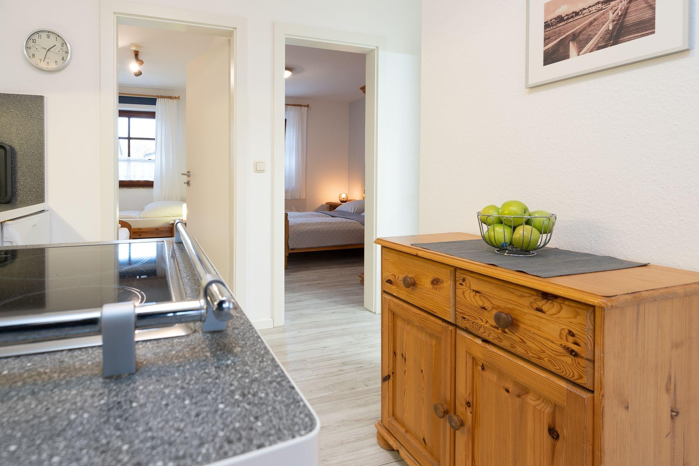 Modern, gemütlich und hochwertig – so präsentiert sich diese liebevoll eingerichtete Ferienwohnung. Im Wohnbereich können Sie herrlich auf der großen Sofalandschaft entspannen oder bequem in der Essecke verweilen. Auch der möblierte Südbalkon lädt zum Relaxen ein, genießen Sie hier Ihre Auszeit in der Sonne. Die moderne Küche mit Spülmaschine ist zum Wohnbereich hin offen gestaltet und gut ausgestattet. Hier können Sie nach Herzenslust Ihre Speisen zubereiten und anschließend genießen. Eine wundervolle Nacht versprechen die beiden Schlafzimmer: Eins ist mit einem Doppelbett (180x200 cm) und einem Kleiderschrank ausgestattet. Das andere verfügt über zwei Einzelbetten (90x200 cm und 90x170 cm) und einen Kleiderschrank. Das gepflegte Bad ist hell gefliest.