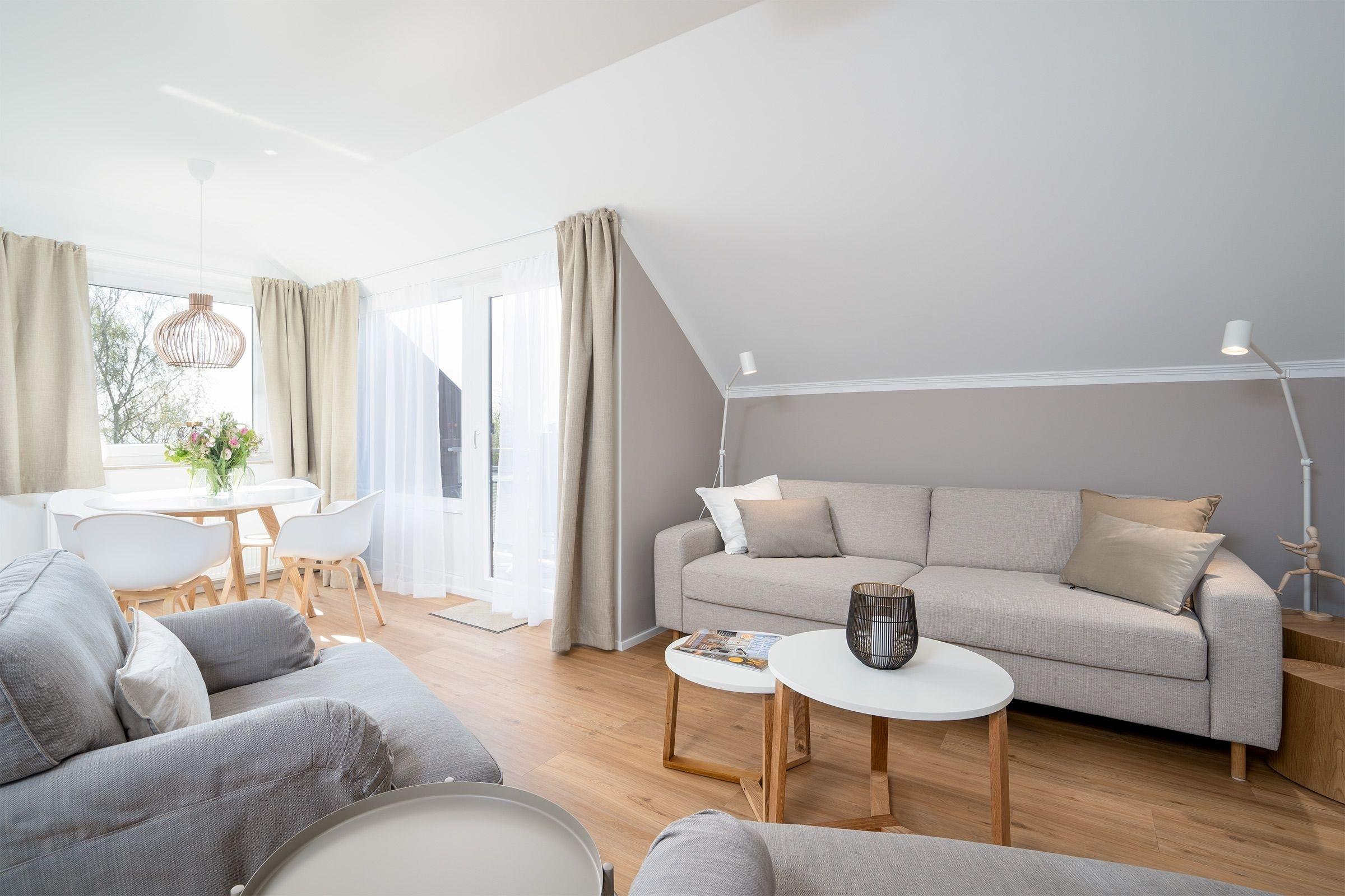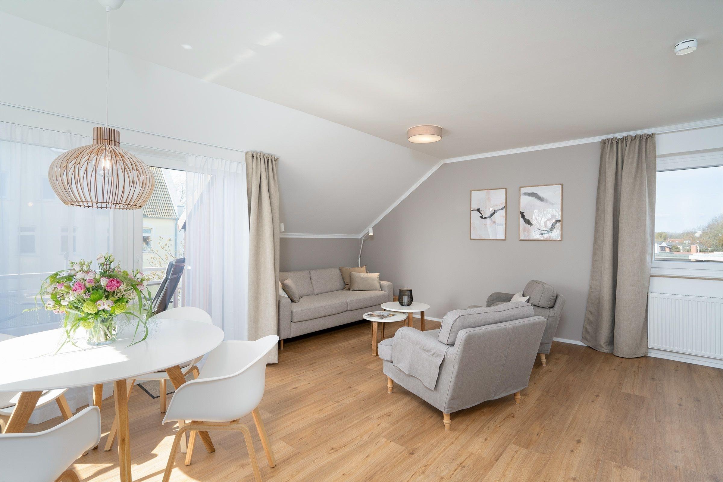 Der helle, großzügige Wohn-/Schlafbereich ist mit einer gemütlichen Schlafcouch (ca. 160x200 cm) und Flachbild-TV ausgestattet. Der Esstisch bietet ausreichend Platz für 4 Personen mit tollem Panoramablick auf die Ostsee. Von hier aus gelangen Sie auch auf den möblierten Süd-Balkon. Im Schlafzimmer mit zusätzlichem TV und DVD-Player können die zwei Einzelbetten (je 80x200 cm) zusammen oder aber auch getrennt gestellt werden. Starten Sie in den Tag im modernen Tageslicht-Bad mit Dusche, beleuchtetem Spiegel, Handtuchheizung und Waschmaschine. Die separate Küche bietet reichlich Platz zum Kochen und ist mit allen Annehmlichkeiten ausgestattet.