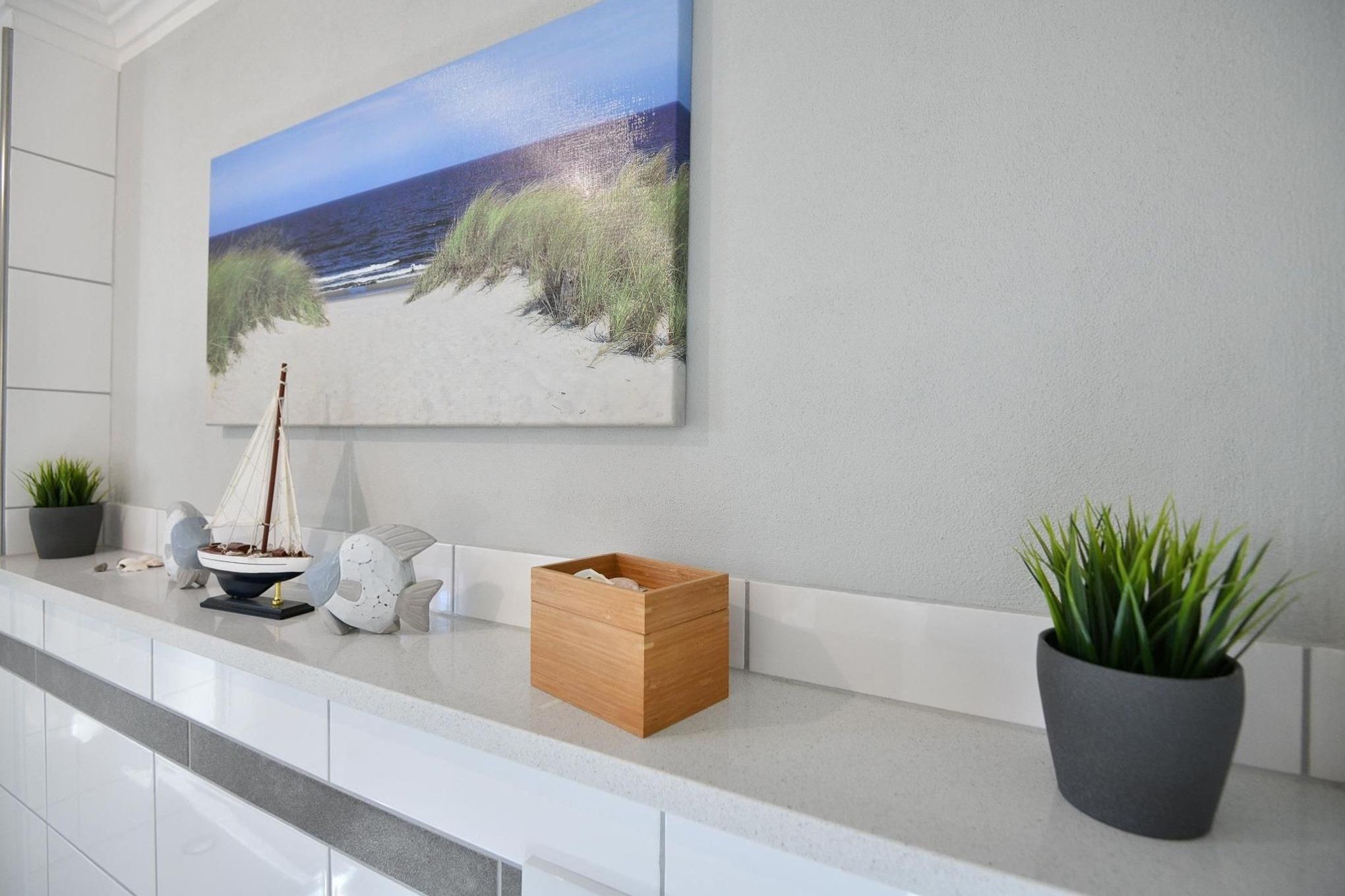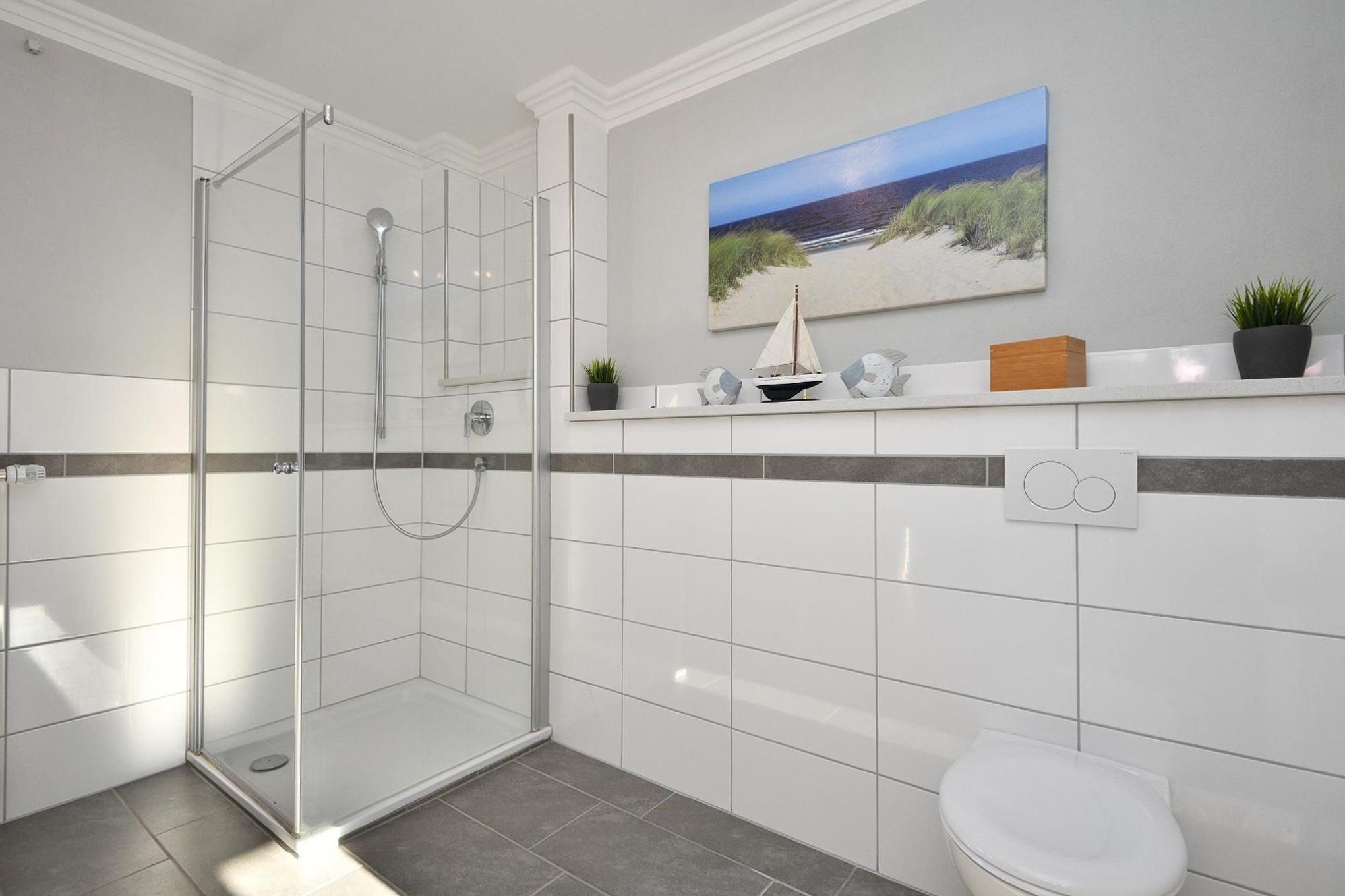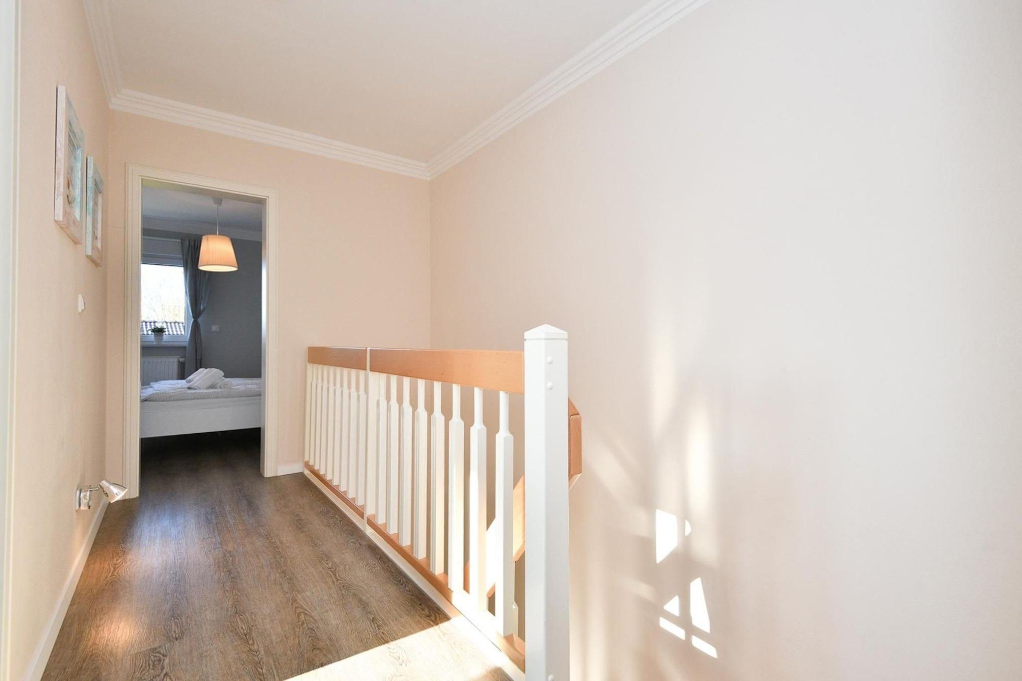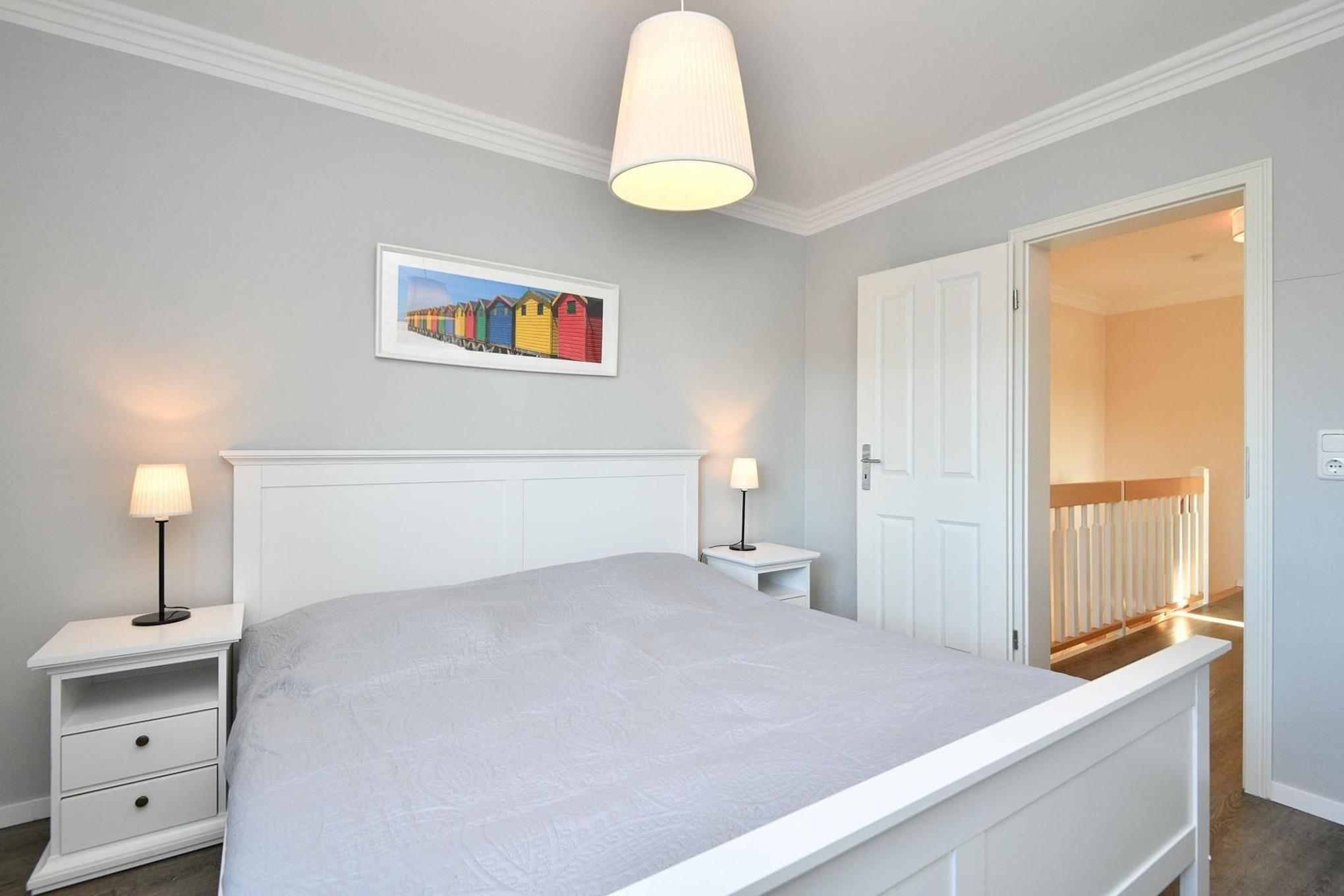 Hier bleiben keine Wünsche offen. Das traumhafte Objekt verfügt im Erdgeschoss über einen gemütlichen Wohnbereich mit einer Schlafcouch, die bei Bedarf in ein Doppelbett (ca. 140x200 cm) verwandelt werden kann. Magenta-TV und DVD-Player sorgen für Unterhaltung und Sonnenanbeter können auf der großen West-Terrasse die Seele baumeln lassen. Die angrenzende, gut ausgestattete Küche mit Geschirrspüler ist zum Wohnbereich hin offen gestaltet. Ferner gibt es ein Bad mit bodentiefer Dusche. Im Obergeschoss befinden sich die Schlafräume: ein Elternschlafzimmer mit Doppelbett (2x 90x200 cm) und Zugang zum kleinen Kinderzimmer sowie ein Kinderzimmer mit einem Einzelbett (90x200 cm) und einem Etagenbett (je 90x200 cm). Der Hauswirtschaftsraum mit Waschtrockner (Münzautomat), Kinder-Hochstuhl etc. grenzt an das 2. Duschbad.