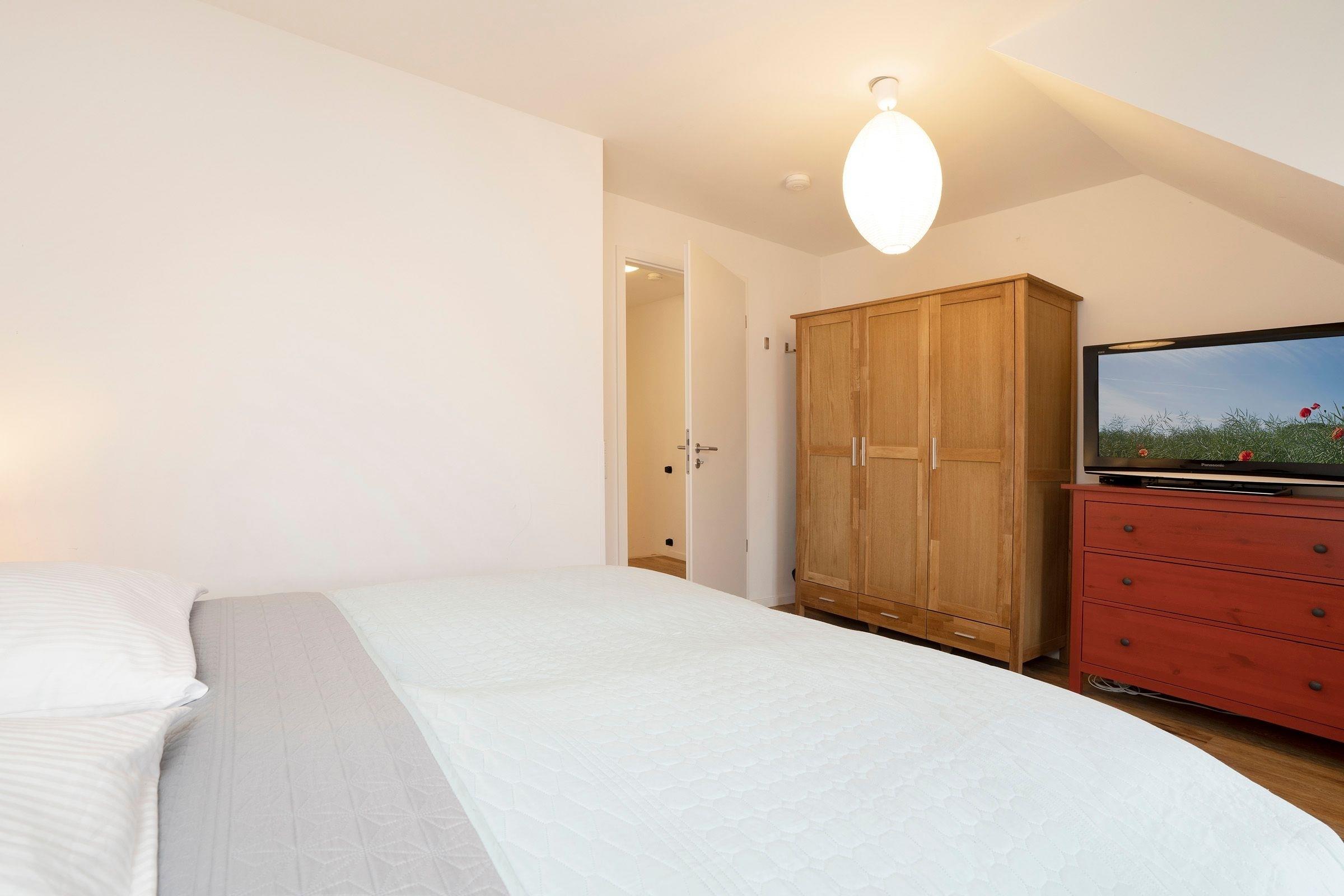 Schlafzimmer 1: 1 Doppelbett (ca. 180x200 cm), TV, Kleiderschrank, Verdunkelungsmöglichkeit
