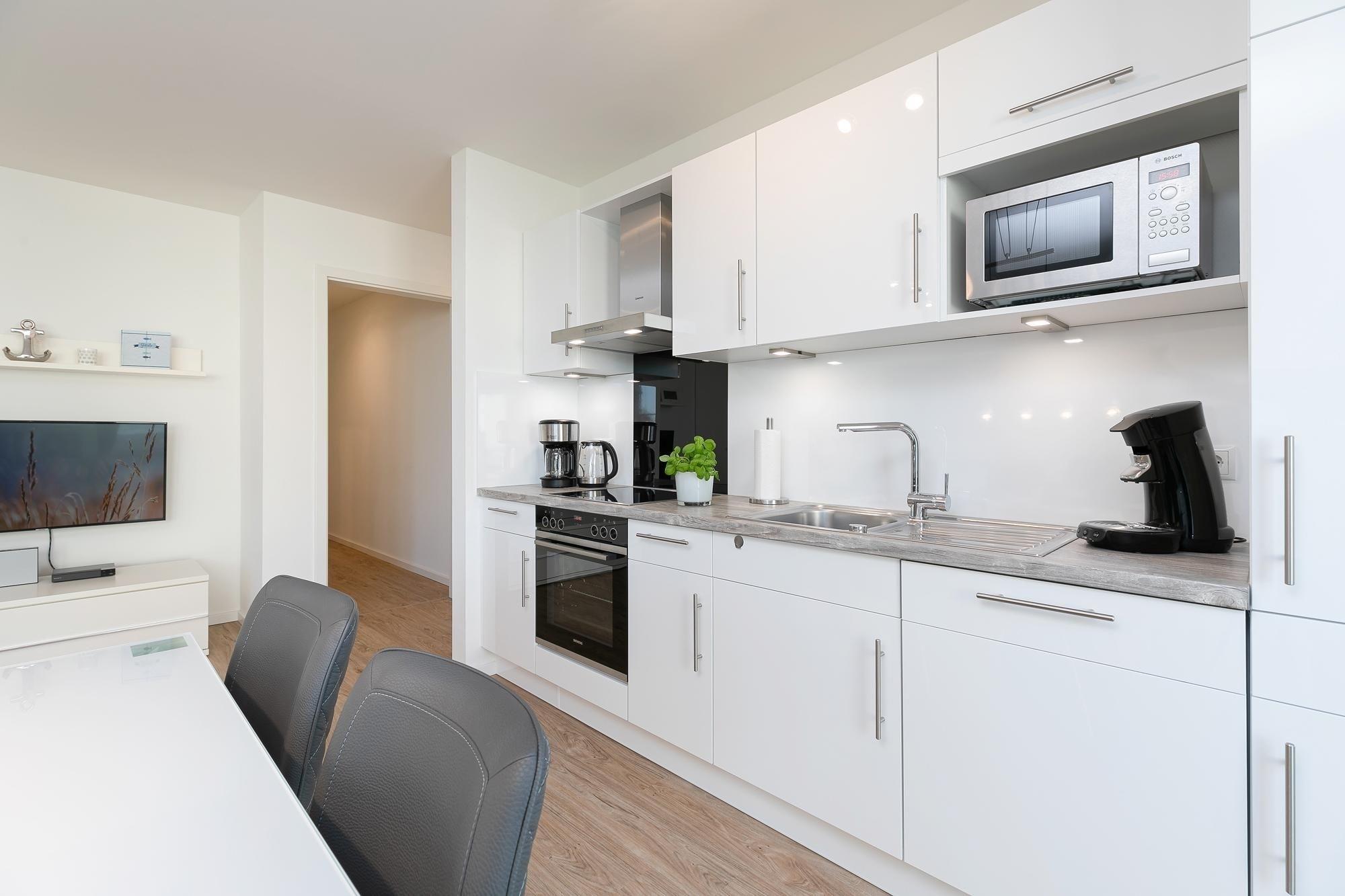 Ostsee-Urlaub pur. Die liebevoll eingerichtete Ferienwohnung im maritimen Stil besticht durch die schicke Sofa-Landschaft und den gemütlichen TV-Sessel – hier lassen sich entspannte Stunden verbringen. Gleich nebenan lädt eine elegante Sitzecke zu Spieleabenden oder natürlich auch zum Essen ein. Bereiten Sie in der offenen Küche Ihre Lieblings-Menüs zu – gemeinsam macht Kochen doch am meisten Spaß. Vielleicht geht es im Anschluss raus auf den möblierten Balkon? Hier kann man herrlich sitzen, genießen und plaudern. Erholsame Träume finden Sie garantiert in den beiden Schlafzimmern: In dem einen steht ein Boxspringbett (180x200 cm), in dem anderen 2 Einzelbetten (je 90x200 cm). Ein Gäste-WC und ein komfortables Duschbad mit Sauna komplettieren das wundervolle Angebot. Auch eine Waschmaschine steht Ihnen zur Verfügung und ein angenehmes Plus ist der Personenaufzug im Haus.