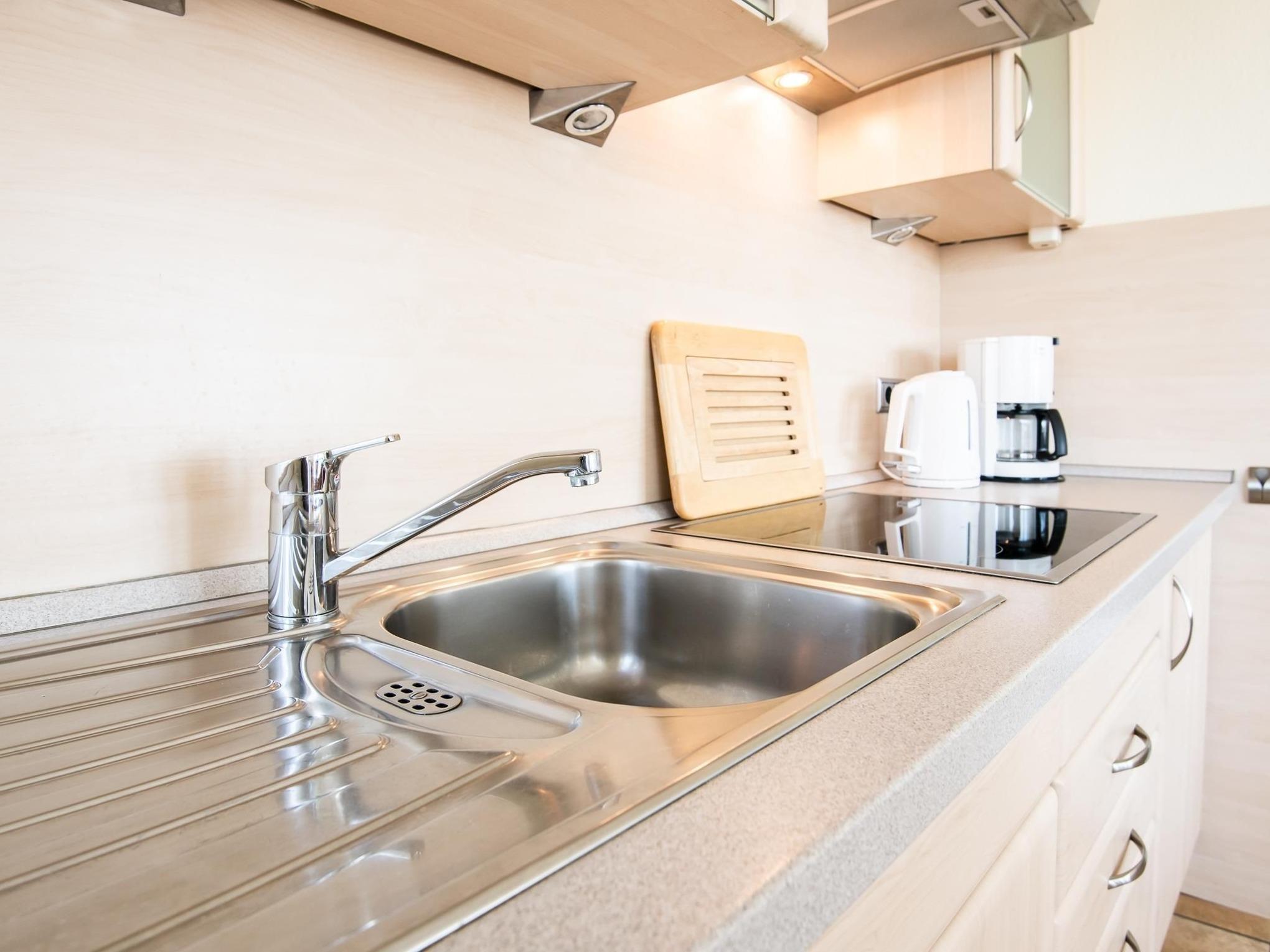 Treten Sie ein in das offen gestaltete Wohn-/Schlafzimmer mit hochwertiger Doppelbettcouch (ca. 180x200 cm), Kabel-TV, CD-Radio und lassen Sie den Alltag hinter sich. Hier finden Sie auch den direktem Zugang auf den sonnenverwöhnten Balkon, auf dem Sie Ihre Urlaubstage mit einem köstlichen Frühstück beginnen können. Die Küche ist mit angrenzender Essecke in den Wohnbereich integriert und bietet Annehmlichkeiten wie 4-Platten-Ceranfeld, Mikrowelle, Geschirrspüler, sowie Kühlschrank mit Gefrierfach. Das Schlafzimmer garantiert mit bequemem Doppelbett (ca. 180x200 cm) maximale Erholung nach ereignisreichen Urlaubstagen. Das tageslichthelle Badezimmer sorgt mit praktischen Alltagshelfern wie beleuchtetem Spiegelschrank, geräumiger Dusche und Handtuchheizung für gute Laune am Morgen.
