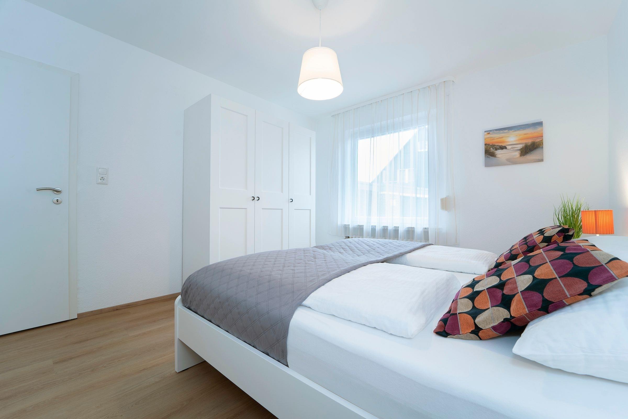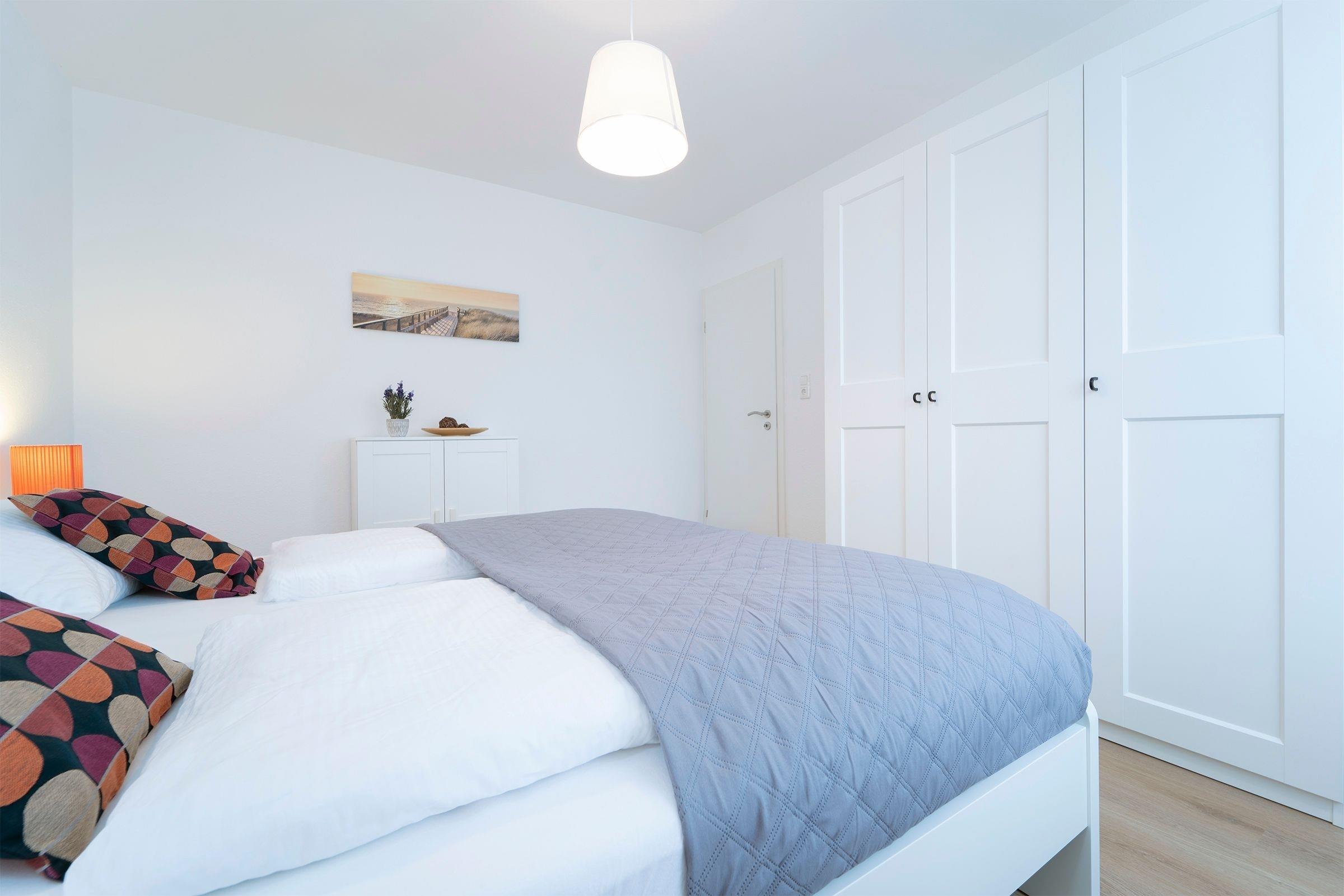 Der offene Wohn-/Ess- und Kochbereich empfängt Sie in freundlicher, gemütlicher Atmosphäre. Eine Sofalandschaft lädt zu entspannten Abenden mit guten Gesprächen oder spannendem Fernsehprogramm ein. Am Esstisch können Sie ausgiebig die gemeinsamen Mahlzeiten genießen. Für die Zubereitung steht Ihnen die moderne, gut ausgestattete Küche zur Verfügung. Hier wird es dem Hobbykoch an nichts fehlen. Auf der möblierten Terrasse können Sie den Urlaubstag bei einem guten Glas Wein ausklingen lassen. Zur Nachtruhe können Sie sich in eins der zwei separaten Schlafzimmer zurückziehen. Eins ist mit einem großem Doppelbett (2x 90x200 cm) und eins mit 2 Einzelbetten (je 90x200 cm) ausgestattet. Für die tägliche Körperhygiene wartet ein hellgefliestes Duschbad auf Sie.