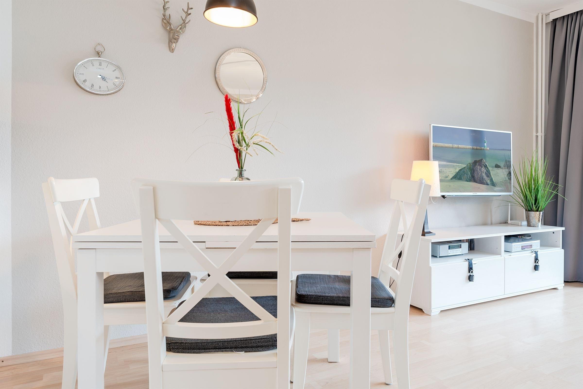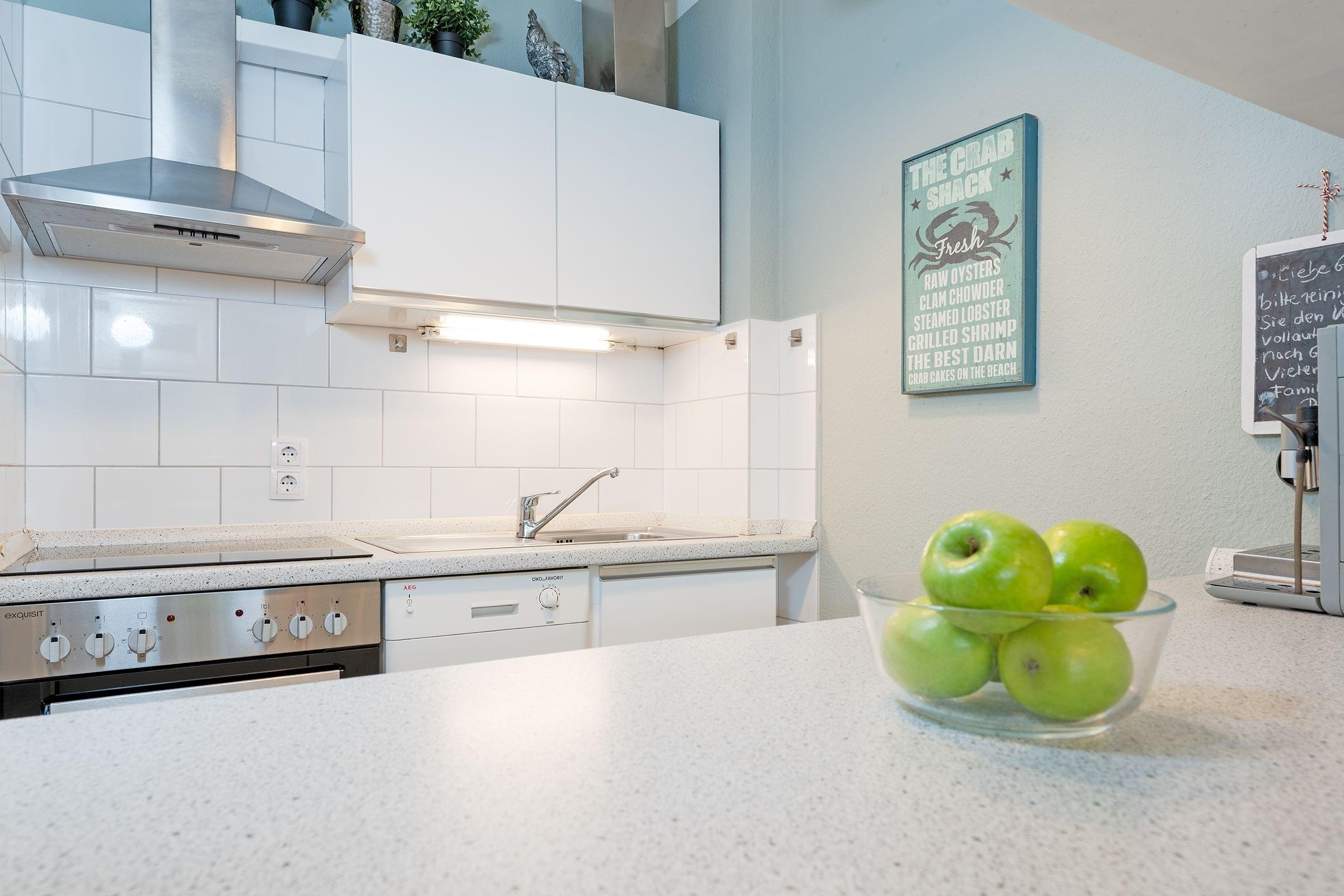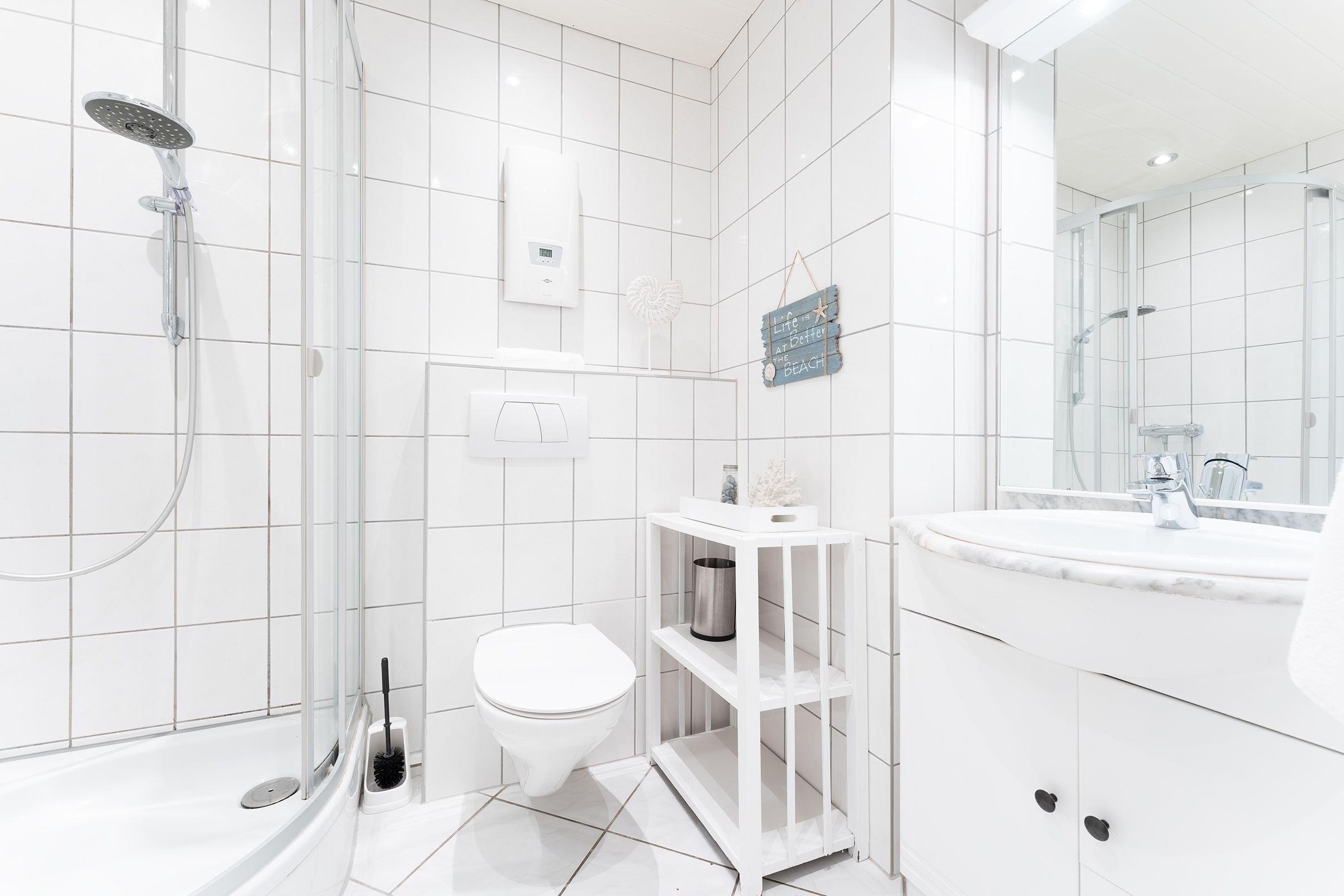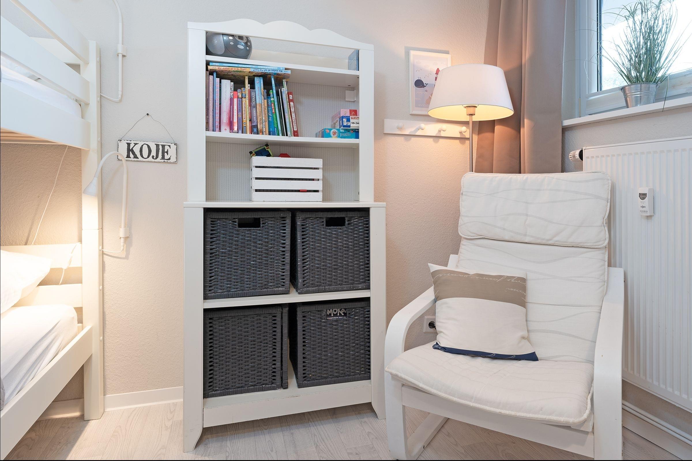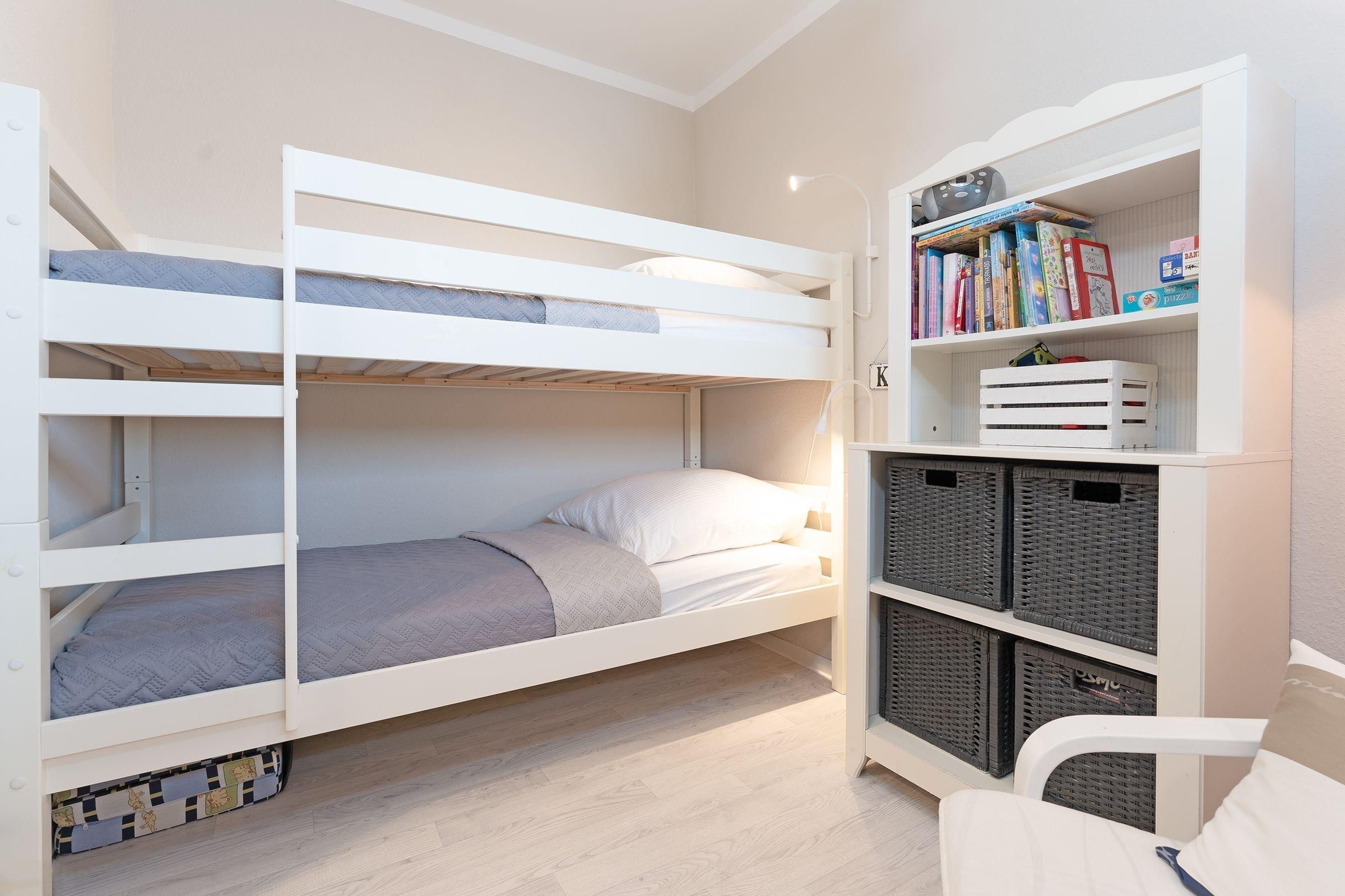 Nur 200 Meter vom Ostseestrand entfernt präsentiert sich diese zauberhafte Wohnung im Schützenweg 6. Die liebevoll ausgesuchte Einrichtung und die durchdachte Raumaufteilung werden Sie sofort begeistern. Der großzügige Wohn-/Ess-/Schlafbereich besticht durch seine kuschelige Polstergarnitur, auf der Sie sich herrlich entspannen können. Ein Smart-TV, ein DVD-Player sowie ein Radio mit CD-Player sorgen dabei für die gewünschte Unterhaltung. Gleich nebenan haben Sie Zutritt auf die große möblierte Balkon-Loggia in südlicher Lage. Hier können Sie bei Sonnenschein und auch bei nicht so gutem Wetter wunderbar geschützt sitzen und Ihre wohlverdiente Auszeit genießen. Die helle Küche mit Spülmaschine befindet sich im Wohnbereich, ist aber optisch abgeschirmt. Bereiten Sie dank der guten Ausstattung hier mit Freude Ihre Lieblingsspeisen zu und schlemmen Sie im Anschluss in der gemütlichen Essecke davor. Auch Ihre Nachtruhe finden Sie in diesem großartigen Zimmer: Das Doppelbett (2x 90x200 cm) im Himmelbett-Look sorgt für ein märchenhaftes Schlaferlebnis. Im separaten Kinderschlafzimmer steht ein Etagenbett (2x 90x200 cm), auch befinden sich hier ein paar Bücher und Spiele. Das freundliche Duschbad mit Handtuchwärmer ist hell gefliest.
