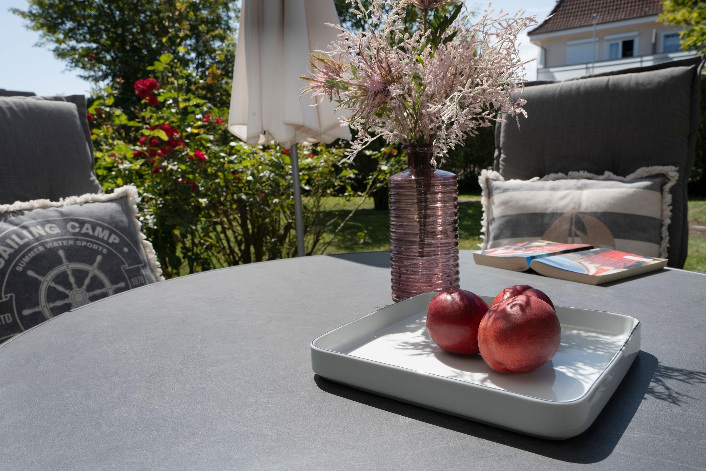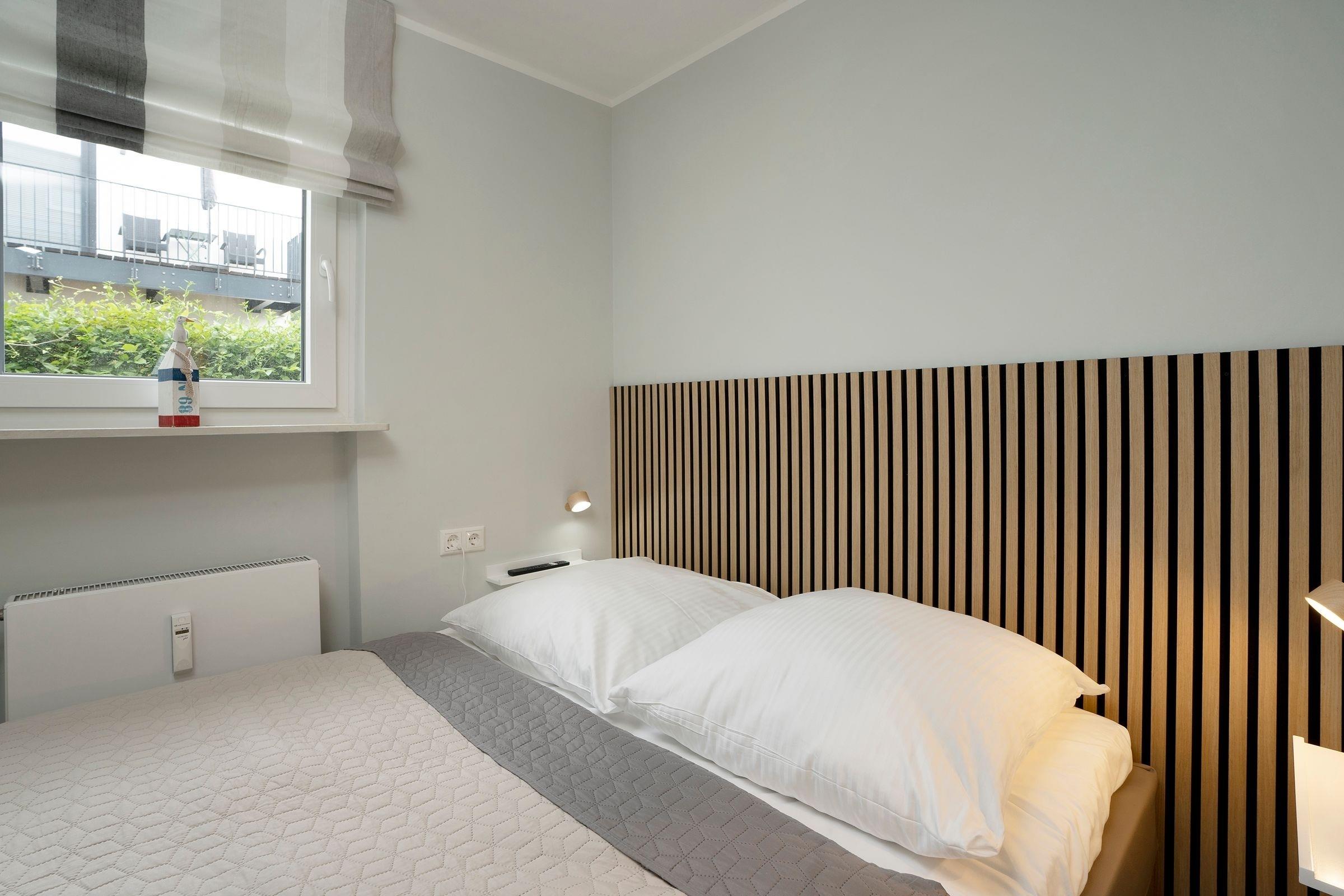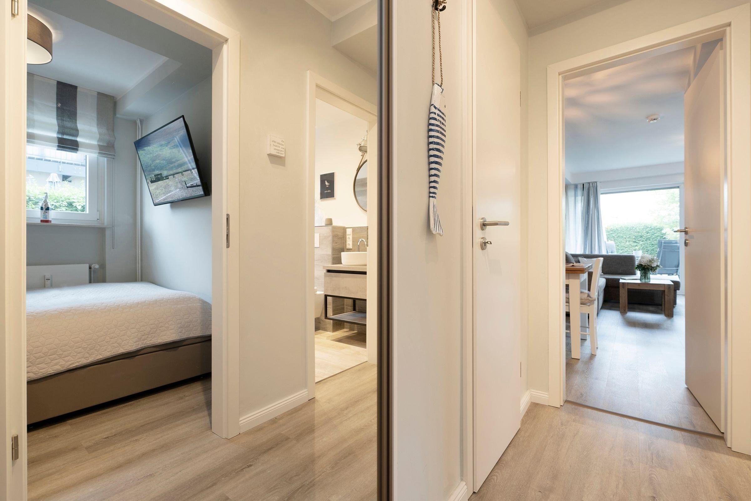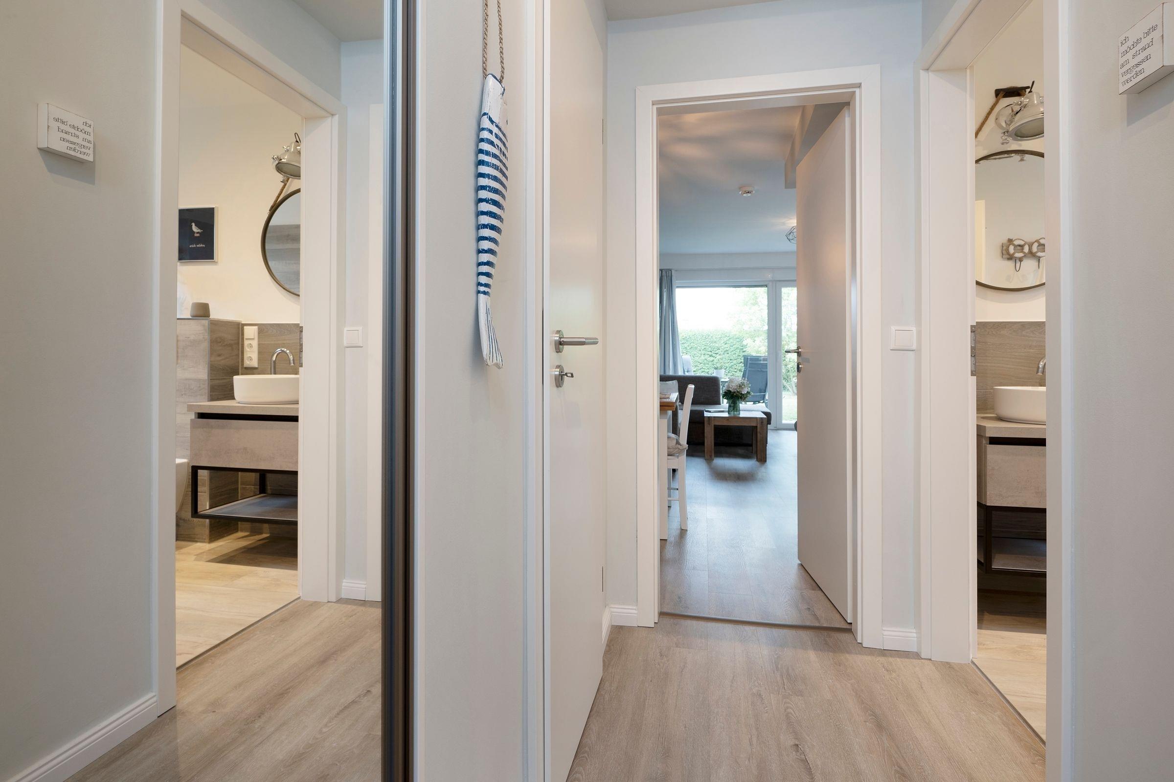 Herzlich Willkommen in Ihrem wohlverdienten Urlaub. Der modern gestaltete Wohnbereich empfängt Sie mit einer gemütlichen Couchecke, die ideal für gesellige Filmabende nach einem schönen Urlaubstag geeignet ist. Das Doppelschrankbett (ca. 160x190 cm) verwandelt diesen Raum im Handumdrehen in einen bequemen Schlafplatz für zwei Personen. Von hier aus gelangen Sie auf die möblierte Terrasse, auf der Sie viele Sonnenstunden genießen können. Die in den Wohnbereich integrierte Küche ist mit Backofen, Geschirrspüler, 4- Platten-Herd, usw. gut ausgestattet. Das separate Schlafzimmer ist mit einem komfortablen Boxspringbett (ca. 160x200cm) möbliert. Das tageslichthelle Badezimmer bietet Annehmlichkeiten wie eine Badewanne, einen beleuchteten Spiegel und eine praktische Handtuchheizung.