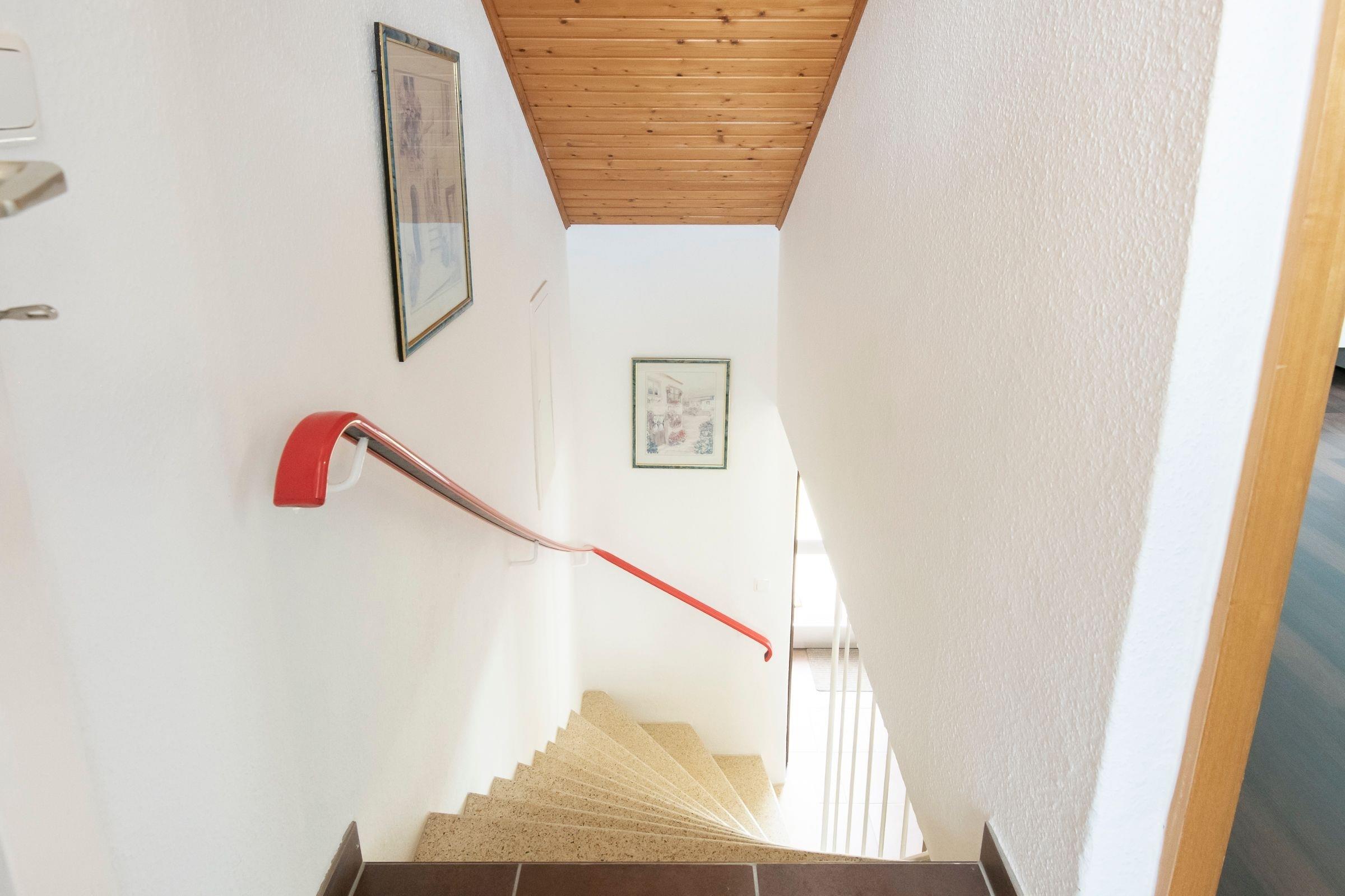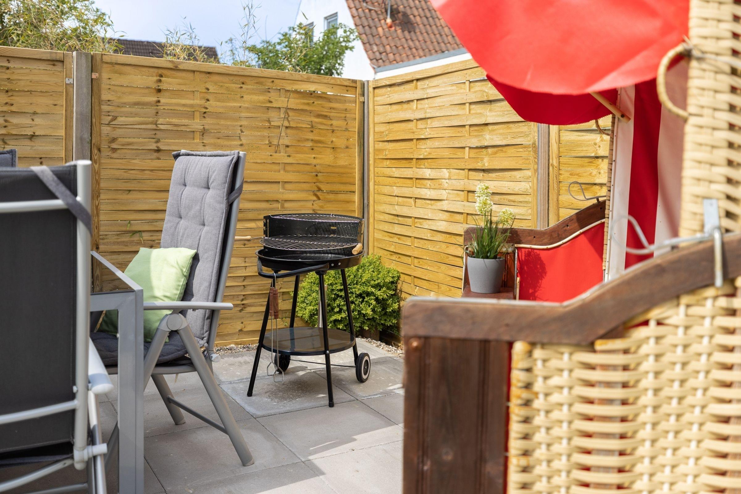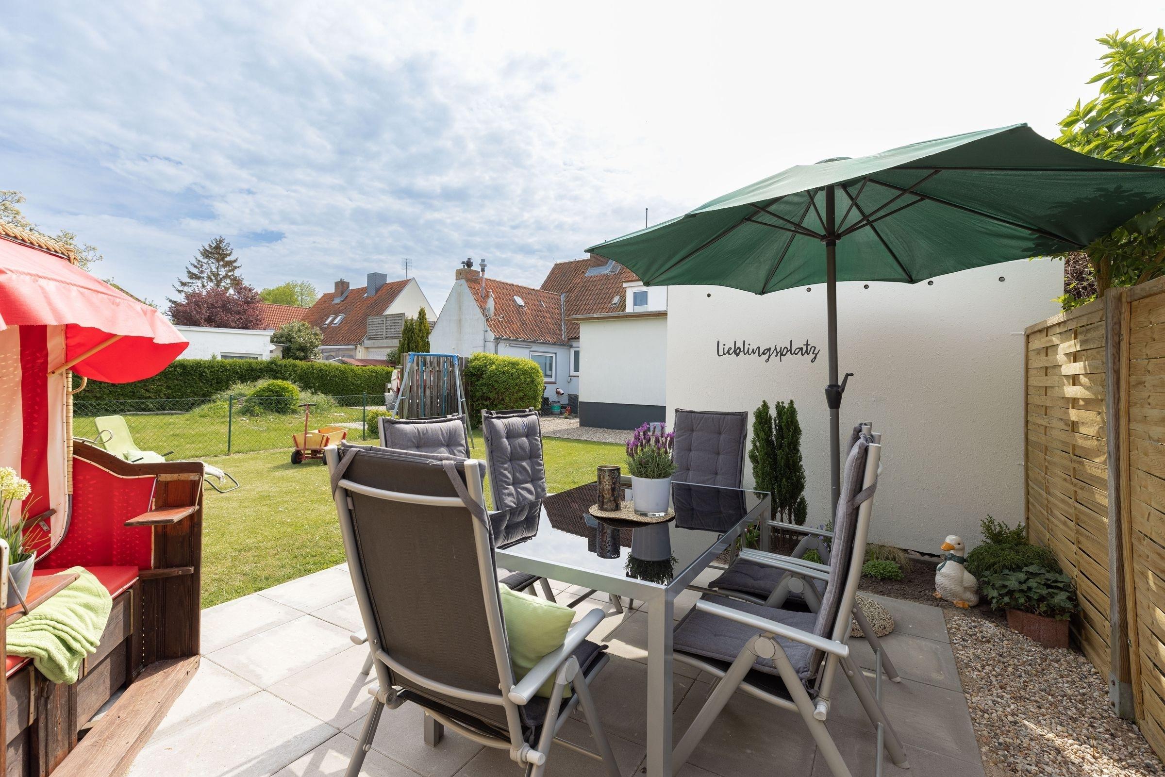 Das Erdgeschoss verfügt über einen großen Wohn- und Essbereich mit TV und Stereo-Anlage, Einbauküche mit Geschirrspüler, Ceranfeld mit Backofen, Mikrowelle, Kühlschrank mit Gefrierfach, Kaffeemaschine, Toaster etc.. Ein Schlafzimmer mit Doppelbett (2x 90x200 cm) und direktem Zugang zum großzügigen Duschbad mit WC, Waschmaschine und Trockner befindet sich ebenfalls im Erdgeschoss, sowie ein separates Gäste-WC. Die Zimmer im Erdgeschoss lassen sich durch Außenjalousien verdunkeln. Im Obergeschoss hat 1 Schlafzimmer ein Einzelbett (90x200 cm) und das weitere Schlafzimmer zwei getrennt stehende Betten (je 90x200 cm) mit Wand-TV und Zugang zur sonnigen Loggia. Ferner gibt es dort ein kleines Duschbad. Besonderes Highlight dieser Wohnung ist der Grillplatz mit einem Strandkorb im Garten. Für die Kleinen stehen außerdem 2 Kinderbettchen, 2 Hochstühle und ein Bollerwagen bereit, ein Treppenschutzgitter sorgt für ausreichend Sicherheit im Haus.
