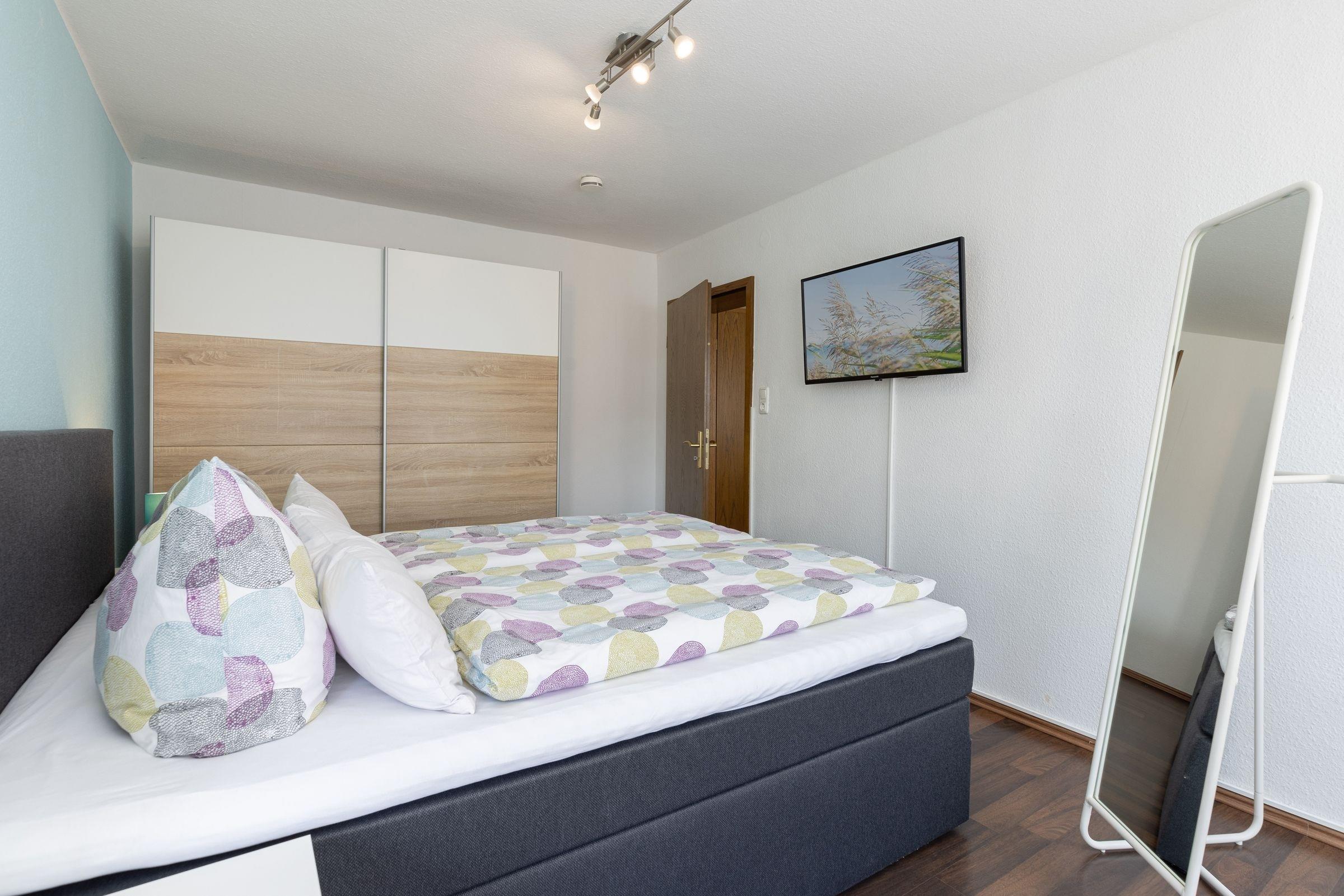 Schlafzimmer 1 EG: Boxspringbett (2x 90x200 cm), durchgehender Topper, TV, Verdunkelung (Außen Rollläden)