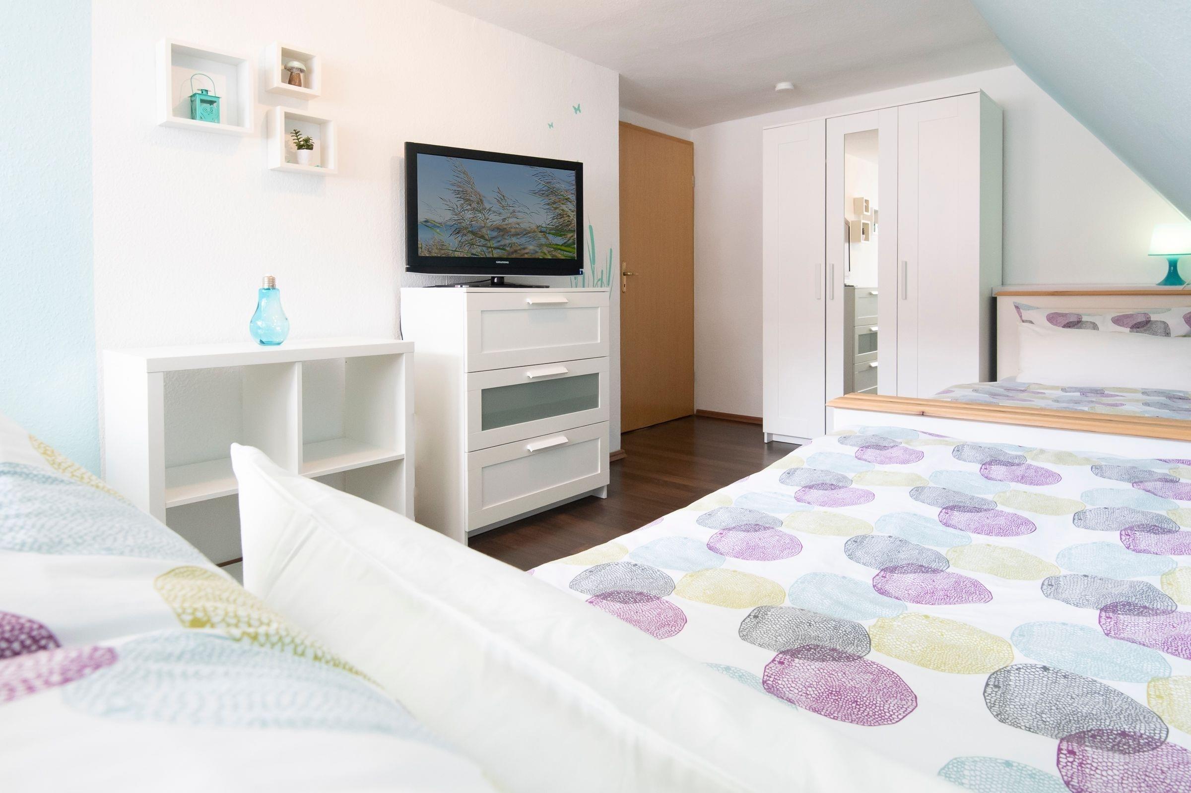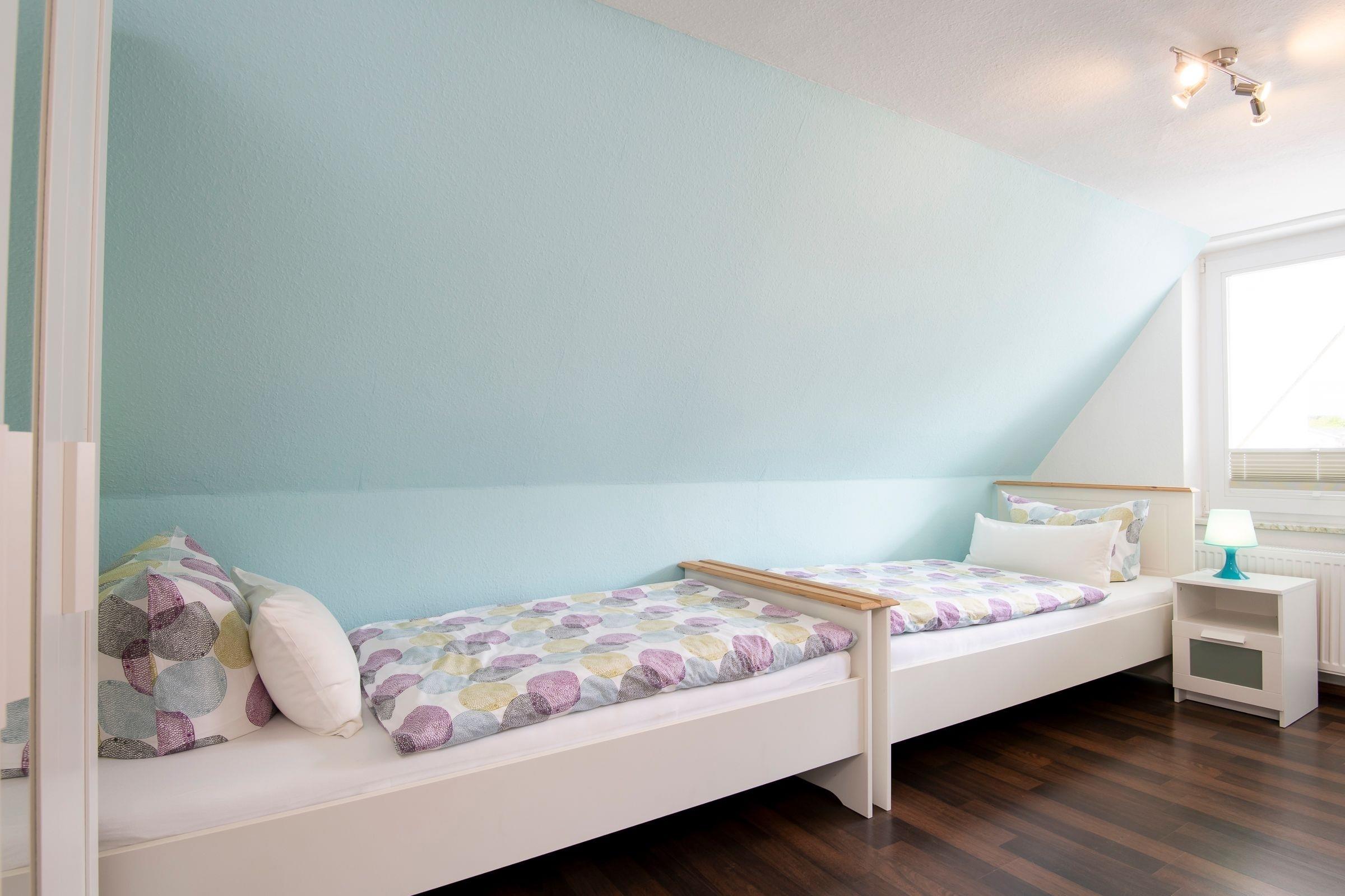 Schlafzimmer 2 DG: 2 Einzelbetten (je 90x200 cm), Lattenrost Kopf- u. Fußteil verstellbar, TV, Verdunkelungsplissees