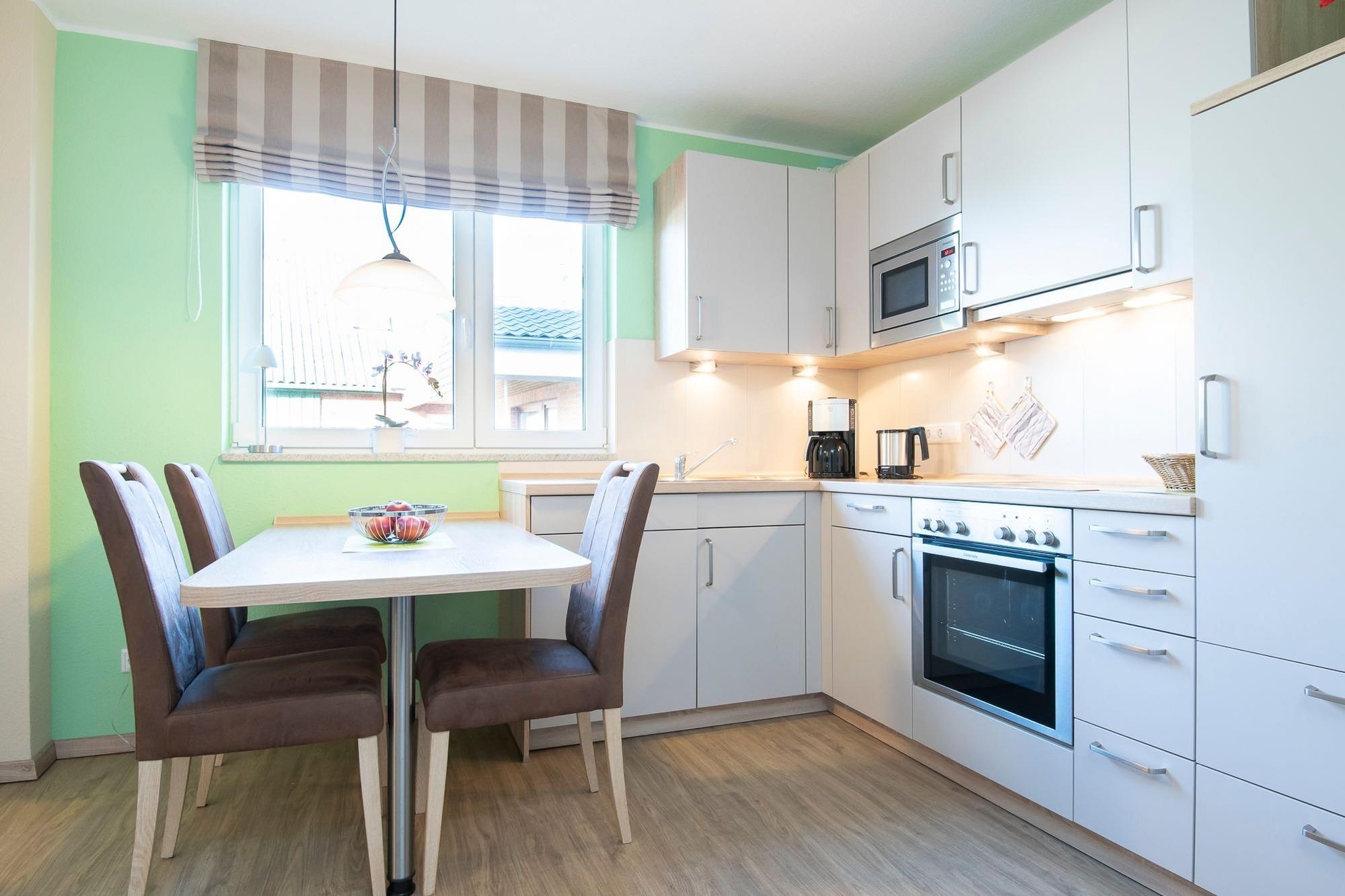 Eine schicke Ferienwohnung begrüßt Sie mit großzügigem Wohn- und Essbereich. Die gemütliche Sofaecke mit Fernseher garantiert entspannte Stunden nach erlebnisreichen Urlaubstagen. Treten Sie raus auf den möblierten Balkon mit westlicher Ausrichtung, auf dem Sie die letzten Sonnenstrahlen des Tages bei einem Glas Wein genießen können. Die an den Wohnbereich angrenzender Einbauküche ausgestattet mit Ceranfeld und Backofen, Mikrowelle, Geschirrspüler, Kaffeemaschine etc. lädt zu geselligen Kochabenden ein. Im separaten Schlafzimmer mit Doppelbett (2x 100x200 cm) in Komforthöhe, Fernseher und franz. Balkon verbringen Sie ruhige Nächte. Das geräumige Duschbad mit bodentiefer Dusche, Fußbodenheizung, beheizbaren Handtuchhalter und zusätzlichem Abstellraum rundet das Angebot der Wohnung ab. Der WLAN-Anschluss ist inklusive.