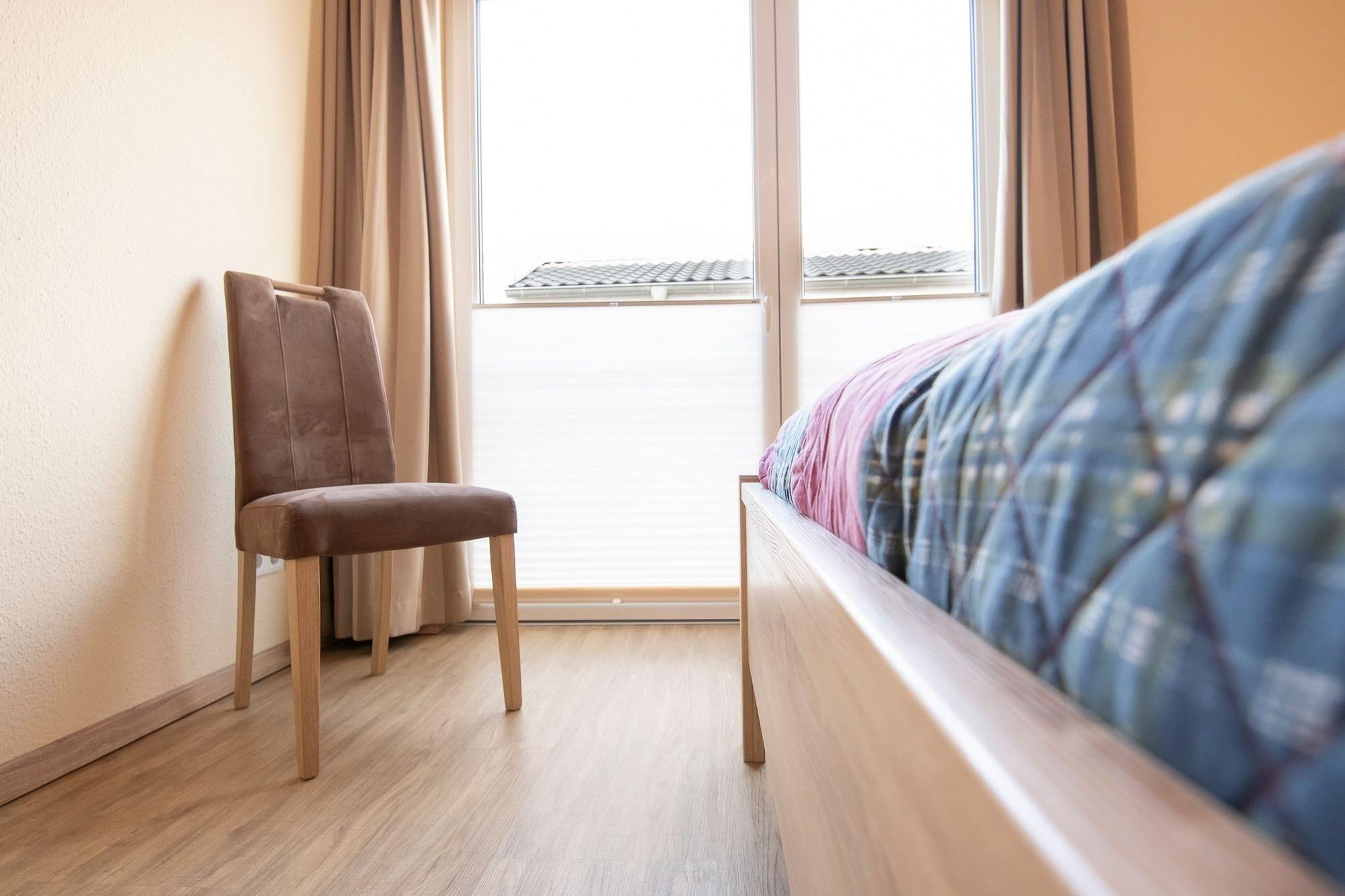 Schlafzimmer: 1 Doppelbett (2x 100x200 cm), Bett höhe (Fußboden - OK Matratze) ca. 60 cm, Kleiderschrank, Verdunkelung (Plissee, Gardine)