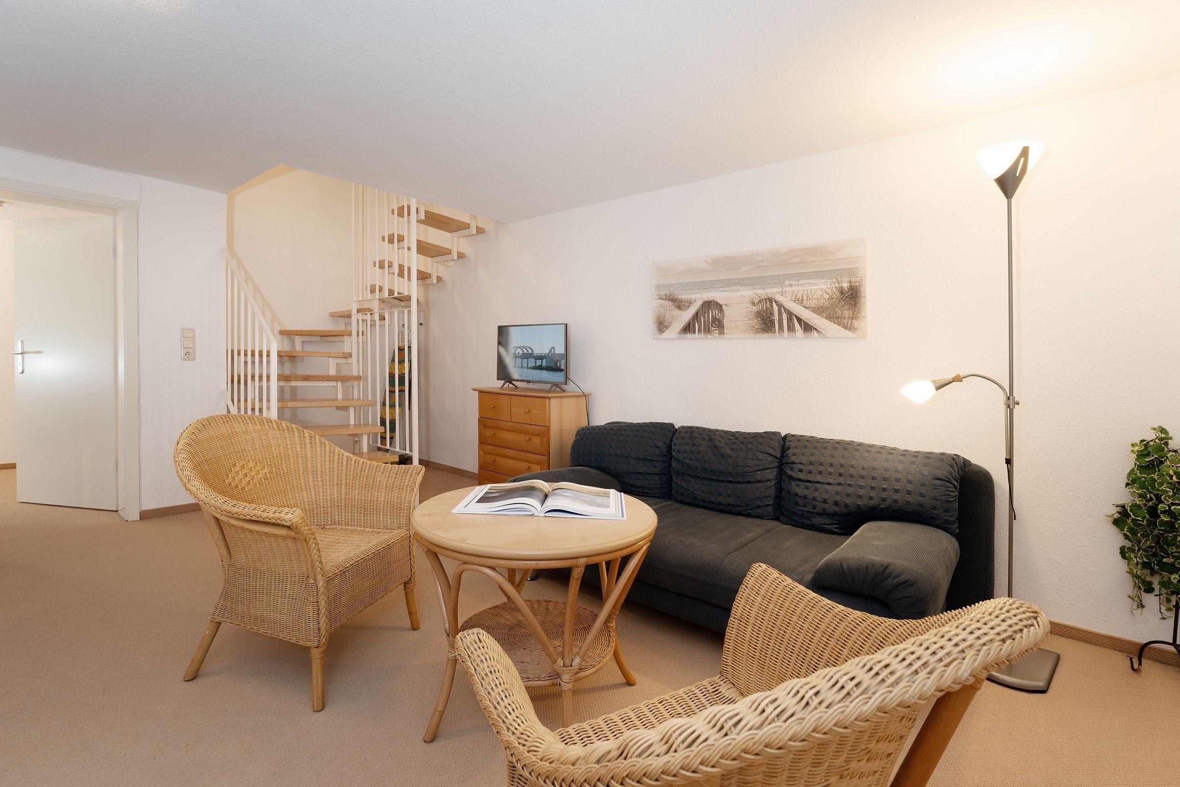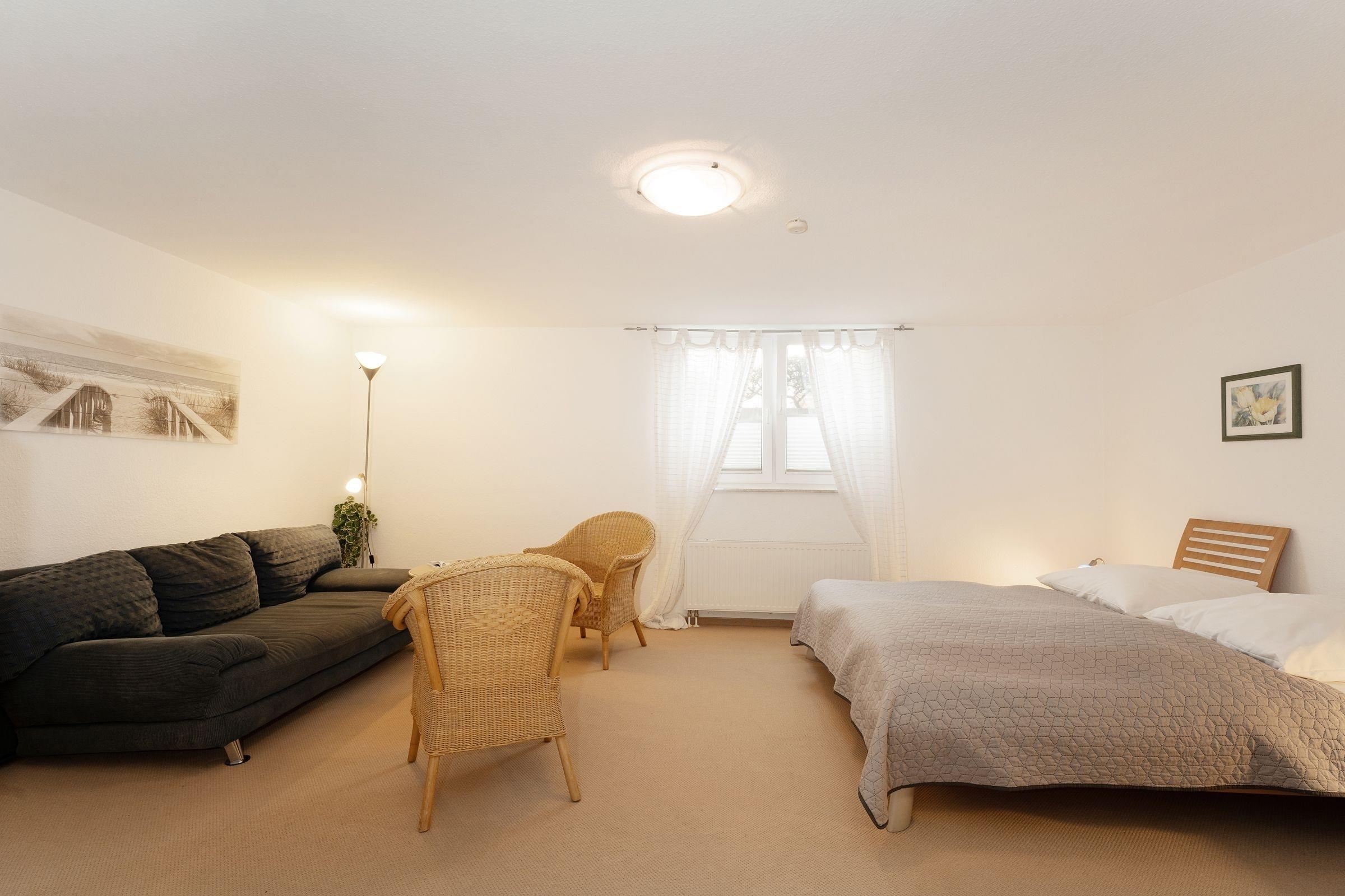 Vom Wohnungsflur aus führt eine Treppe ins wohnlich gestaltete Untergeschoss. Hier ist der offene Wohn-/Schlafbereich mit Sofa und Sesseln und zweitem TV gemütlich eingerichtet. In den Wohnraum integriert ist der Schlafbereich mit hochwertigem Doppelbett (2x 90x200 cm), Nachtisch mit Leselampe, sowie geräumigem Kleiderschrank. Ein zweites Schlafzimmer bietet mit einem Einzelbett (90x200 cm) in lauschiger Schlafnische, Leselampe, Kommode und Kleiderschrank einen weiteren schönen Schlafplatz. Der WLAN-Anschluss ist inklusive.