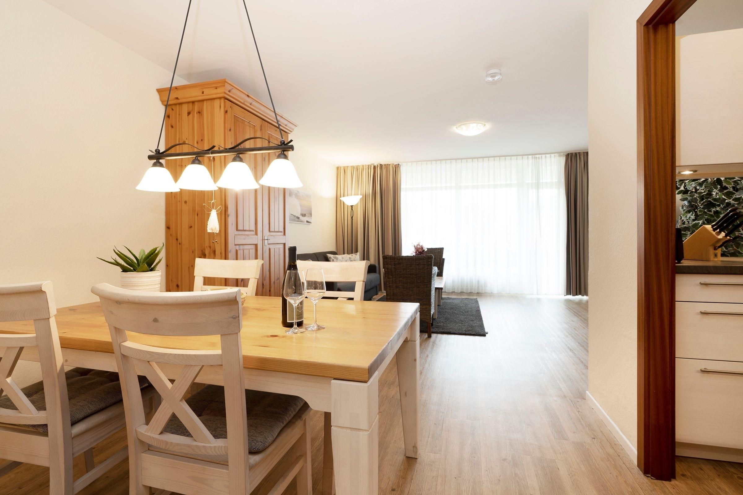 Sie werden von einem großzügig gestalteten Wohn- und Essbereich mit Wohlfühlcharakter empfangen. Die Sofaecke im Wohnzimmer bietet den perfekten Ort, um nach einem ereignisreichen Tag am Meer bei einem Film zu relaxen. Die Schlafcouch (ca. 160x200 cm) lässt sich mit nur wenigen Handgriffen zu einem gemütlichen Schlafplatz umwandeln. Wenn Sie noch nicht genug Meeresluft hatten, können Sie diese auf dem großzügigen Balkon mit Südlage auch ganz entspannt zuhause genießen. Lassen Sie ihren kulinarischen Ideen freien Lauf in der modernen Einbauküche mit Ceran-Kochfeld, Backofen, Mikrowelle, Geschirrspüler, Kaffeemaschine, Toaster etc. Außerdem verfügt dieses Feriendomizil über ein Schlafzimmer mit zwei getrennt stehenden Betten (je 90x200 cm) Das schöne Duschbad mit WC ist komfortabel und hell eingerichtet.