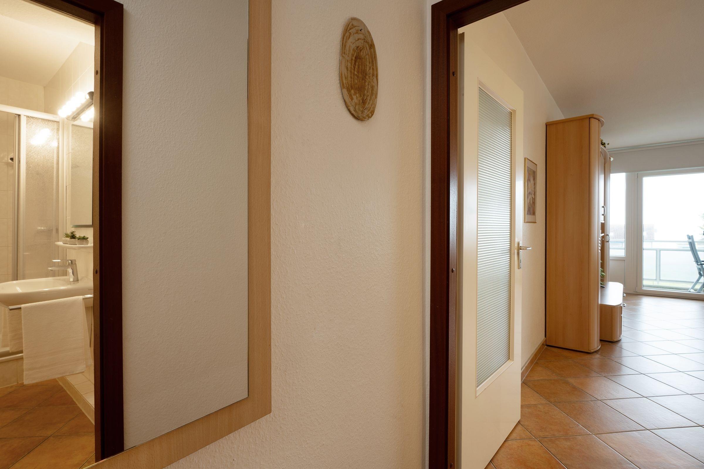 Der geschmackvoll eingerichtete Wohnbereich empfängt Sie mit einer bequemen Sitzecke mit TV-Gerät. Das Highlight der Wohnung ist sicherlich der Seeblick. Diesen können Sie drinnen vom Essplatz aus am großen Fenster genießen – oder aber natürlich draußen auf dem möblierten Balkon. Schnuppern Sie hier die Ostseeluft und lassen dabei den Tag bei guten Gesprächen ausklingen. Die separate Küche bietet alles, was für die Zubereitung Ihrer Mahlzeiten benötigt wird. Hier steht auch eine Spülmaschine, die Ihnen den Abwasch im Urlaub abnimmt. Zur Nacht hin finden Sie angenehme Ruhe im Doppelbett (2x 90x190 cm) im Moltke-Schlafzimmer, das bedeutet, es ist von 2 Seiten begehbar. Ein funktionales Duschbad rundet das Angebot ab.