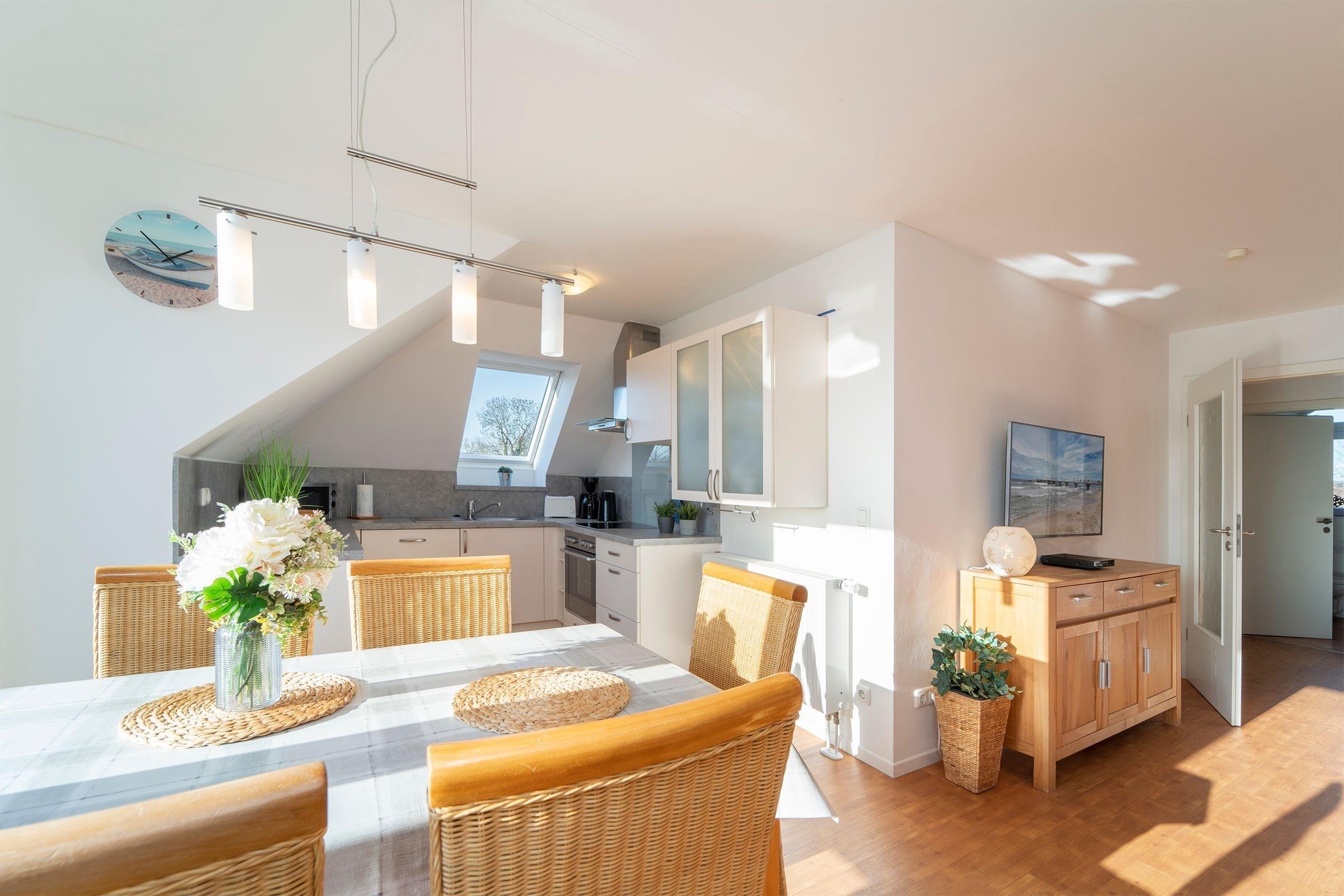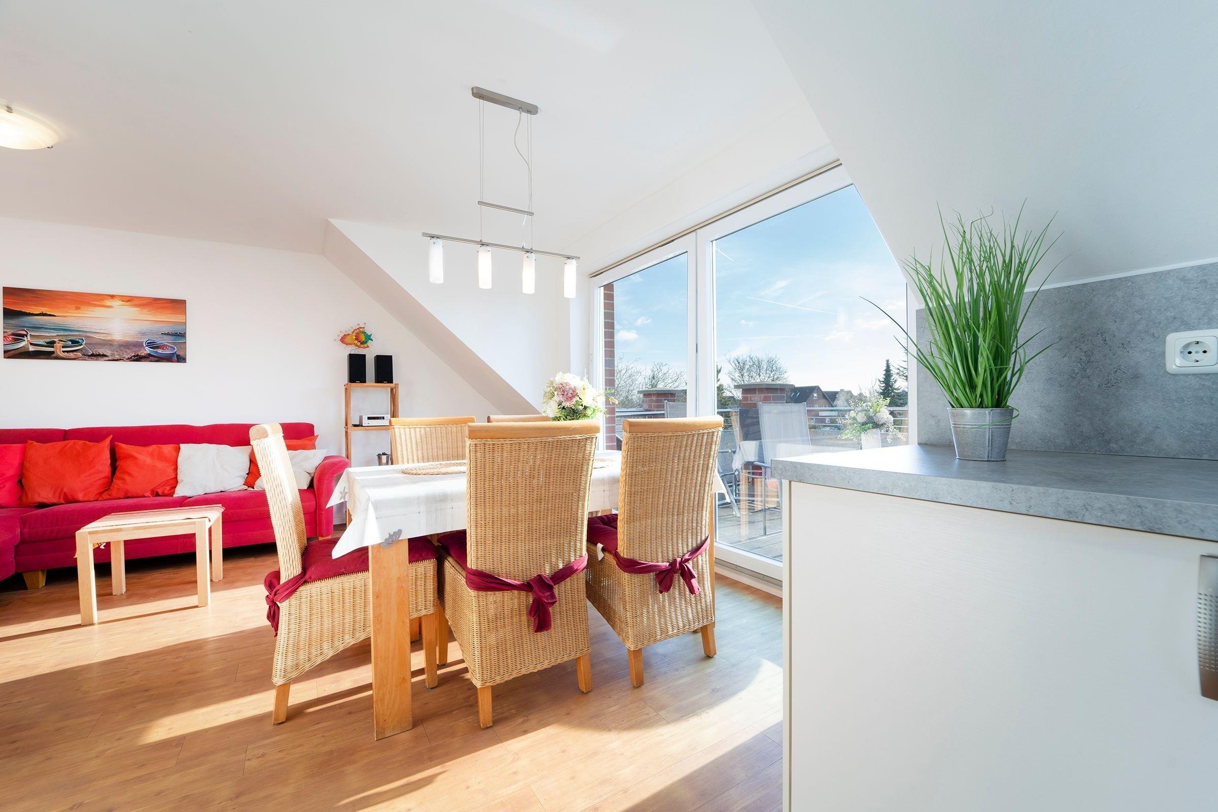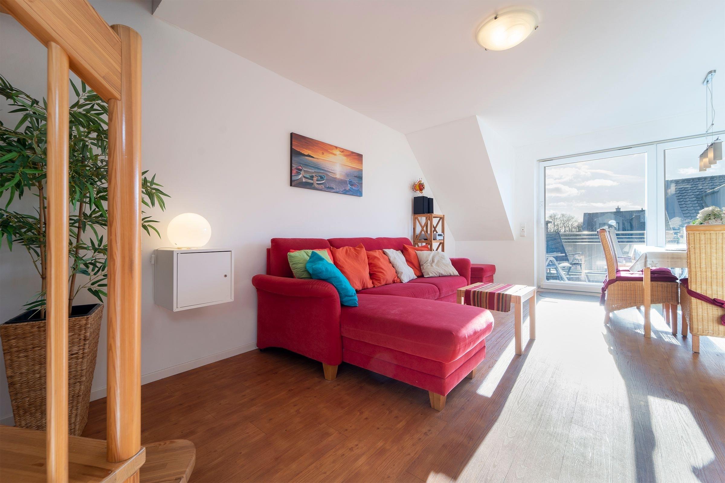 Eine Wohnung der Extraklasse! Diese Maisonette-Wohnung erstreckt sich über 2 Etagen und bietet Ihnen in der Eingangsebene einen großzügigen Wohn- und Essbereich mit großzügiger Couchgarnitur. Hier finden alle Urlaubsgäste einen Platz beim gemeinsamen Filmabend auf dem Flachbild-TV. Die moderne Einbauküche ist zum Wohnbereich hin integriert und lässt mit der guten Ausstattung keine kulinarischen Wünsche offen.