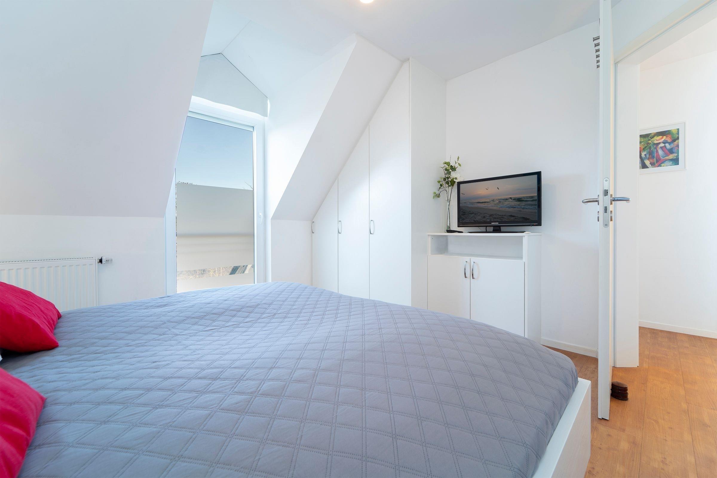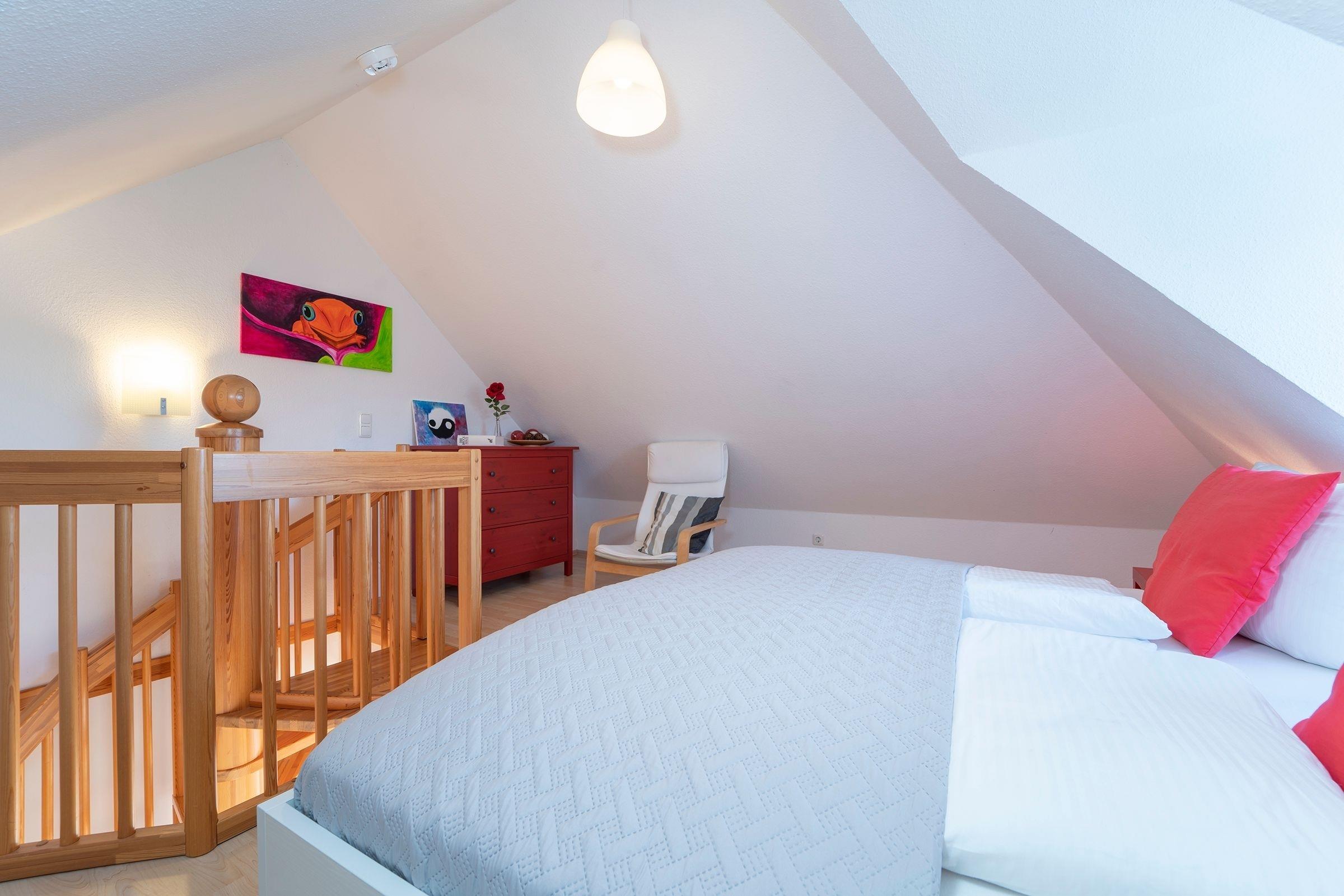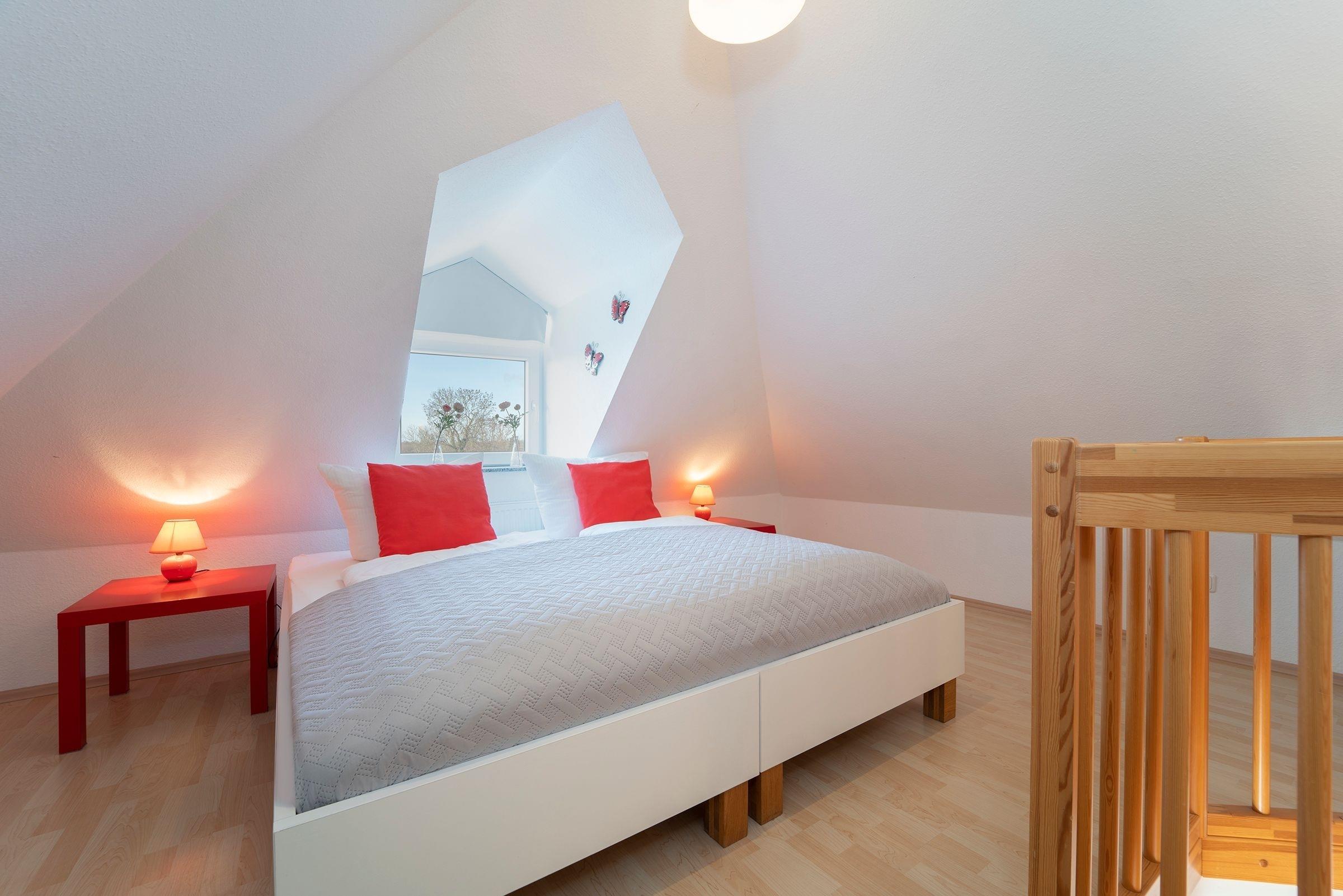 Das Hauptschlafzimmer ist mit einem Doppelbett (2x 90x200 cm) und einem Flachbild-TV ausgestattet, das zweite Schlafzimmer mit einem französischen Bett (140x200 cm). Das helle Duschbad mit WC ist auf der gleichen Ebene und verfügt auch über eine Waschmaschine. In der offenen Galerie (erreichbar über die Rundtreppe im Wohnzimmer) befindet sich ein weiterer Schlafbereich mit 2 getrennt stehenden Betten (je 90x200 cm). Mit einem Kinderbettchen sowie einem Hochstuhl ist in diesem Feriendomizil auch an die kleinen Urlaubsgäste gedacht.