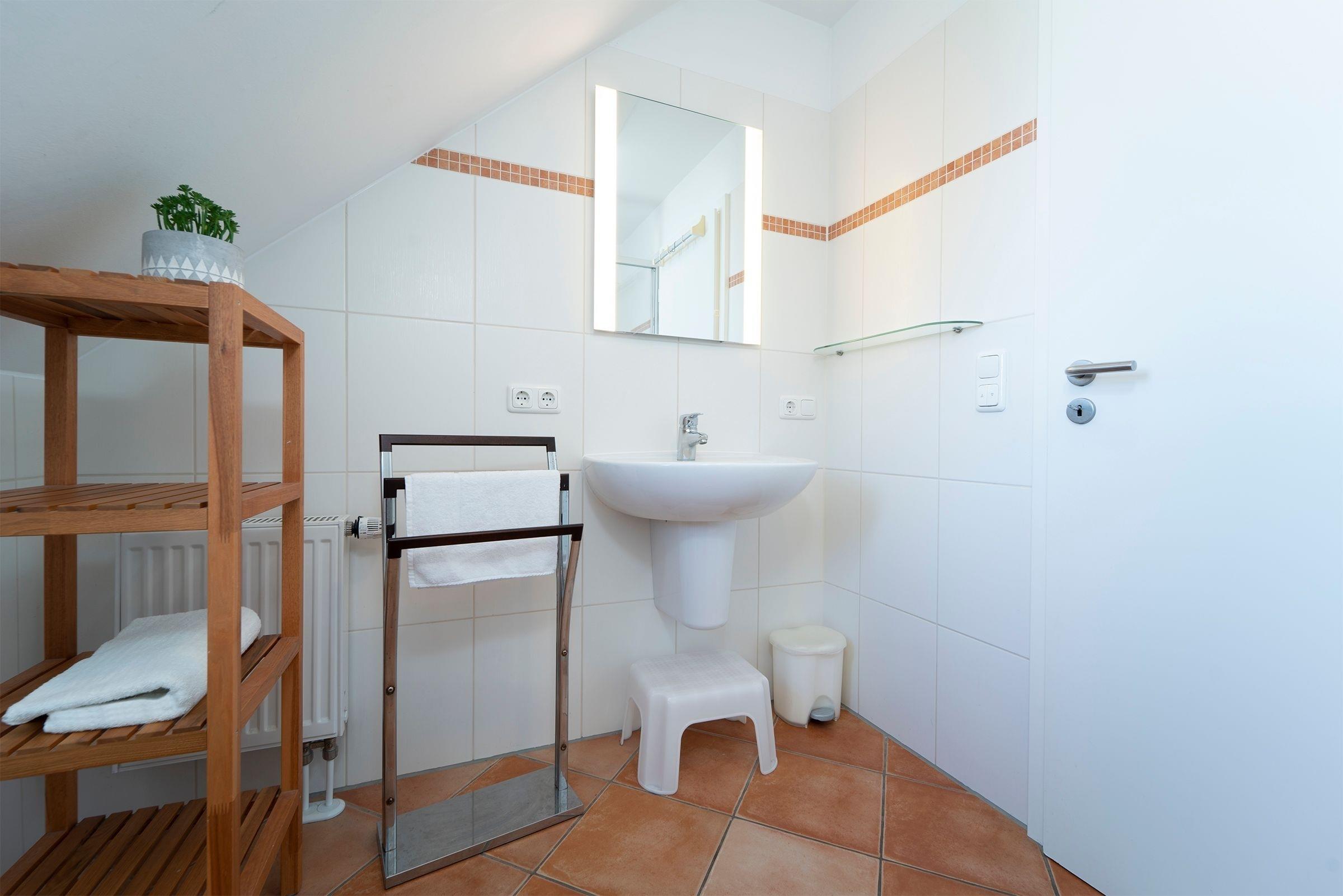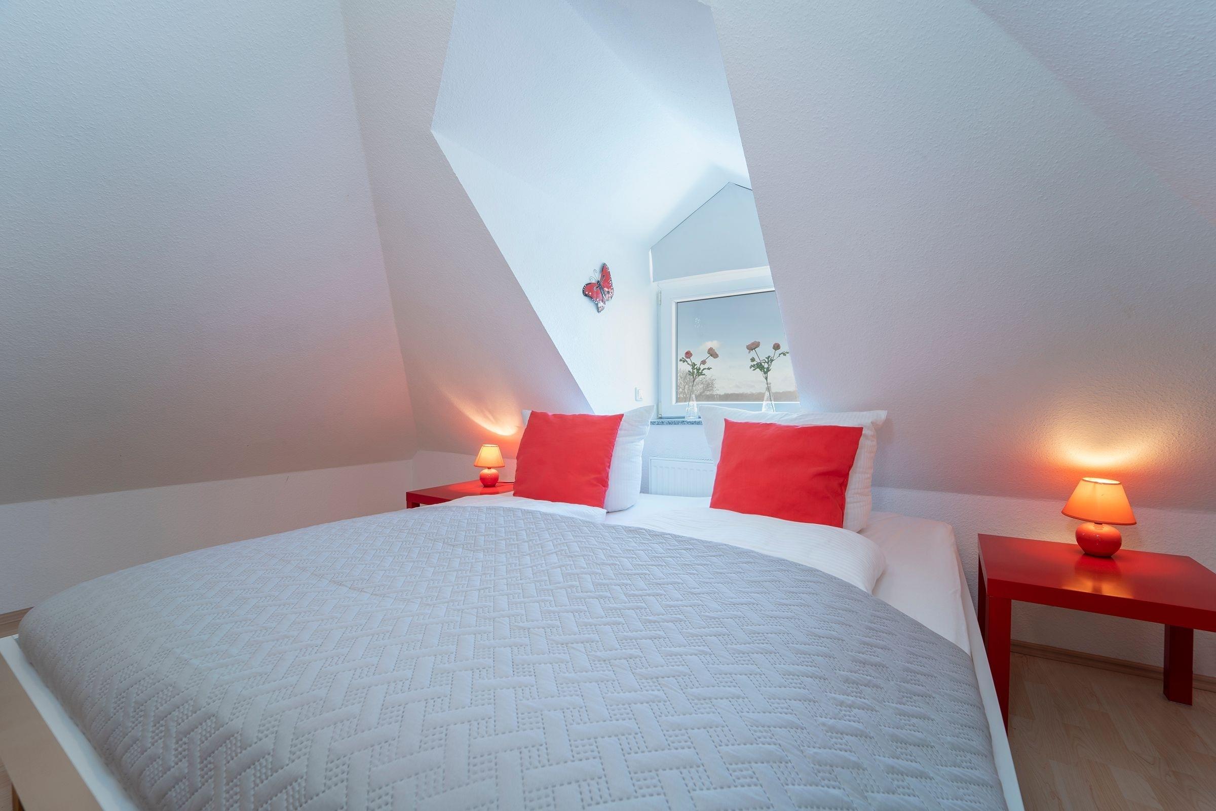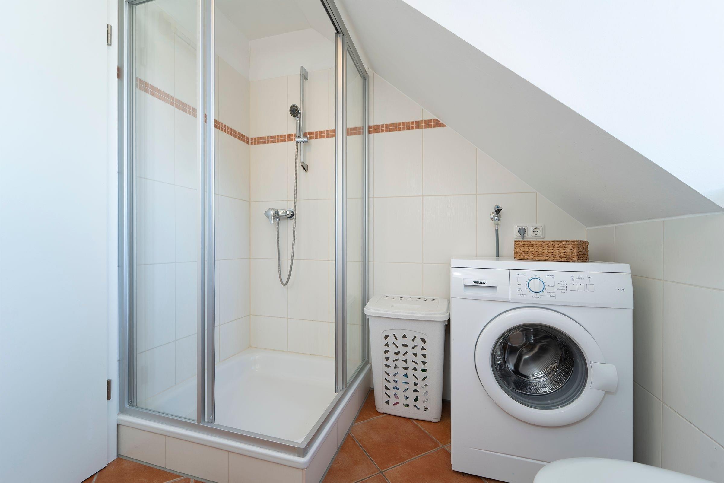 Das Hauptschlafzimmer ist mit einem Doppelbett (2x 90x200 cm) und einem Flachbild-TV ausgestattet, das zweite Schlafzimmer mit einem französischen Bett (140x200 cm). Das helle Duschbad mit WC ist auf der gleichen Ebene und verfügt auch über eine Waschmaschine. In der offenen Galerie (erreichbar über die Rundtreppe im Wohnzimmer) befindet sich ein weiterer Schlafbereich mit 2 getrennt stehenden Betten (je 90x200 cm). Mit einem Kinderbettchen sowie einem Hochstuhl ist in diesem Feriendomizil auch an die kleinen Urlaubsgäste gedacht.